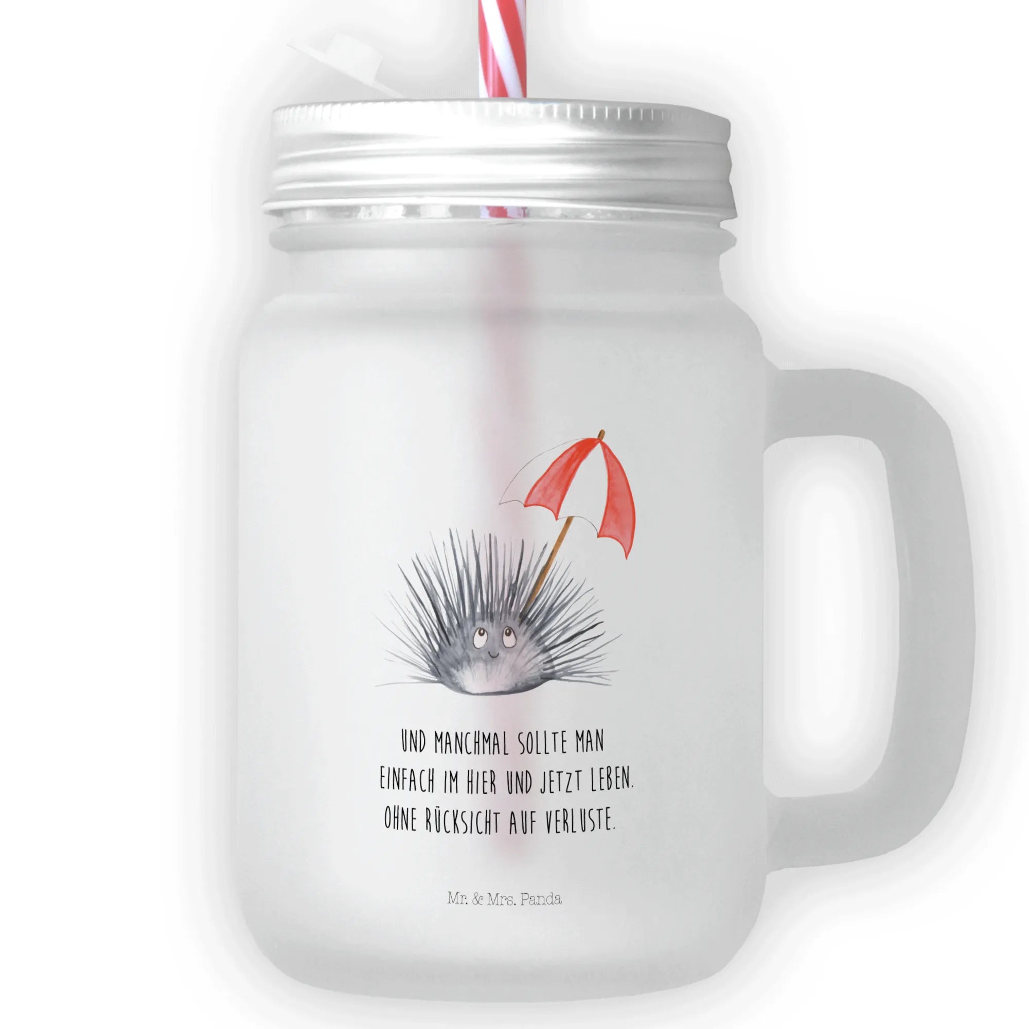 Entdecke das perfekte Trinkglas Mason Jar mit einem bezaubernden Seeigel-Motiv aus der Meerestiere-Kollektion von Mr. & Mrs. Panda! Dieses edle und sommerliche Trinkglas ist nicht nur ein Blickfang, sondern auch äußerst praktisch. Mit einem transparenten, satinierten dickwandigen Premiumglas und einem schützenden silberfarbenen Metalldeckel ist es ideal für all deine Lieblingsgetränke. Egal ob Cocktails, selbstgemachte Limonaden oder erfrischende Eistees – mit diesem Henkelglas bist du bestens gerüstet für jede Sommerparty oder einen entspannten Nachmittag im Garten.