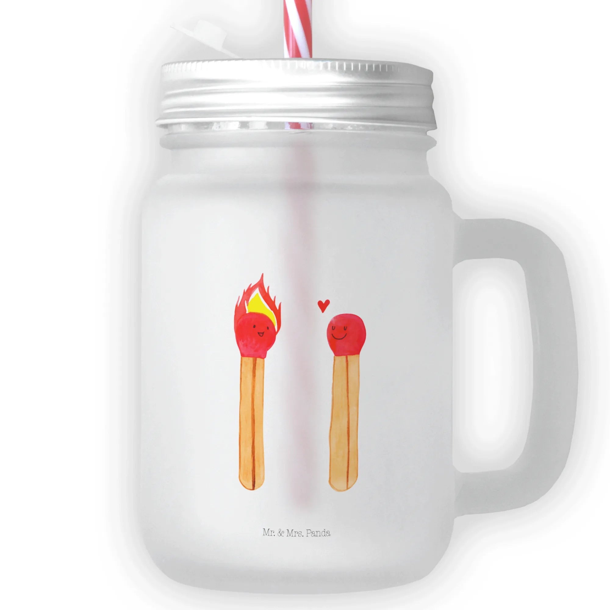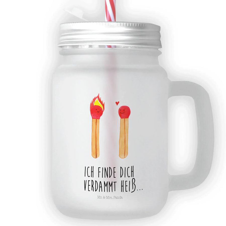Das Trinkglas Mason Jar mit dem liebevollen Motiv der Streichhölzer aus der Liebe Kollektion von Mr. & Mrs. Panda ist das perfekte Geschenk für alle Verliebten und romantischen Seelen! Ob für den Freund, die Freundin oder den Ehepartner, dieses edle, matte Glas begeistert mit seinem charmanten Design und praktischen Eigenschaften. Mit dem Slogan "Ich finde dich verdammt heiß..." ist dieses Glas nicht nur ein tolles Trinkgefäß, sondern auch ein liebevolles Statement für eure Beziehung. Die Darstellung von zwei Streichhölzern, die glücklich miteinander verbunden sind, zaubert ein Lächeln auf jedes Gesicht!