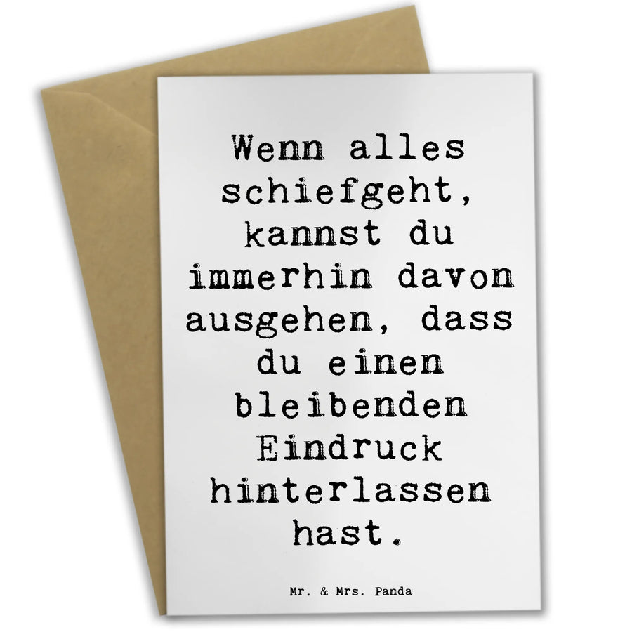 Die Karte hat die Maße 148 mm x 105 mm und ist aus hochwertigem 300 Gramm Karton gefertigt, der nicht nur edel aussieht, sondern auch eine angenehme Haptik bietet. Auf der Vorderseite findest du einen einzigartigen Spruch: 'Wenn alles schiefgeht, kannst du immerhin davon ausgehen, dass du einen bleibenden Eindruck hinterlassen hast.' Dieser motivierende Satz eignet sich hervorragend, um Mut zuzusprechen und positive Gedanken zu verbreiten.