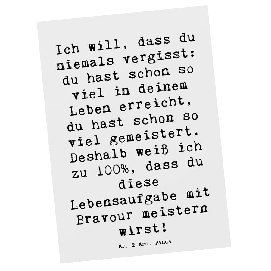 Die entzückende Postkarte Trost aus der besonderen Kollektion Gefühle & Stimmungen von Mr. & Mrs. Panda ist das perfekte Geschenk für jeden, der ein wenig aufmunternde Worte braucht. Diese einzigartige Karte ist nicht nur ein einfacher Gruß, sondern ein liebevoll gestalteter Begleiter für Freunde, Familie oder deine Lieben in schweren Zeiten. Der zauberhafte Spruch "Ich will, dass du niemals vergisst: du hast schon so viel in deinem Leben erreicht, du hast schon so viel gemeistert. Deshalb weiß ich zu 100%, dass du diese Lebensaufgabe mit Bravour meistern wirst!" erinnert uns daran, wie stark und fähig wir sind. Jedes Mal, wenn der Empfänger die Karte in den Händen hält, wird er an diese wertvollen Worte erinnert.