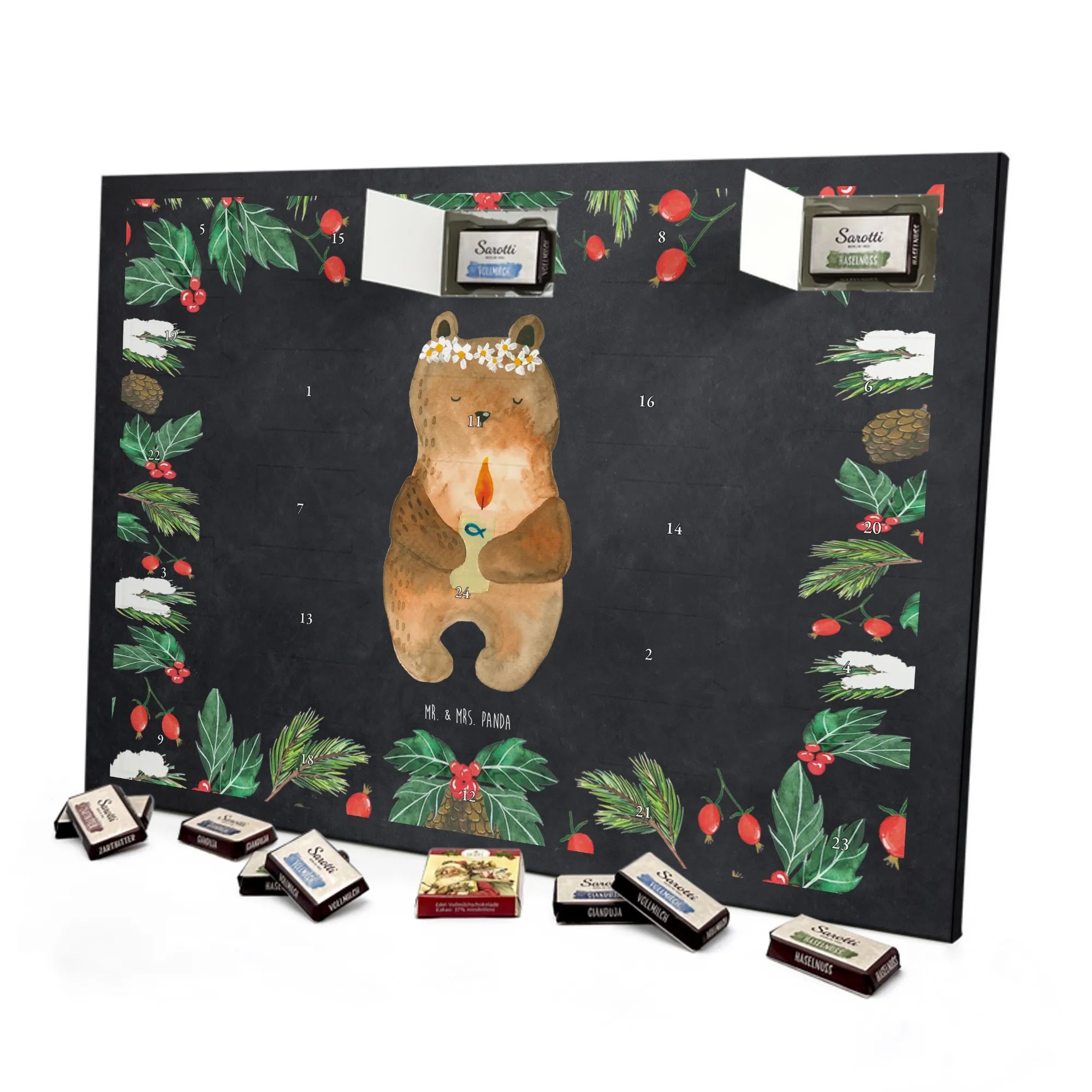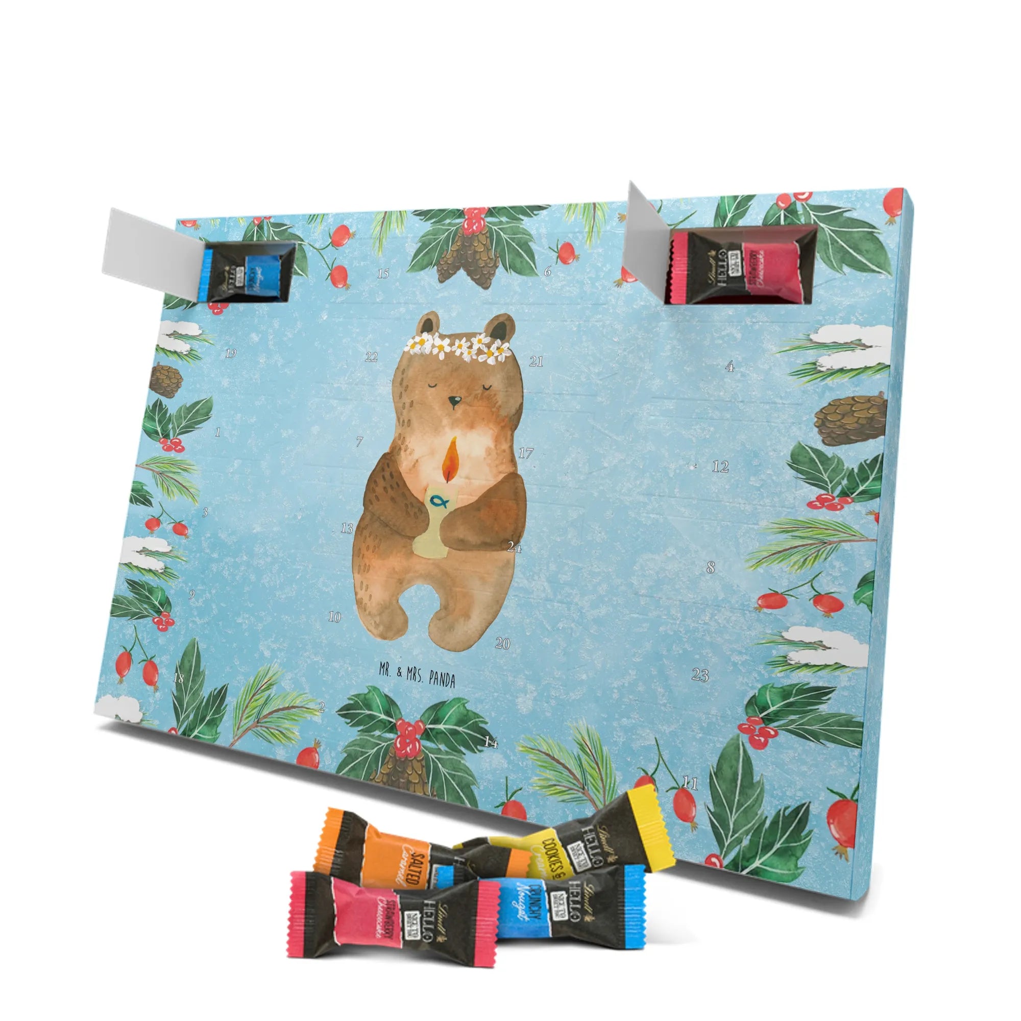 Wunderschöner Adventskalender mit Schokolade von Mr. & Mrs. Panda – für alle, die Advent und Design lieben. Dieser Adventskalender mit Schokolade ist liebevoll bedruckt mit wunderschönen Motiven & Sprüchen von Mr. & Mrs. Panda und ist nicht personalisierbar, aber mit viel Liebe zum Detail gefertigt. Brillante Druckqualität mit seidenmatter Oberflächenveredelung sorgt für einen edlen Look, und die bedruckten Seitenflächen geben dem Kalender eine besondere Optik. Maße: 233 mm x 178 mm x 24 mm. Dank seiner stabilen Verarbeitung kannst du ihn aufstellen oder ganz einfach aufhängen – Besonderheit: kann aufgehängt oder aufgestellt werden. Gefüllt mit MARKENNAMEN Schokolade und leckeren Schokoladenkugeln, bringt er jeden Tag ein kleines Glückserlebnis. Wichtige Hinweise: (Kann Spuren von Haselnüssen, Mandeln, Gluten und Soja enthalten!), bitte kühl und trocken lagern. Ob als Geschenk, Mitbringsel oder Adventsdeko – dieser Kalender zaubert ein Lächeln und sorgt für gemütliche Vorfreude. Viel Freude beim Entdecken der süßen Überraschungen wünscht dir Mr. & Mrs. Panda!