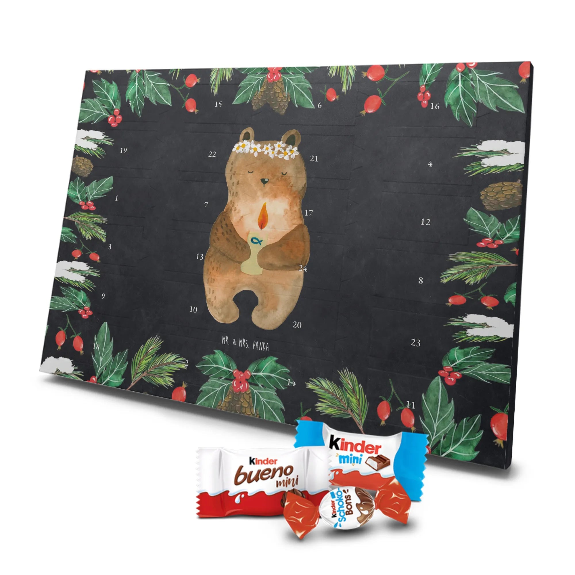 Unser Schokoladen Adventskalender von Mr. & Mrs. Panda bringt Charme und süße Überraschungen in deine Adventszeit. Liebevoll bedruckt mit wunderschönen Motiven & Sprüchen von Mr. & Mrs. Panda, ist dieser Kalender nicht personalisierbar, dafür aber mit hochwertiger Verarbeitung und stimmigem Design. Die brillante Druckqualität mit seidenmatter Oberflächenveredelung verleiht jedem Motiv eine edle Optik, und die bedruckten Seitenflächen runden das Gesamtbild ab. Maße: 355 mm x 245 mm x 11 mm. Eine praktische Besonderheit: kann aufgehängt oder aufgestellt werden – so passt er perfekt in jede Deko. Gefüllt mit Markenname Schokolade: Adventskalender gefüllt mit kinder® Schokolade. Inhalt: kinder® Schoko-Bons, kinder® Bueno mini und kinder® Schokolade mini. Mit 24 kleinen Leckereien hinter den Türchen ist dieser Kalender ideal für Kinder und alle Naschkatzen. Er eignet sich wunderbar als Adventsgeschenk oder als liebevolle Aufmerksamkeit für Kollegen und Freunde. Gönn dir oder anderen eine süße Adventszeit mit diesem bezaubernden Schokoladen Adventskalender!