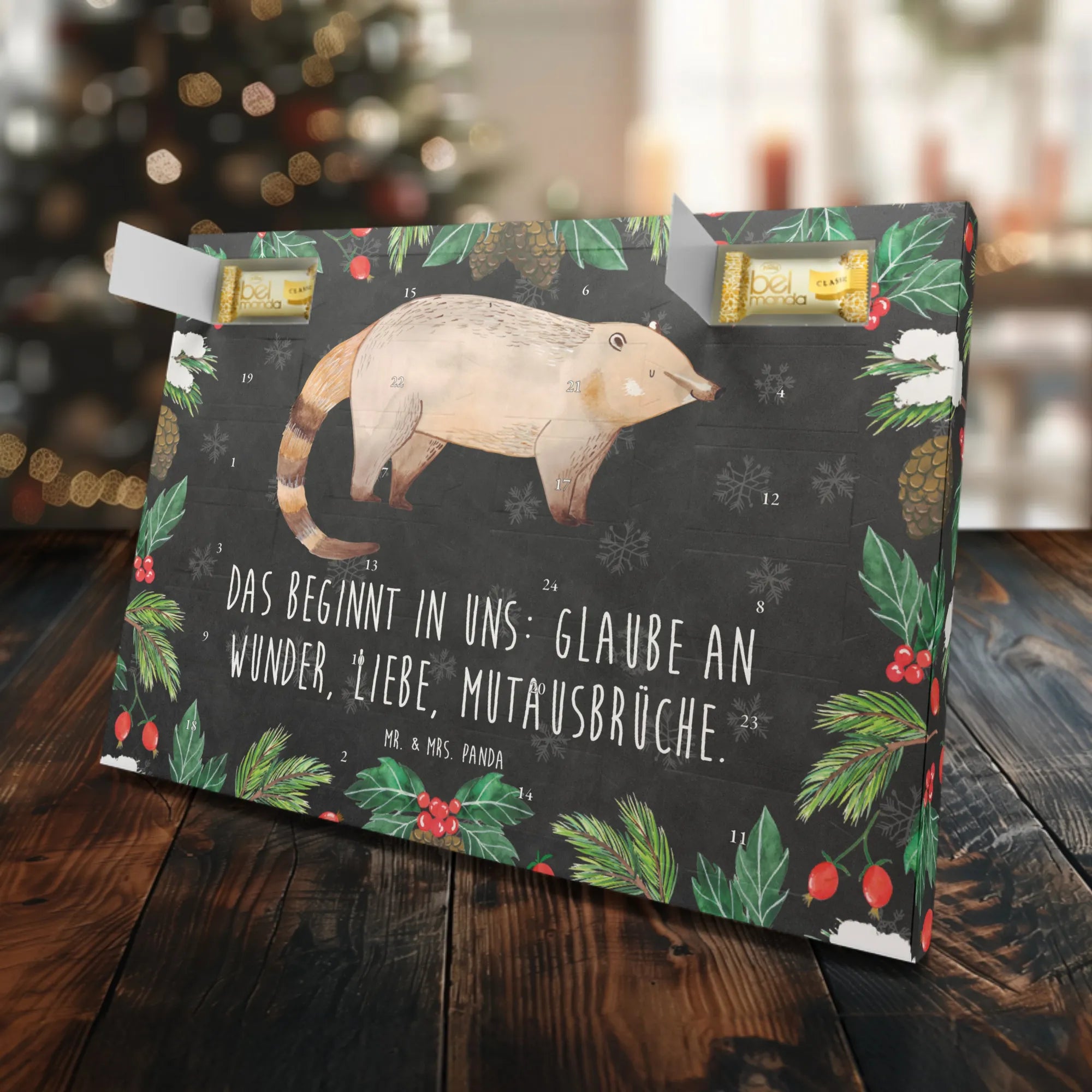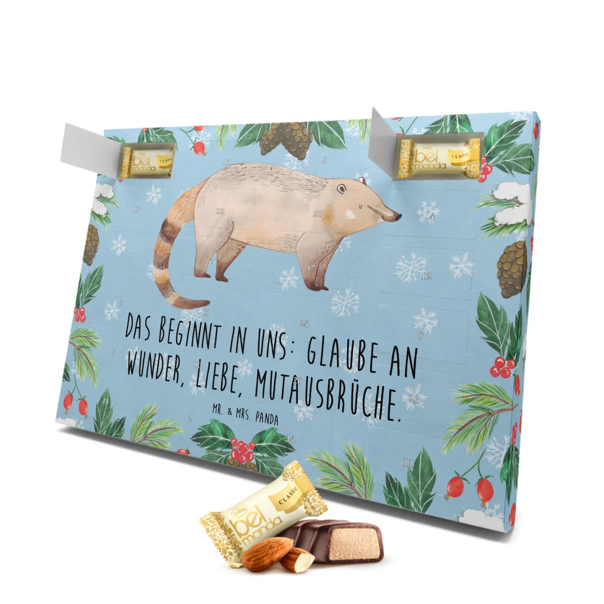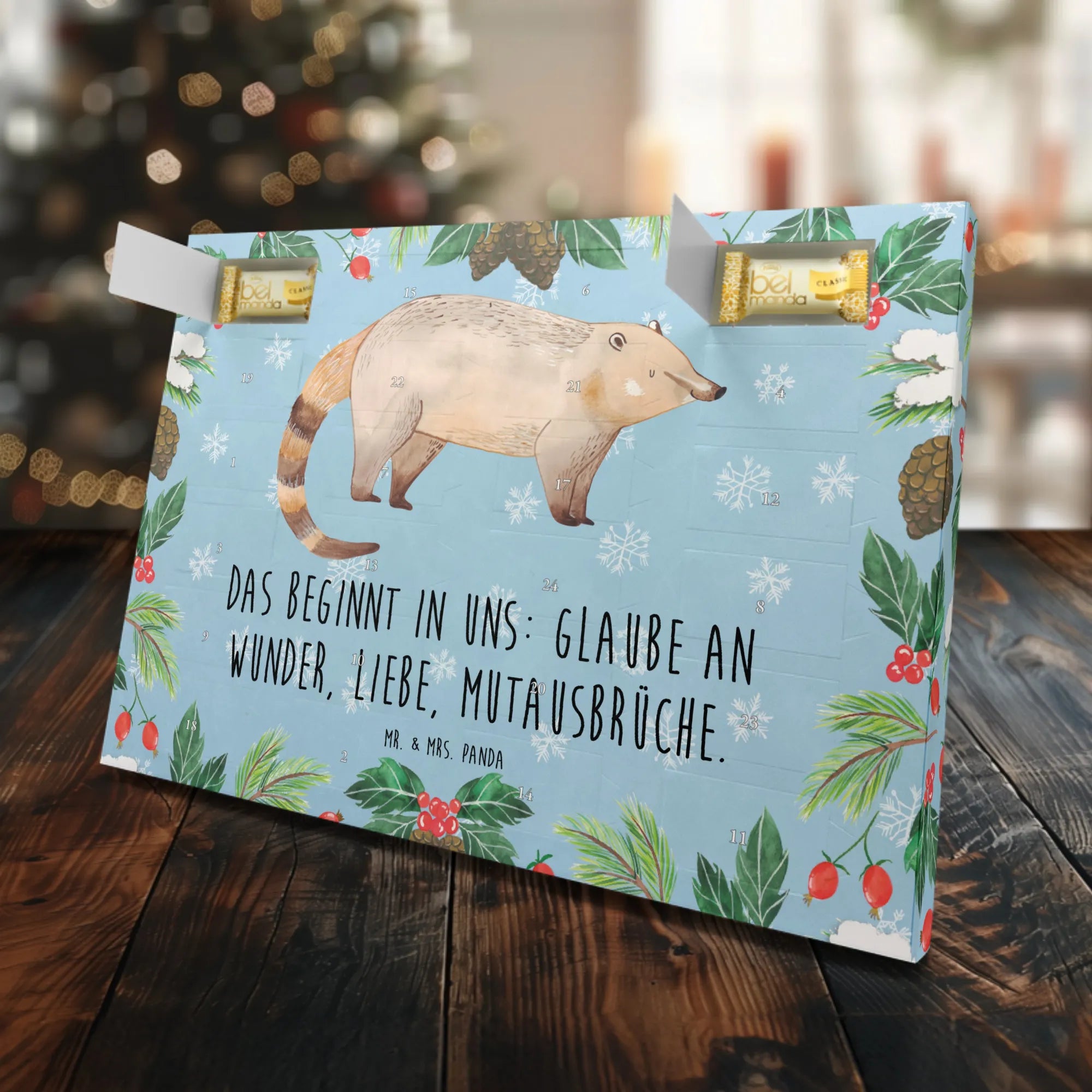 Der Nasenbär ist nicht nur ein lustiger Begriff, sondern auch ein ganz niedliches Tierchen mit großen Augen und einem flauschigen Schwanz, das jedem ein Lächeln ins Gesicht zaubert. Mit dem Slogan "Das beginnt in uns: Glaube an Wunder, Liebe, Mutausbrüche" wird jeder Tag im Advent zu etwas Besonderem.