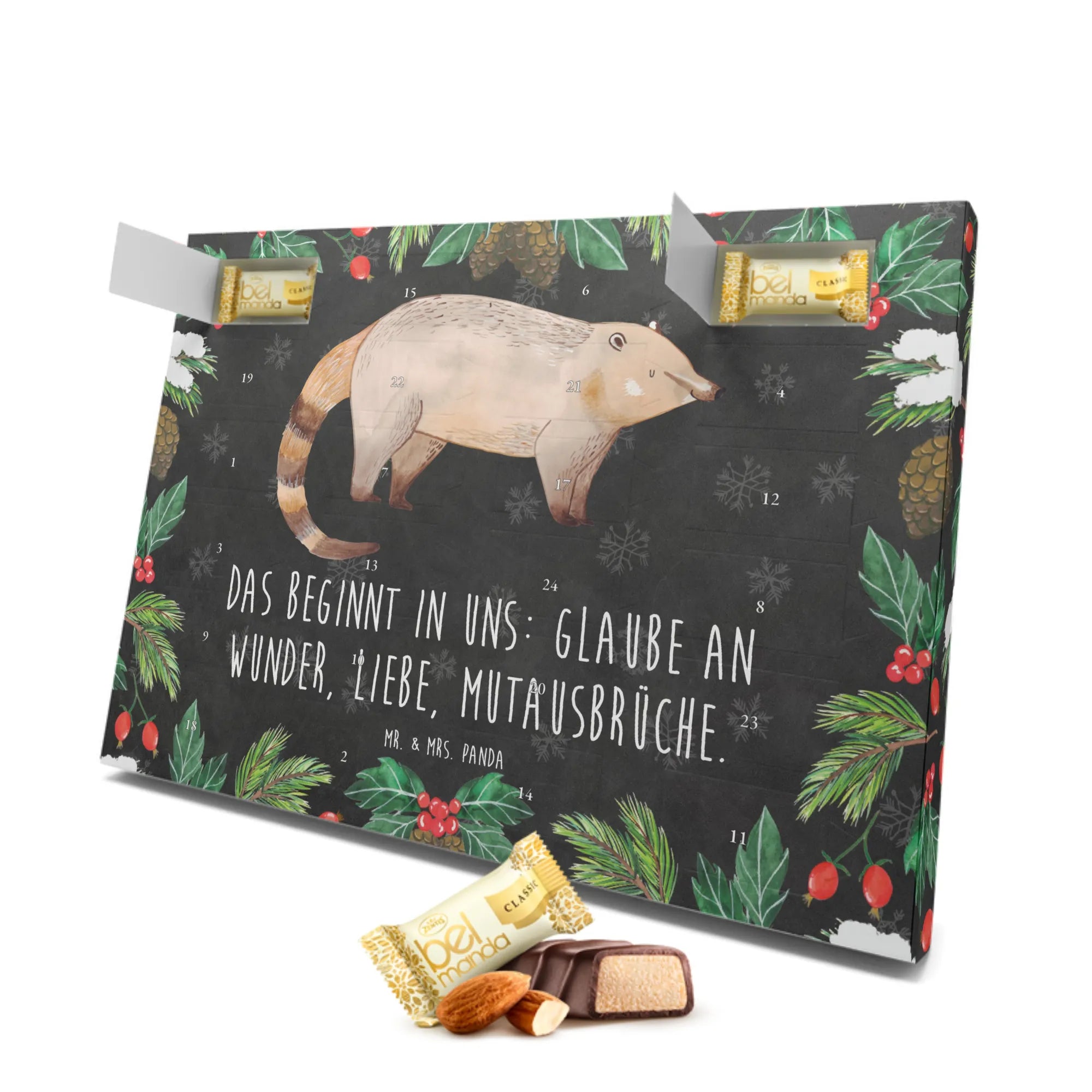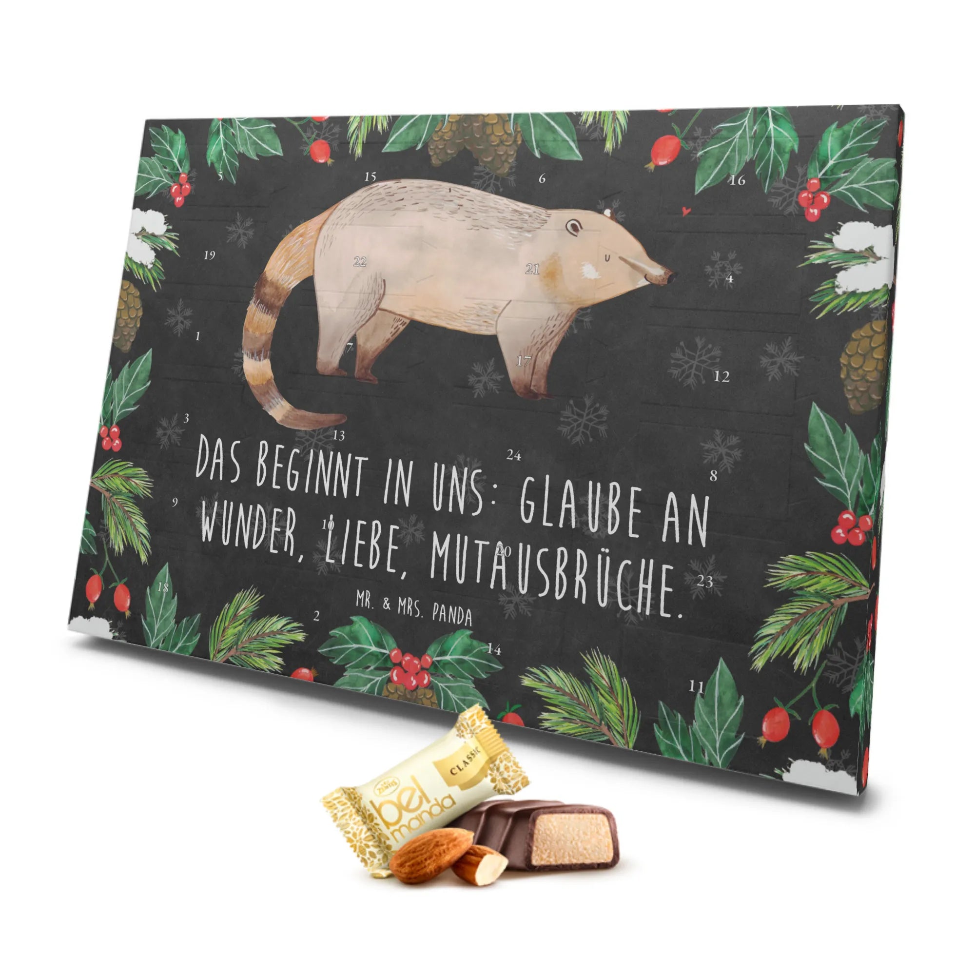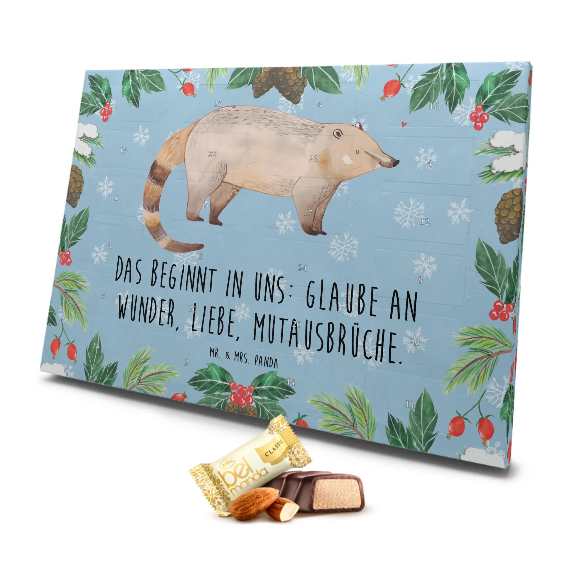 Der Nasenbär ist nicht nur ein lustiger Begriff, sondern auch ein ganz niedliches Tierchen mit großen Augen und einem flauschigen Schwanz, das jedem ein Lächeln ins Gesicht zaubert. Mit dem Slogan "Das beginnt in uns: Glaube an Wunder, Liebe, Mutausbrüche" wird jeder Tag im Advent zu etwas Besonderem.