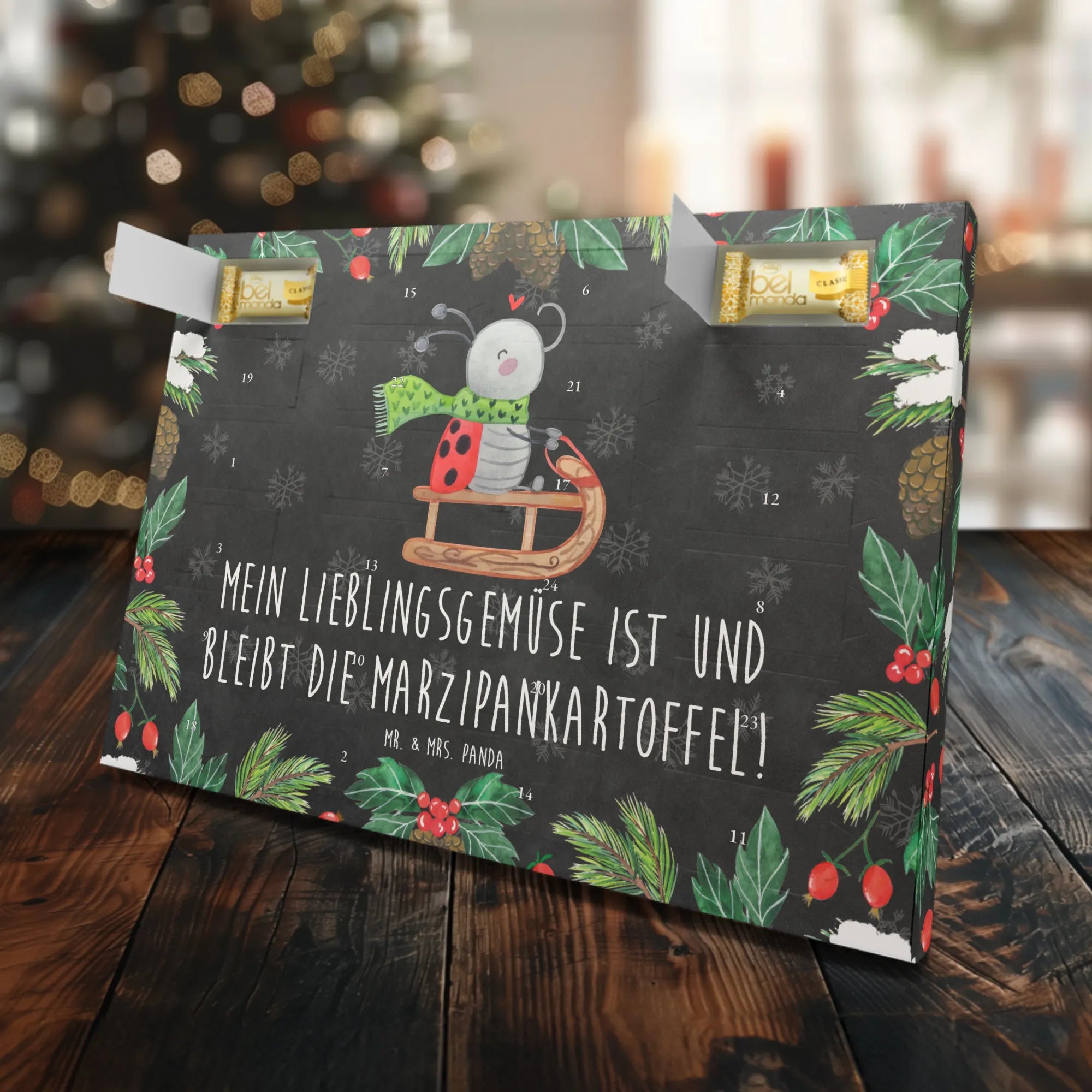 Der Marzipan Adventskalender "Smörle Rodeln" aus der Winter Kollektion von Mr. & Mrs. Panda ist das perfekte Geschenk für alle, die die besinnliche Zeit des Jahres genießen möchten. Mit seinem zauberhaften Motiv, das unseren kleinen, fröhlichen Marienkäfer Smörle zeigt, der voller Freude auf seinem Schlitten durch eine wunderschöne Winterlandschaft fährt, bringt dieser Adventskalender nicht nur weihnachtlichen Spaß, sondern auch eine köstliche Überraschung in jedem Türchen! Mit 24 einzeln verpackten Edelmarzipan Pralinés verwöhnt er deine Sinne und macht das Warten auf Weihnachten besonders süß.