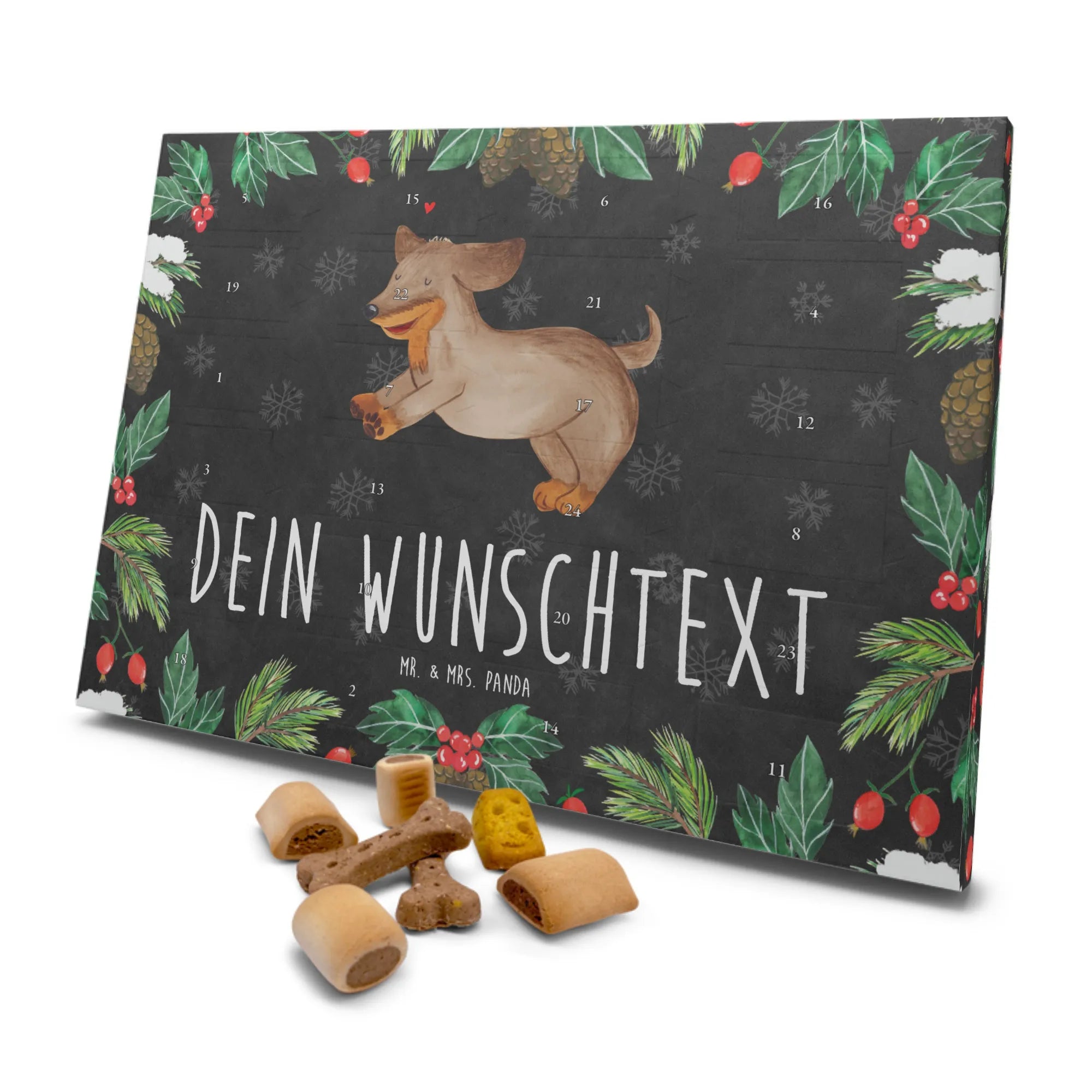 Adventskalender für Hunde personalisiert – entdecke den besonderen Kalender von Mr. & Mrs. Panda, der jeden Tag im Dezember zu einem kleinen Fest für deinen Hund macht. Mit liebevollen Illustrationen und witzigen Sprüchen bedruckt, kannst du den Kalender mit deinem Wunschtext oder Namen versehen. Die hochwertige, seidenmatte Oberflächenveredelung und der brillante Druck sorgen für satte Farben, die auch auf den bedruckten Seitenflächen durchscheinen. Befüllt ist der Kalender mit 24 Premium-Hundekuchen in vier Variationen: Beef Cake Mix, Mini Knabberknochen, Käse Snack und Panino Röllchen. Alle Leckereien sind luftig gebacken und aus sorgfältig ausgewählten Zutaten gemacht: Getreide, Glucose, Fleisch und tierische Nebenerzeugnisse, Öle und Fette, Mineralstoffe. Maße: 325 mm x 225 mm x 27 mm. Der Kalender lässt sich sowohl aufstellen als auch aufhängen – ideal für jede Ecke im Zuhause. Hinweis: Ohne Konservierungsstoffe. Verschenke Vorfreude und viele glückliche Schwänzchenwedler mit diesem individuell gestalteten Adventskalender.