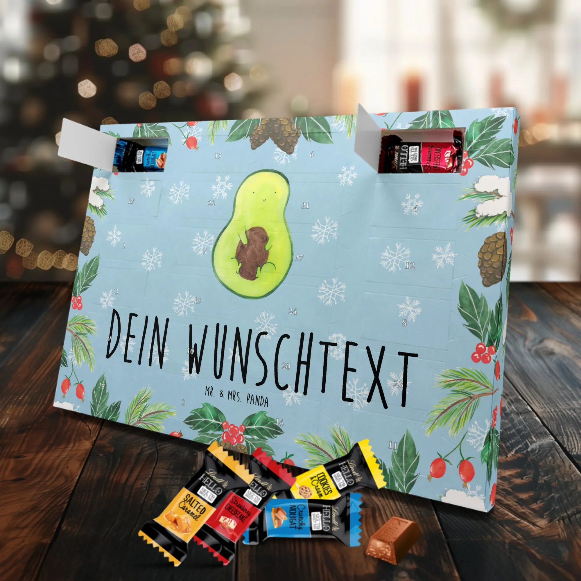 Unser Personalisierter Schoko-Adventskalender von Mr. & Mrs. Panda bringt Freude ins Adventsfenster und zaubert jedem ein Lächeln aufs Gesicht. Du gestaltest ihn ganz individuell: wähle deinen Wunschtext oder Namen und wir drucken ihn auf den Kalender – inklusive bedruckter Seitenflächen für ein rundum schönes Ergebnis. Die seidenmatte Oberflächenveredelung sorgt für eine elegante Haptik, während die brillante Druckqualität die Motive zum Strahlen bringt. Der Kalender ist flexibel einsetzbar, denn er kann aufgehängt oder einfach aufgestellt werden. Gefüllt mit Lindt Hello: 24 einzelne Schokoladen Mini Sticks in vier leckeren Geschmacksrichtungen (Karamell-Schokoladenkuchen, Kekse, Knuspriger Nougat, Erdbeer-Cheesecake). Zutaten und Allergene (Milcheiweiß, Milchzucker, Soja, Weizen, Haselnüsse; kann Mandeln und andere Schalenfrüchte enthalten) sind ausgewiesen. Ideal als persönliches Geschenk für Familienmitglieder, Freundinnen oder für dich selbst – mit viel Liebe gestaltet von Mr. & Mrs. Panda. Maße: 325 mm x 225 mm x 27 mm, praktische Größe für Regal oder Wand.