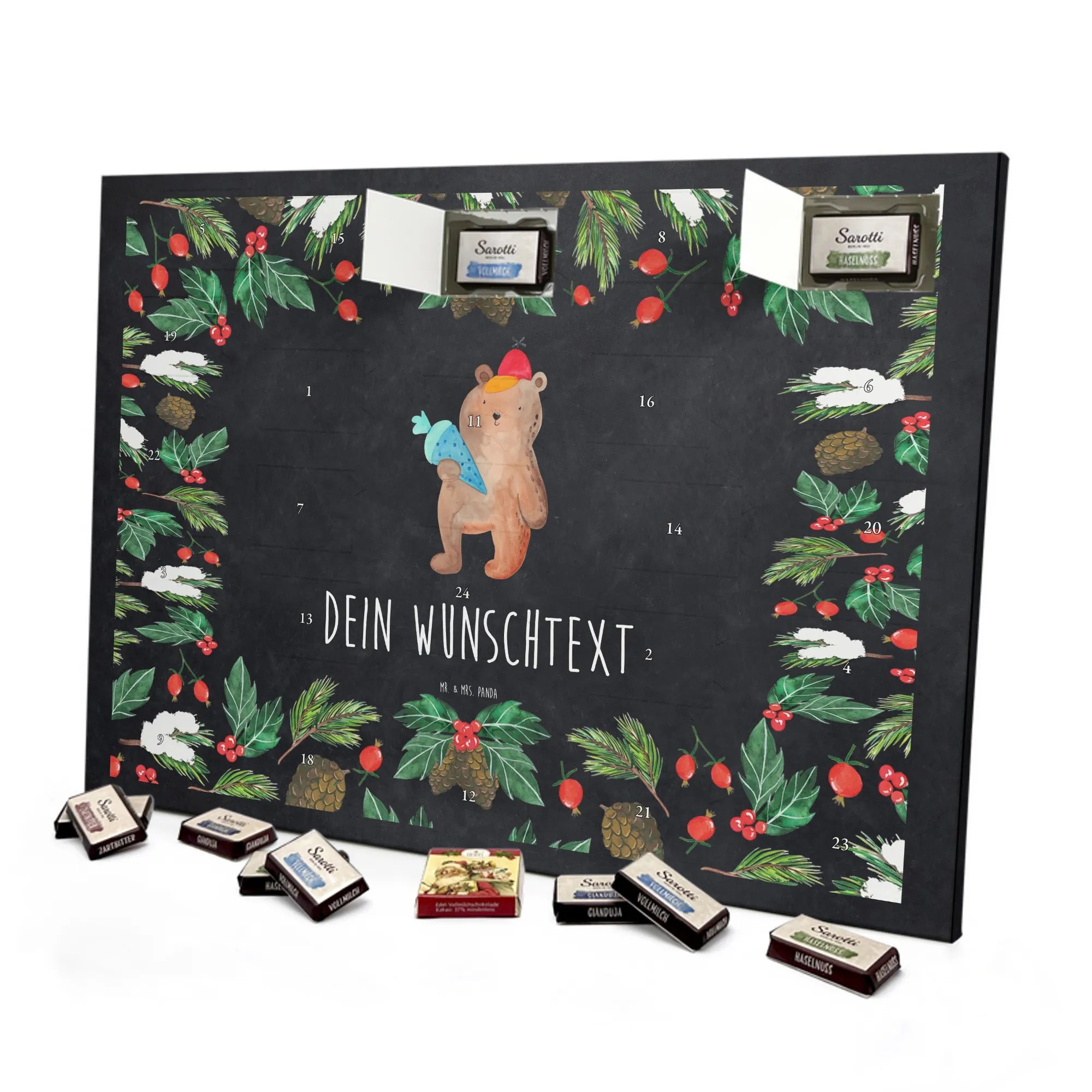 Wunderschöner Personalisierter Schoko Adventskalender von Mr. & Mrs. Panda – dein perfekter Begleiter durch die Vorweihnachtszeit! Dieser Adventskalender ist liebevoll bedruckt mit zauberhaften Motiven und witzigen Sprüchen von Mr. & Mrs. Panda und lässt sich ganz individuell mit deinem Wunschnamen oder Wunschtext personalisieren. Die brillante Druckqualität und die seidenmatte Oberflächenveredelung sorgen dafür, dass die Farben schön leuchten und sich der Kalender edel anfühlt. Auch die Seitenflächen sind bedruckt, sodass er von allen Seiten ein Hingucker ist. Maße: 355 mm x 245 mm x 11 mm. Eine besondere Eigenschaft: Du kannst ihn bequem aufhängen oder aufstellen – je nachdem, wie du ihn präsentieren möchtest. Gefüllt ist der Kalender mit einer hochwertigen Füllung aus 24 einzeln verpackten Schokoladentäfelchen in vier köstlichen Geschmacksrichtungen. Insgesamt enthält er 107 g Markenschokolade von Sarotti® und Confiserie Heidel® in den Sorten Vollmilch, Nougat, Zartbitter und Haselnuss. Bitte beachte: Es handelt sich um einen Kalender gefüllt mit Sarotti® und Confiserie Heidel® Markenschokolade. Verschenke Freude, Individualität und süße Momente – ideal als Geschenk für Freunde, Familie oder dich selbst. Mit diesem persönlichen Adventskalender machst du jeden Tag im Dezember zu einem kleinen Fest.