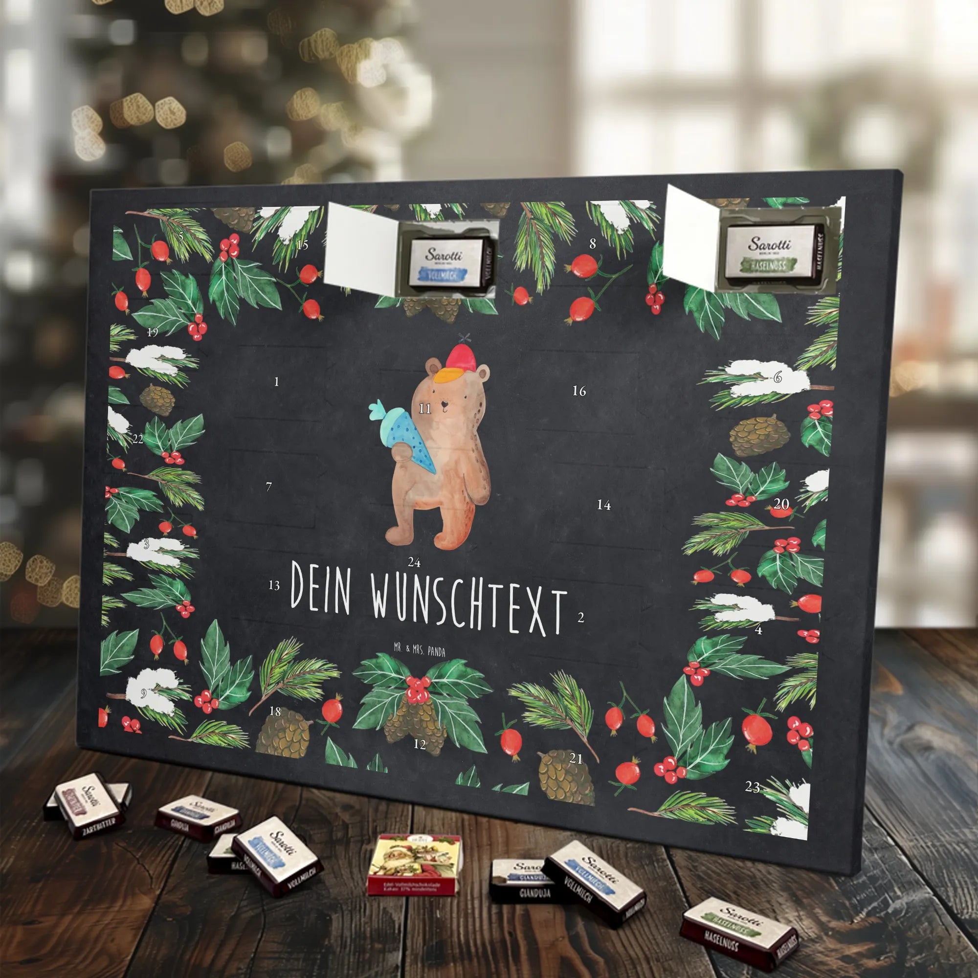 Personalisierter Schoko-Adventskalender von Mr. & Mrs. Panda – liebevoll gestaltet und ideal als individuelles Geschenk in der Adventszeit. Wir bedrucken den Kalender mit zauberhaften Motiven & herzlichen Sprüchen und personalisieren ihn mit deinem Wunschnamen oder Wunschtext. Die hochwertige Druckqualität kombiniert mit einer seidenmatten Oberflächenveredelung sorgt für ein edles Erscheinungsbild, und die bedruckten Seitenflächen geben dem Motiv zusätzlichen Charme. Der Kalender kann aufgehängt oder aufgestellt werden, sodass du ihn flexibel platzieren kannst. Gefüllt ist der Kalender mit Celebrations, die 24 hochwertige Überraschungen in 8 verschiedenen Sorten beinhalten: Maltesers, Mars, Snickers, Twix, Milky Way, Bounty, Galaxy und Galaxy Caramel. Maße: 325 mm x 225 mm x 27 mm – handlich und doch großzügig für die kleinen Leckereien hinter den Türchen. Ob für Kinder, Partner oder beste Freunde: dieser personalisierte Schoko-Adventskalender macht das Warten auf Weihnachten bunter und leckerer. Verschenke eine persönliche Erinnerung und jeden Tag ein kleines Schokoladen-Glück!