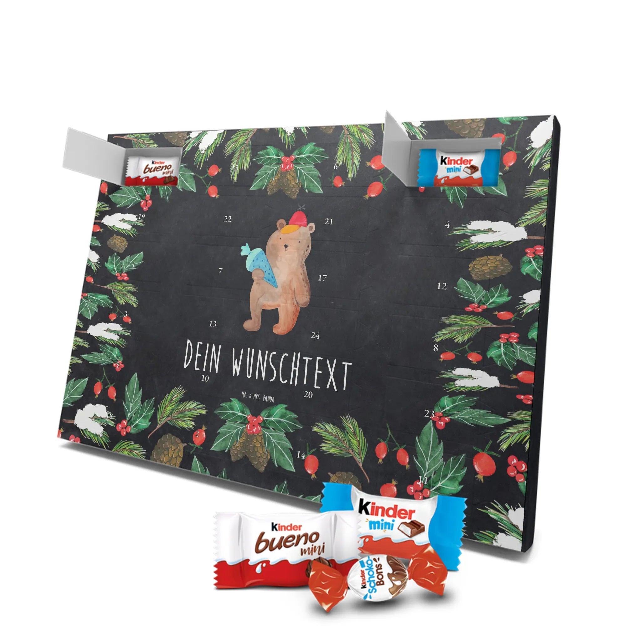 Feier die Vorfreude mit einem persönlichen Hingucker: unser Personalisierter Schoko Adventskalender von Mr. & Mrs. Panda. Dieser Kalender ist liebevoll mit wunderschönen Motiven & Sprüchen bedruckt und kann mit deinem Wunschnamen oder Wunschtext individualisiert werden – perfekt für eine persönliche Überraschung jeden Adventstag. Die brillante Druckqualität und die seidenmatte Oberflächenveredelung geben dem Kalender einen edlen Look, und die bedruckten Seitenflächen machen ihn rundum dekorativ. Besonders praktisch: der Kalender kann aufgehängt oder aufgestellt werden, je nachdem, wie du ihn präsentieren möchtest. Maße: 355 mm x 245 mm x 11 mm – ein ideales Format für dekorative Platzierung und genügend Raum für leckere Türchenüberraschungen. Gefüllt mit kinder® Schokolade: Adventskalender gefüllt mit kinder® Schokolade; Inhalt: kinder® Schoko-Bons, kinder® Bueno mini und kinder® Schokolade mini. Ob als Geschenk für Kinder, Partner oder beste Freunde – mit Mr. & Mrs. Panda verschenkst du nicht nur Süßes, sondern echte Vorfreude und liebevolle Gestaltung.