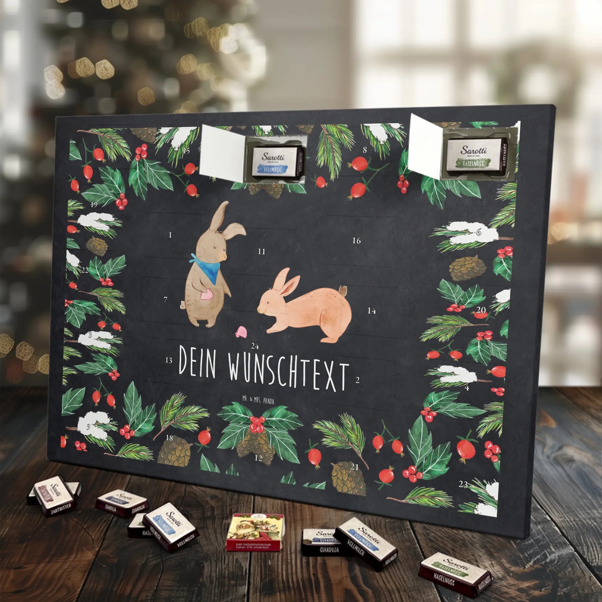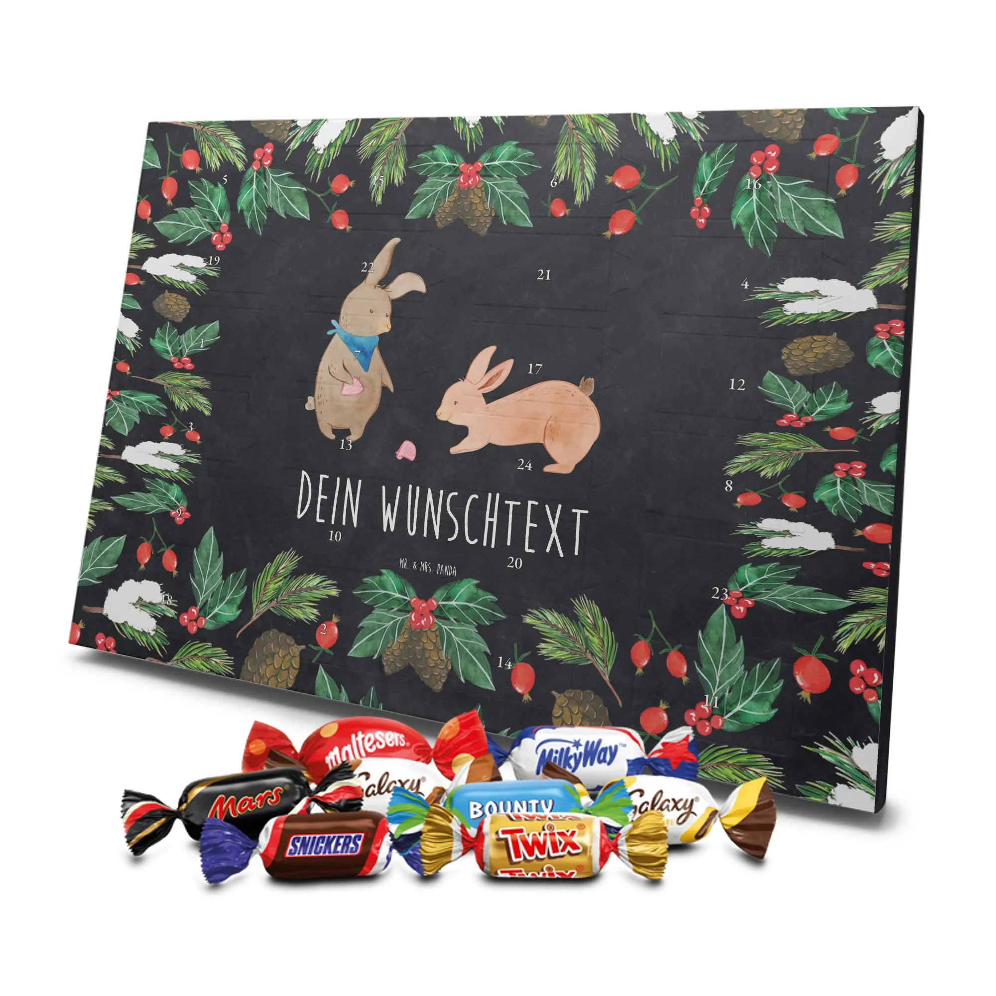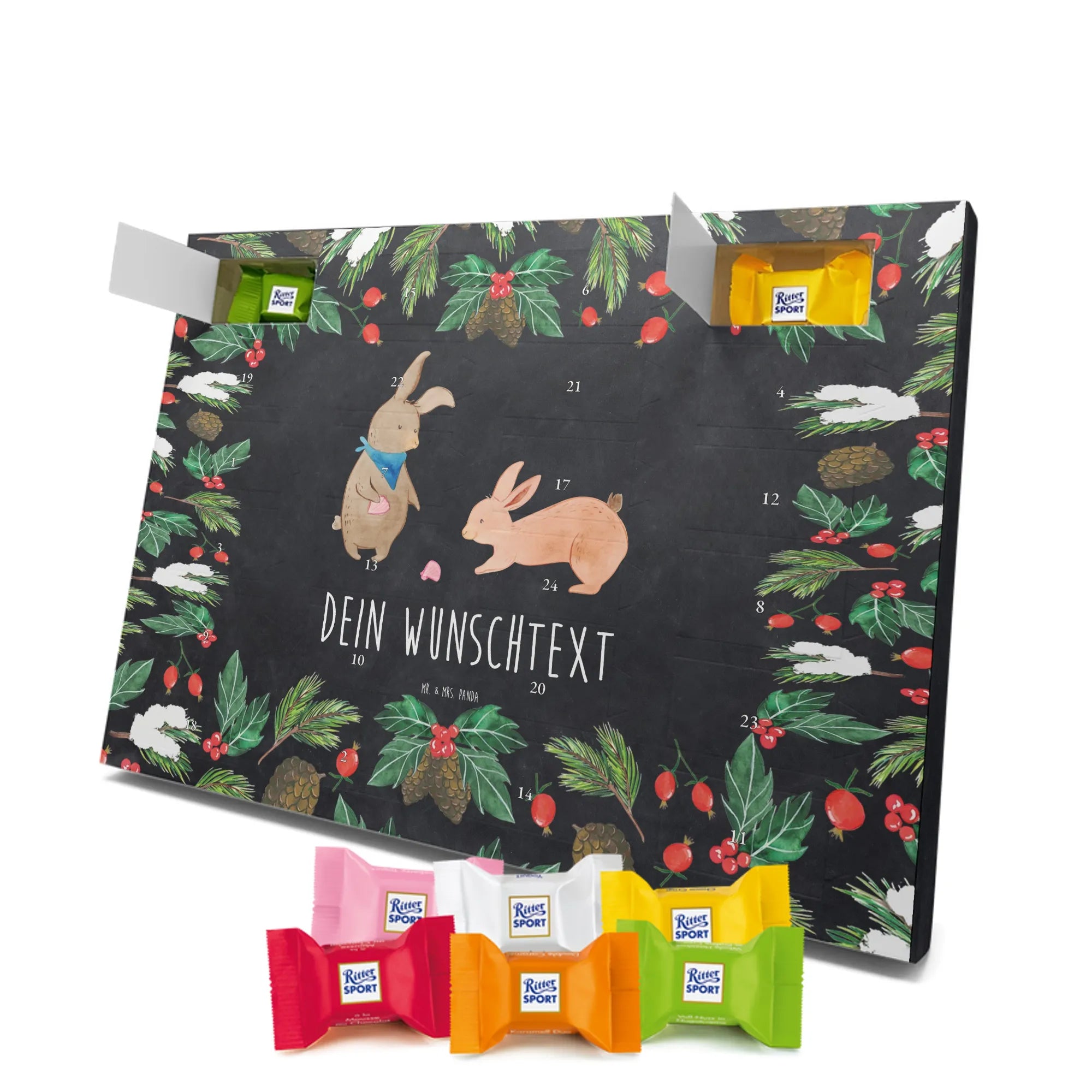 🐼 PERSONALISIERTER SCHOKO-ADVENTSKALENDER: Mit Wunschtext, bedruckt mit Mr. & Mrs. Panda Motiven, gefüllt mit MARKENNAMEN Schokolade.