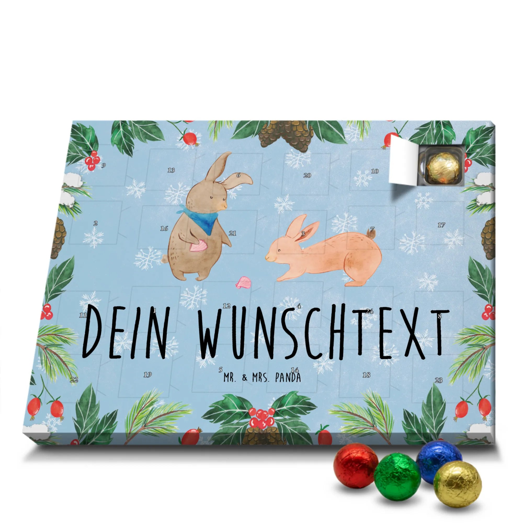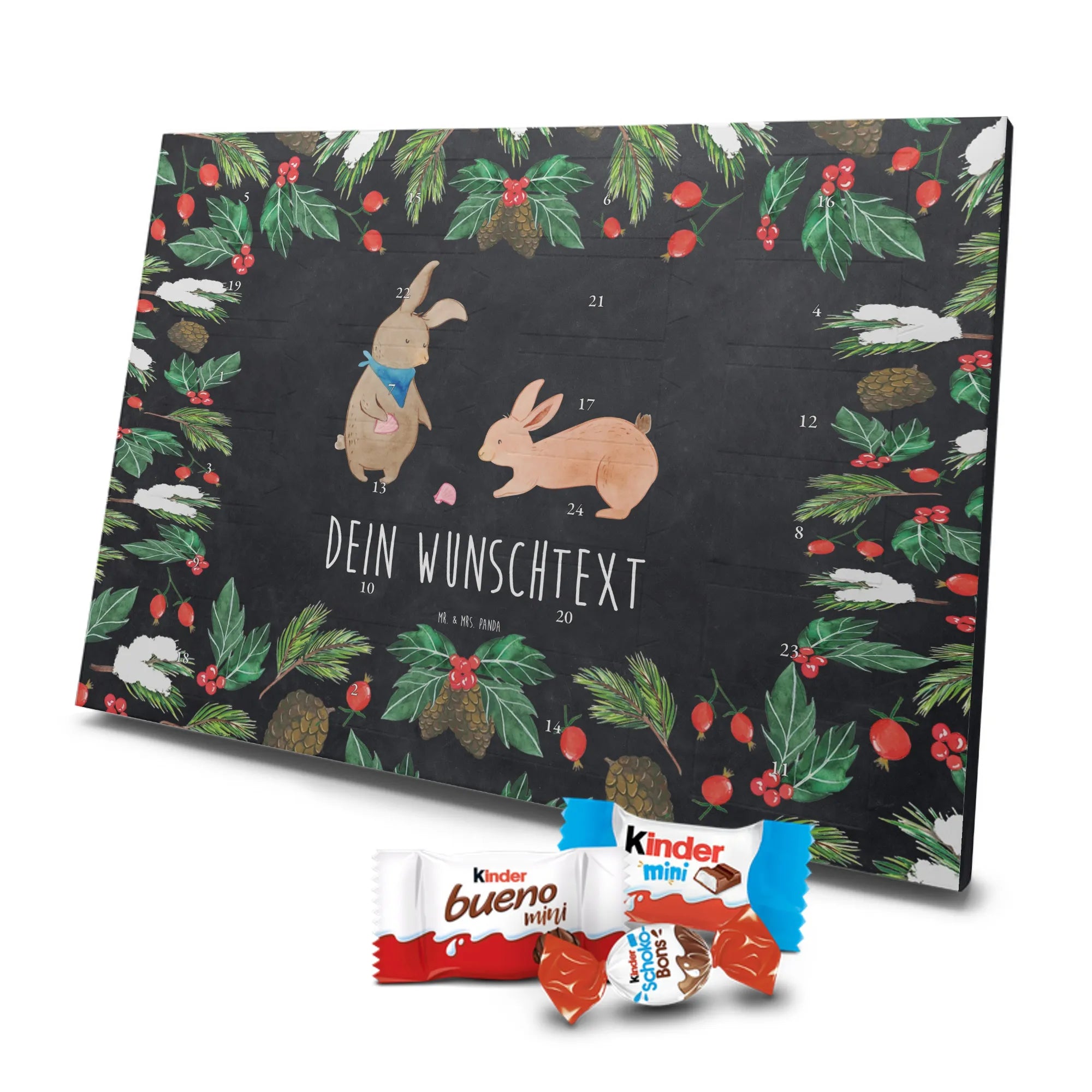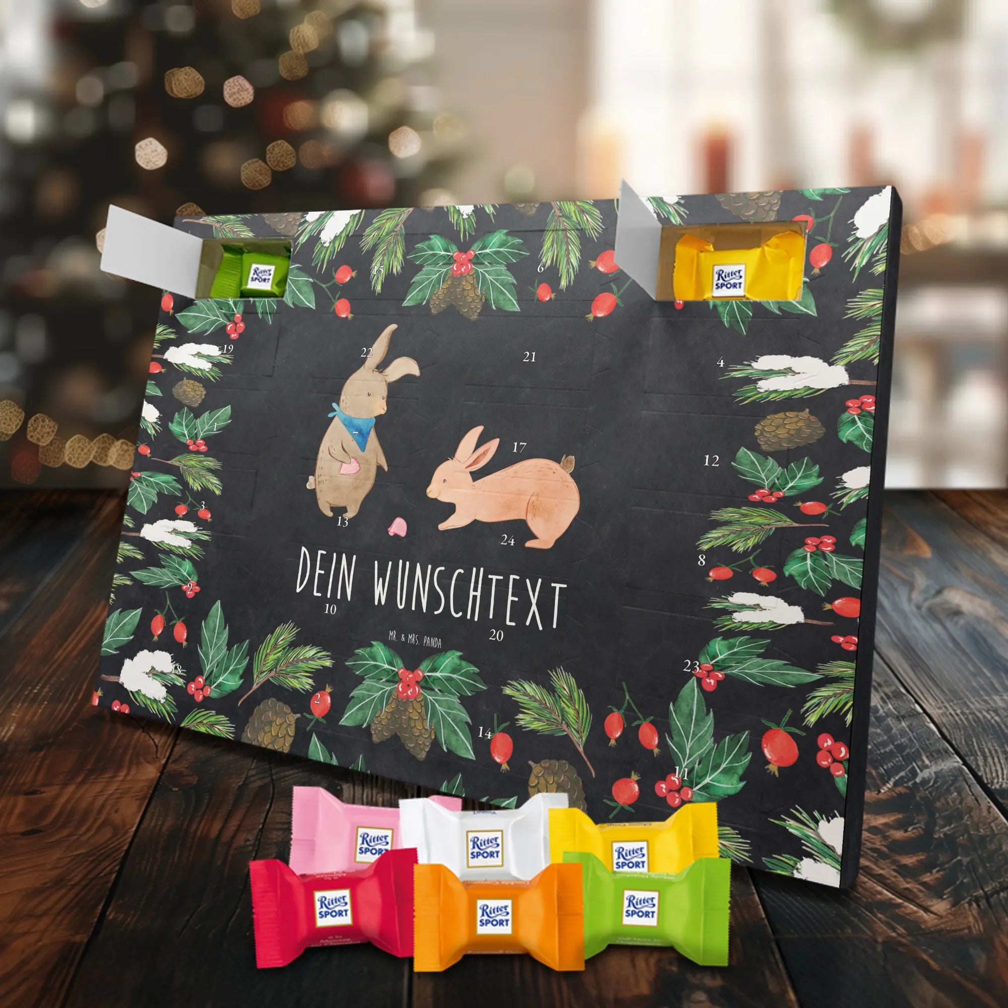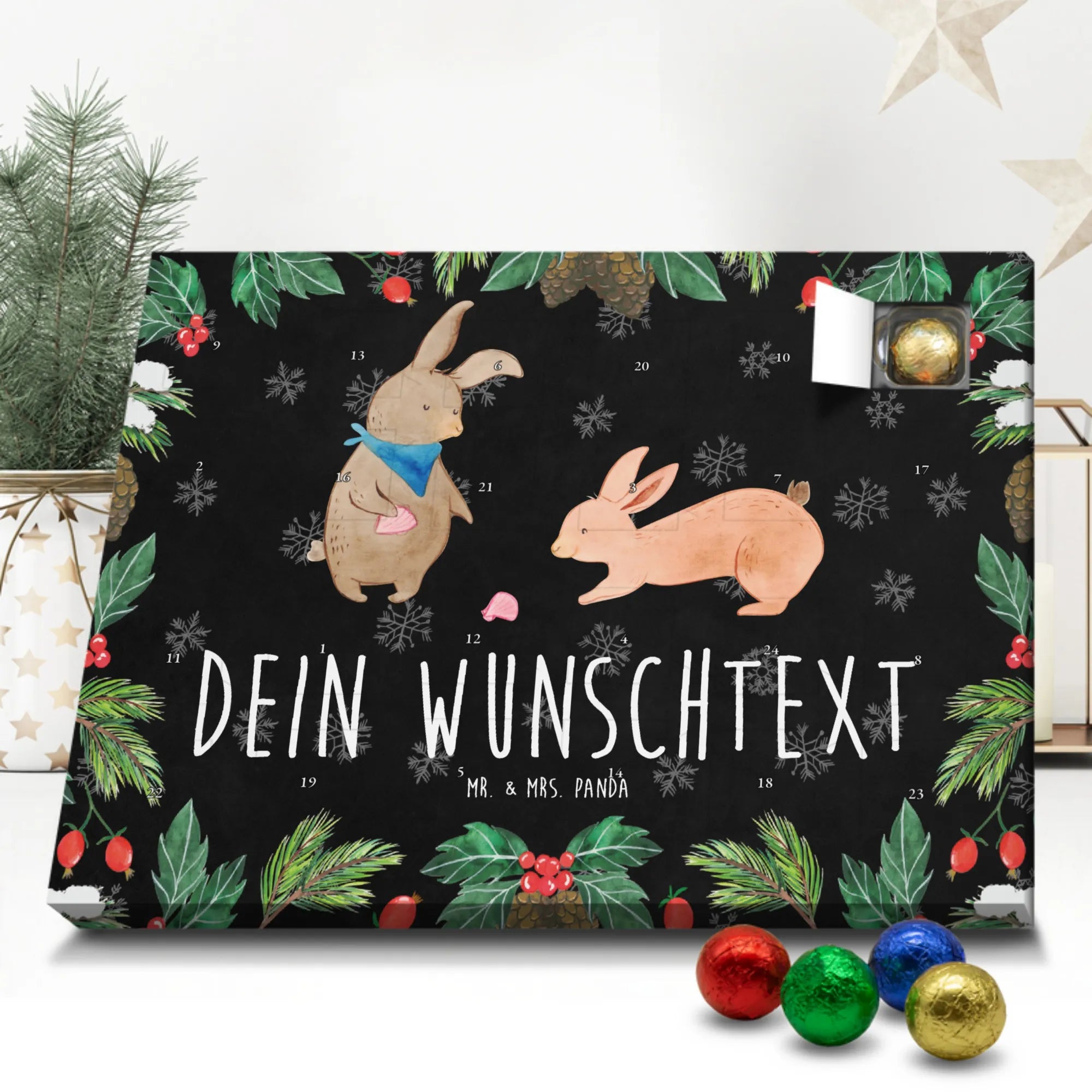 🐼 PERSONALISIERTER SCHOKO-ADVENTSKALENDER: Mit Wunschtext, bedruckt mit Mr. & Mrs. Panda Motiven, gefüllt mit MARKENNAMEN Schokolade.