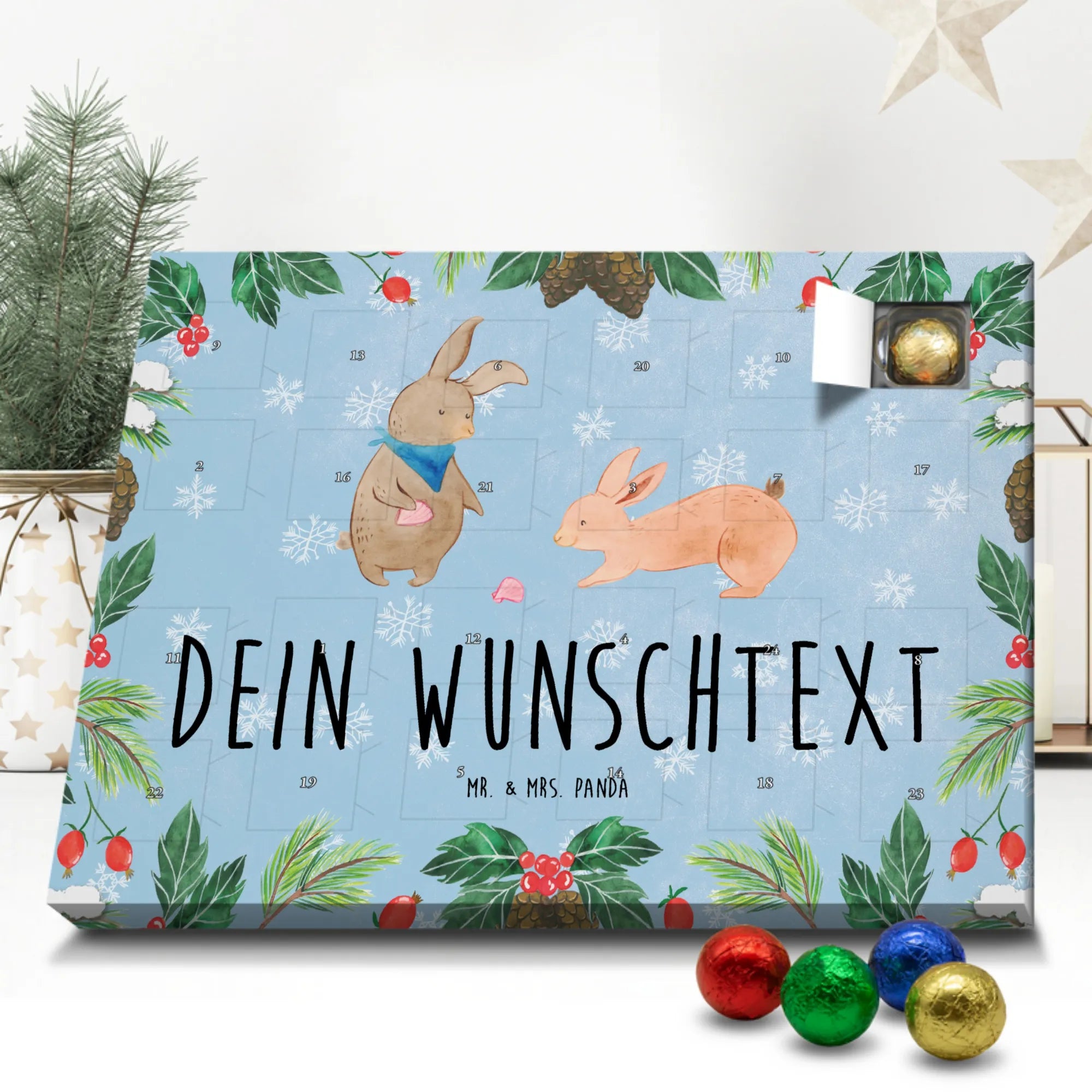 Mach die Adventszeit persönlich mit unserem Personalisierter Adventskalender mit Schokolade von Mr. & Mrs. Panda. Jeder Kalender ist liebevoll illustriert und bedruckt mit charmanten Sprüchen und Motiven – perfekt als Geschenk oder Deko für dein Zuhause. Du kannst deinen Wunschname oder einen kurzen Text hinzufügen, damit der Kalender ganz individuell wird. Die brillante Druckqualität und die seidenmatte Oberflächenveredelung sorgen für eine edle Optik, und auch die Seitenflächen sind komplett bedruckt. Maße: 233 mm x 178 mm x 24 mm. Die clevere Konstruktion erlaubt es, den Kalender aufzuhängen oder aufzustellen – flexibel und dekorativ zugleich. Gefüllt mit MARKENNAMEN Schokolade sowie köstlichen Schokoladenkugeln ist jeder Tag im Advent eine süße Überraschung. Wichtiger Hinweis: (Kann Spuren von Haselnüssen, Mandeln, Gluten und Soja enthalten!), kühl und trocken lagern! Egal ob für Kinder, Partner oder beste Freundin – dieser personalisierte Adventskalender bringt ein Lächeln und zaubert gemütliche Vorfreude. Bestell jetzt und gestalte deine Adventszeit mit einem Hauch Mr. & Mrs. Panda.