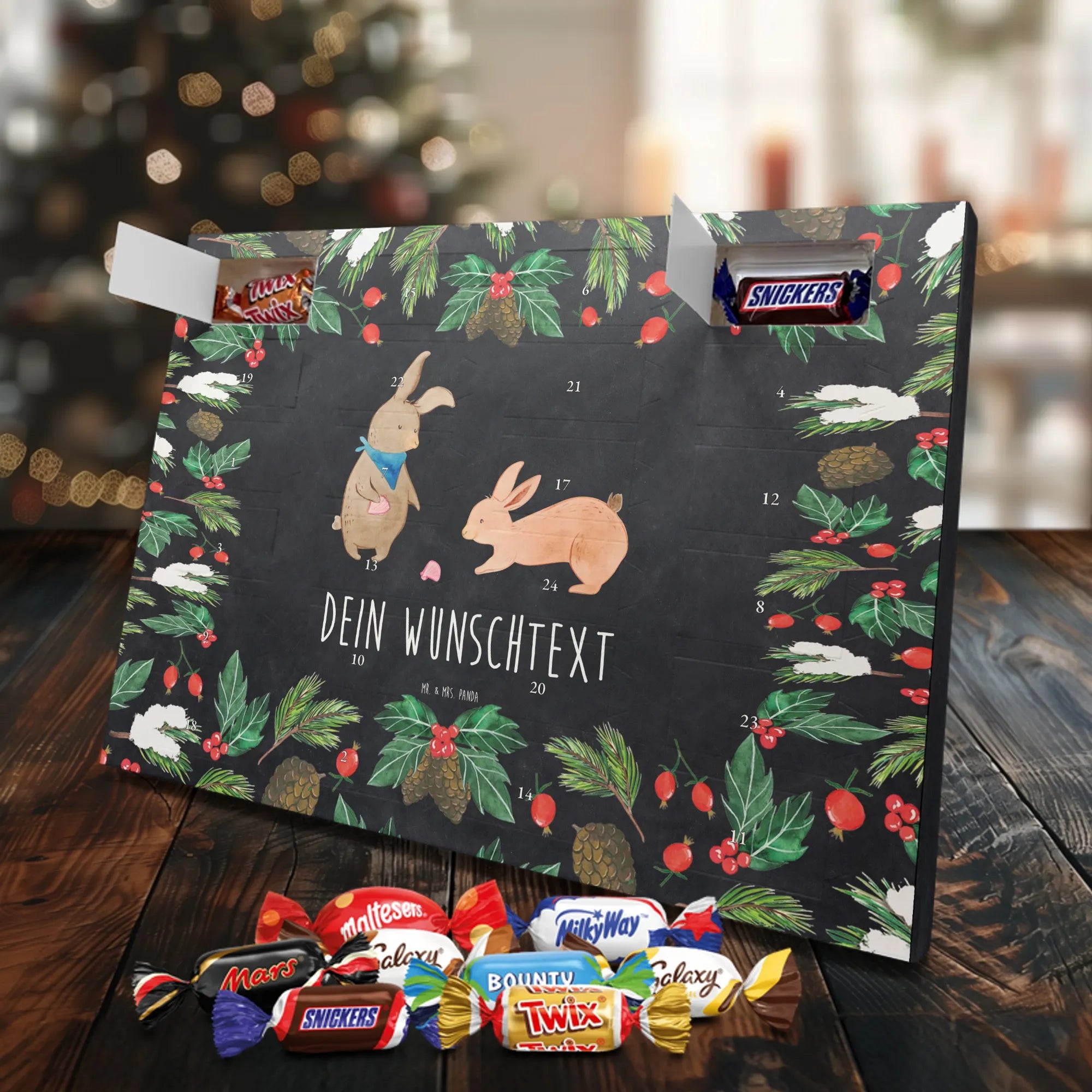 Adventskalender mit deinem Namen – individuell, süß und mit ganz viel Mr. & Mrs. Panda Charme! Dieser personalisierbare Schoko Adventskalender wird mit liebevollen Motiven & frechen Sprüchen bedruckt und lässt sich mit deinem Wunschnamen oder Wunschtext individualisieren. Durch die brillante Druckqualität und die seidenmatte Oberflächenveredelung wirken die Farben besonders intensiv und hochwertig. Auch die Seitenflächen sind bedruckt, sodass das Gesamtbild stimmig ist. Du hast die Wahl: Häng den Kalender auf oder stell ihn auf – beides funktioniert super. Der Kalender ist gefüllt mit Celebrations und enthält 24 hochwertige Füllungen in 8 verschiedenen Sorten, darunter Maltesers, Mars, Snickers, Twix, Milky Way, Bounty, Galaxy und Galaxy Caramel, die dir jeden Tag im Dezember ein Lächeln schenken. Maße: 325 mm x 225 mm x 27 mm – ideal dimensioniert für schöne Türchen-Überraschungen. Verschenke persönliche Vorfreude an Freunde, Familie oder gönn dir selbst diese zuckersüße Adventsüberraschung von Mr. & Mrs. Panda.