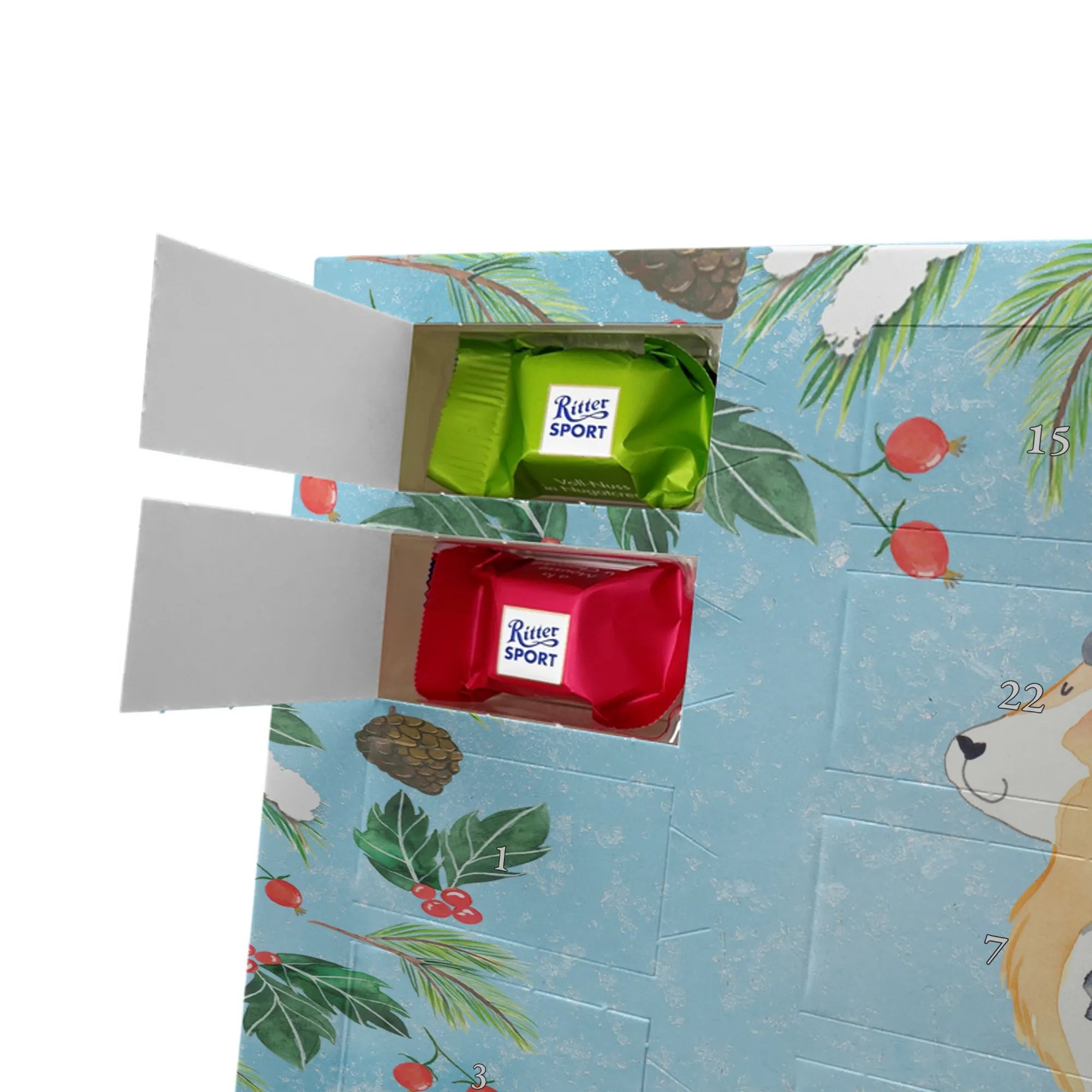 🐼 24 Türchen mit Ritter Sport Schokowürfeln in beliebten Sorten.
