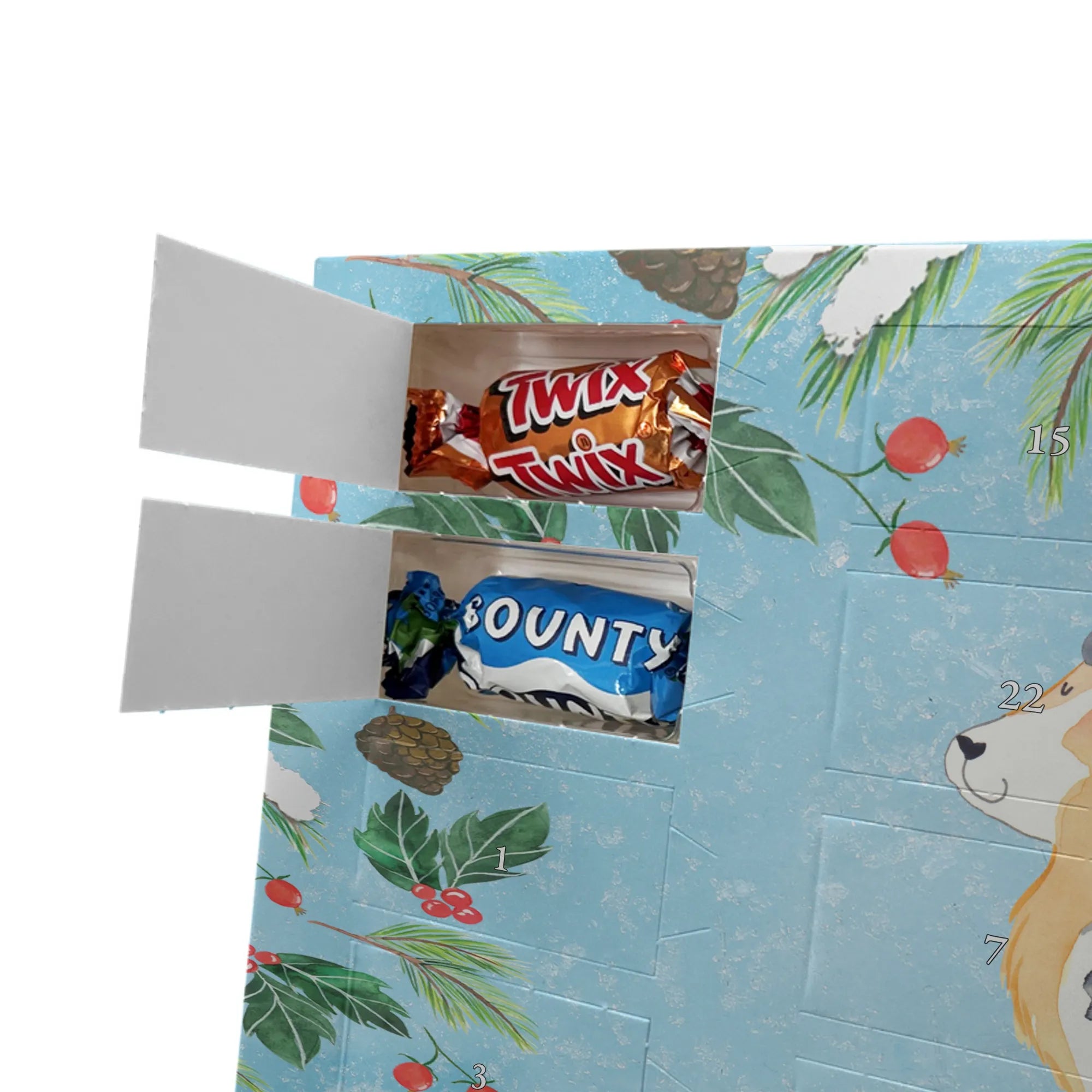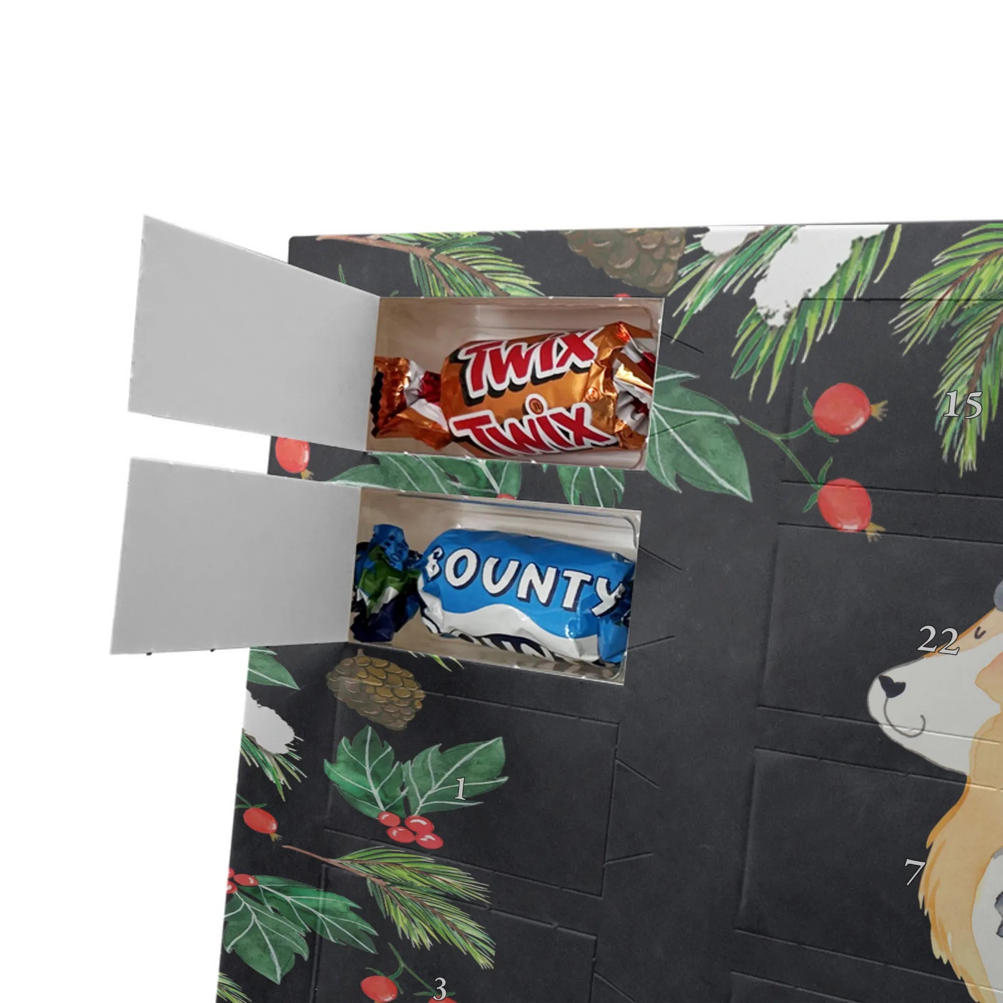 Personalisierter Schoko-Adventskalender von Mr. & Mrs. Panda – liebevoll gestaltet und ideal als individuelles Geschenk in der Adventszeit. Wir bedrucken den Kalender mit zauberhaften Motiven & herzlichen Sprüchen und personalisieren ihn mit deinem Wunschnamen oder Wunschtext. Die hochwertige Druckqualität kombiniert mit einer seidenmatten Oberflächenveredelung sorgt für ein edles Erscheinungsbild, und die bedruckten Seitenflächen geben dem Motiv zusätzlichen Charme. Der Kalender kann aufgehängt oder aufgestellt werden, sodass du ihn flexibel platzieren kannst. Gefüllt ist der Kalender mit Celebrations, die 24 hochwertige Überraschungen in 8 verschiedenen Sorten beinhalten: Maltesers, Mars, Snickers, Twix, Milky Way, Bounty, Galaxy und Galaxy Caramel. Maße: 325 mm x 225 mm x 27 mm – handlich und doch großzügig für die kleinen Leckereien hinter den Türchen. Ob für Kinder, Partner oder beste Freunde: dieser personalisierte Schoko-Adventskalender macht das Warten auf Weihnachten bunter und leckerer. Verschenke eine persönliche Erinnerung und jeden Tag ein kleines Schokoladen-Glück!