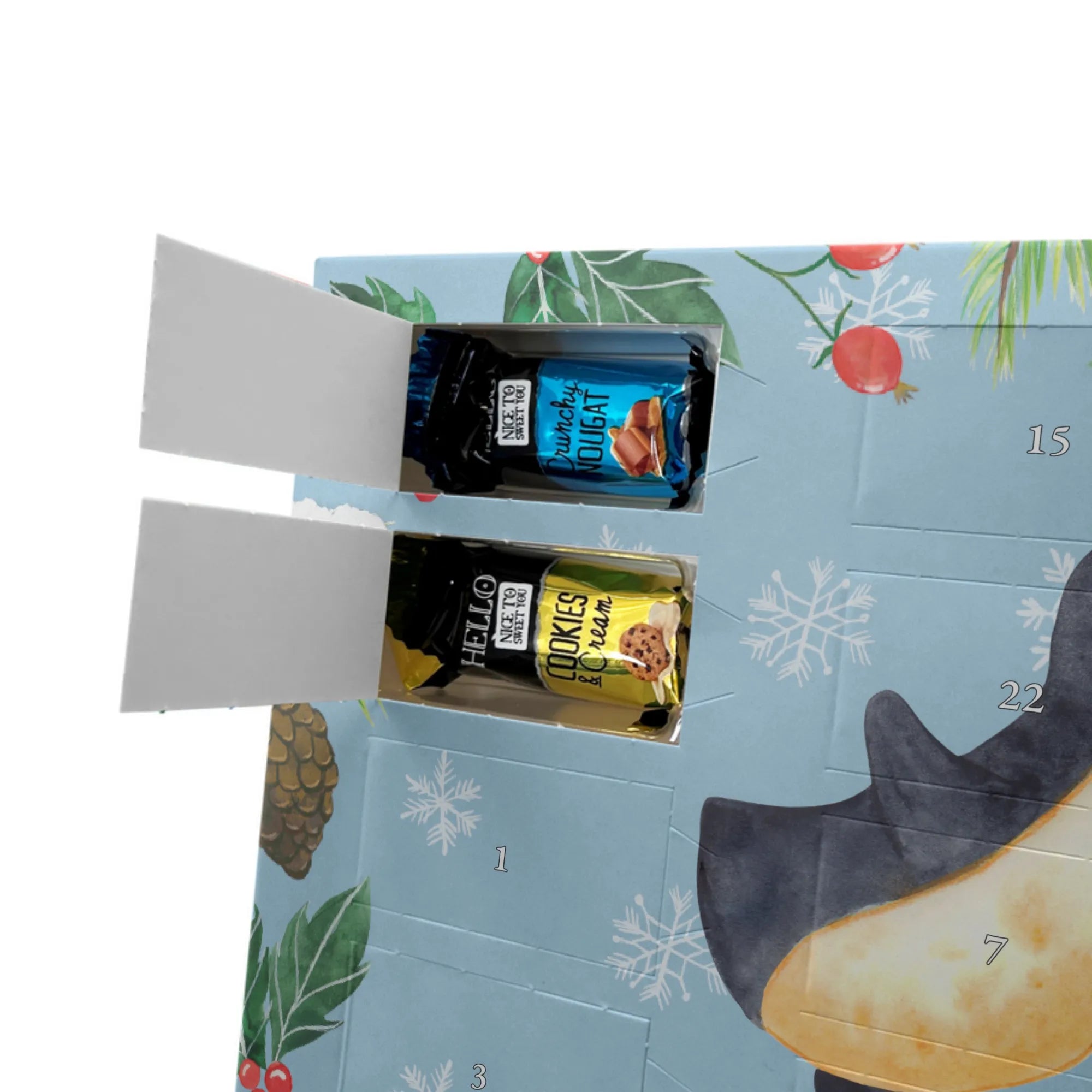 Suchst du einen besonderen Adventskalender, der persönlich und hochwertig ist? Unser Adventskalender mit Namen von Mr. & Mrs. Panda ist genau das – individualisierbar mit dem Namen deiner Liebsten oder einem kurzen Spruch und bedruckt mit unseren beliebten, charmanten Motiven. Die Druckqualität ist brillant, die seidenmatte Oberflächenveredelung verleiht dem Kalender eine elegante Haptik. Auch die Seitenflächen sind liebevoll bedruckt, sodass das Design rundum überzeugt. Du kannst den Kalender aufstellen oder an einer Stelle aufhängen, die du magst – die besondere Form macht beides möglich. Gefüllt ist der Kalender mit Ritter Sport Schokowürfeln in sechs beliebten Sorten: Mousse au Chocolat, Schoko Crisp, Voll-Nuss in Nougatcreme, Karamell Duo, Joghurt und Erdbeer-Joghurt. So gibt es hinter jedem Türchen eine kleine, leckere Überraschung. Maße: 325 mm x 225 mm x 27 mm – kompakt genug, um überall Platz zu finden, groß genug für 24 sorgfältig verpackte Schokowürfel.