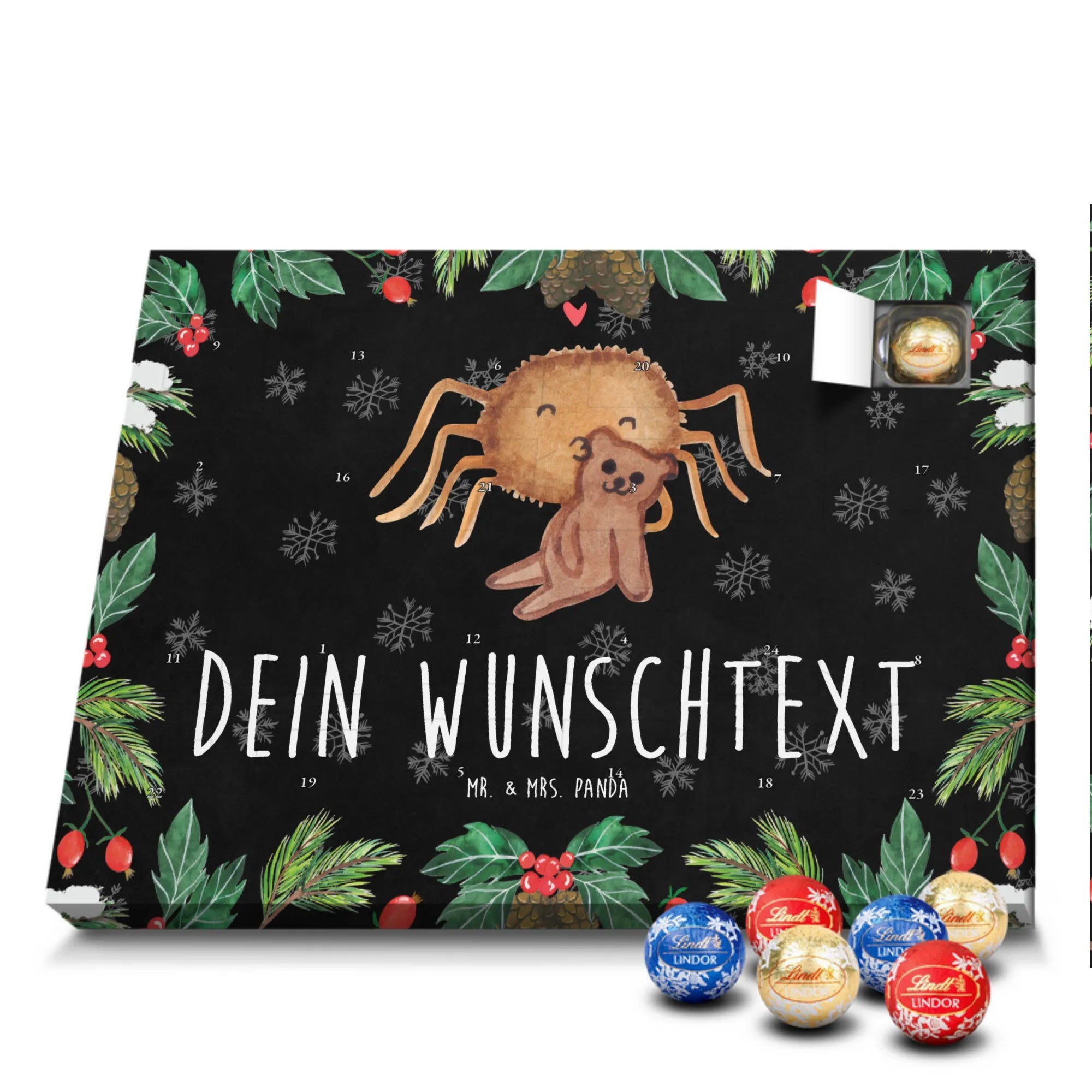 Personalisierter Schokoladen Adventskalender von Mr. & Mrs. Panda – perfekt für alle, die es süß und persönlich mögen. Unser Adventskalender ist mit liebevollen Illustrationen und charmanten Sprüchen von Mr. & Mrs. Panda bedruckt und kann mit deinem Namen oder Wunschtext individualisiert werden. Die brillante Druckqualität und die seidenmatte Oberflächenveredelung sorgen für ein edles Erscheinungsbild, zudem sind die Seitenflächen bedruckt. Maße: 233 mm x 178 mm x 24 mm. Du kannst den Kalender aufstellen oder aufhängen – je nachdem, wie du ihn am schönsten präsentierst. Gefüllt mit Lindt Lindor Schokolade: 24 einzeln verpackte Markenschokoladen Kugeln in drei köstlichen Sorten. Geschmacksrichtungen: Vollmilch, Feinherb und Weiße Schokolade. Zutaten: Zucker, pflanzliches Fett (Kokosnuss, Palmkern), Kakaobutter, Vollmilchpulver, Kakaomasse, Milchzucker, Magermilchpulver, Butterreinfett, Emulgator (Sojalecithin), Gerstenmalzextrakt, Aromen. Besondere Hinweise: Kann Haselnüsse und Mandeln enthalten. Ob als Advents-Überraschung für deine Liebsten oder als kleines Geschenk für Kollegen – dieser Kalender bringt personalisierten Genuss in die Vorweihnachtszeit.
