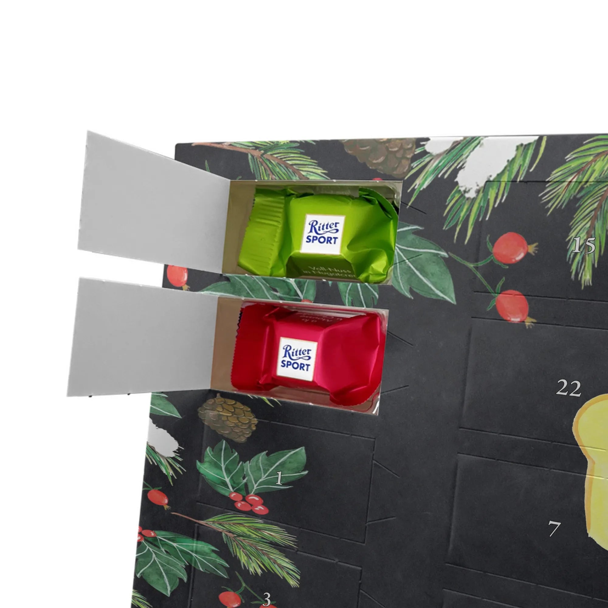 Wunderschöner, persönlicher Genuss für die Vorweihnachtszeit: unser Personalisierter Schoko Adventskalender von Mr. & Mrs. Panda ist das perfekte Geschenk für alle, die Schokolade und liebevolle Details lieben. Du kannst den Kalender mit deinem Wunschnamen oder einem kurzen Wunschtext personalisieren – so wird jeder Adventstag zu etwas ganz Besonderem. Der Karton ist liebevoll bedruckt mit den typischen, herzerwärmenden Motiven und Sprüchen von Mr. & Mrs. Panda und besticht durch brillante Druckqualität sowie eine seidenmatte Oberflächenveredelung, die edel wirkt und sich toll anfühlt. Auch die Seitenflächen sind bedruckt, sodass der Kalender von allen Seiten ein Hingucker ist. Praktisch: Du kannst den Kalender aufstellen oder an der Wand aufhängen – ganz wie es bei dir passt. Gefüllt ist der Kalender mit Ritter Sport Schokowürfeln in beliebten Geschmacksrichtungen: Mousse au Chocolat, Schoko Crisp, Voll-Nuss in Nougatcreme, Karamell Duo, Joghurt und Erdbeer-Joghurt. Maße: 325 mm x 225 mm x 27 mm. Ob für Partner, Kinder oder die beste Freundin – dieser personalisierte Adventskalender sorgt für tägliche Freude und süße Überraschungen in der Adventszeit.