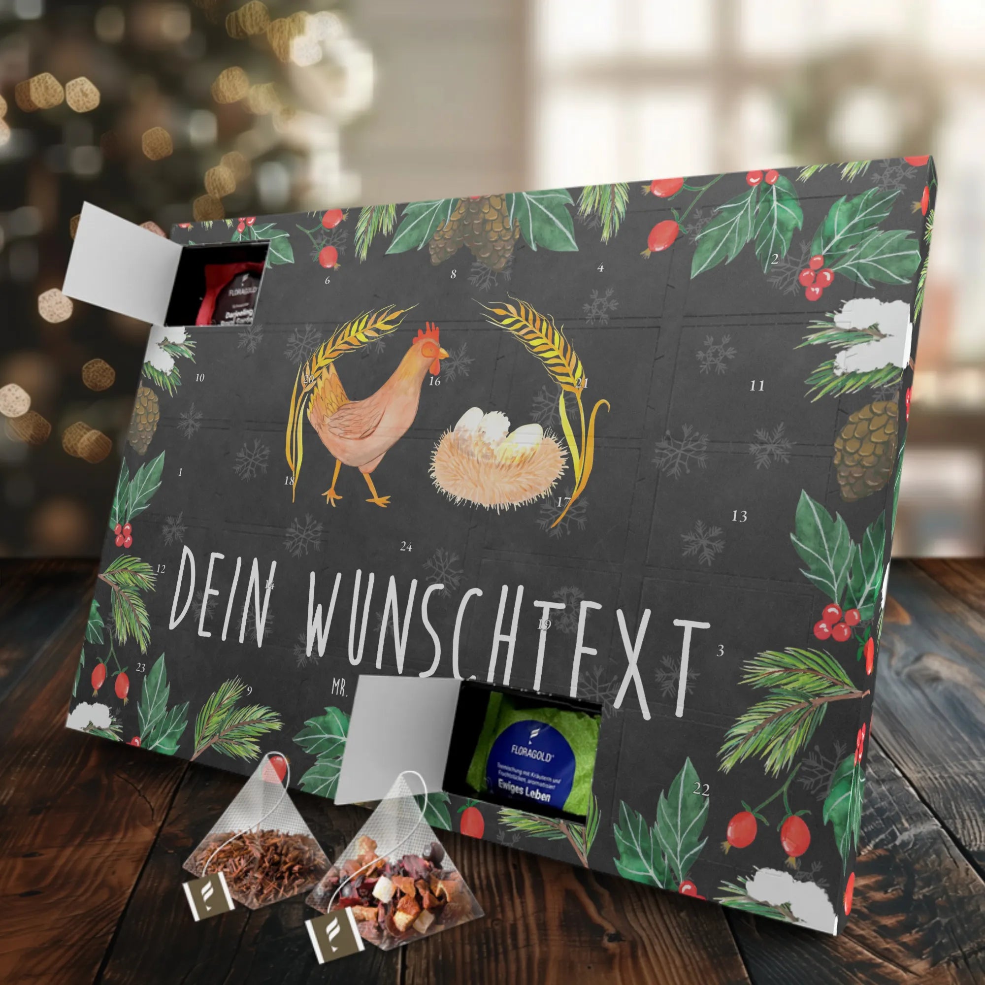 Der Personalisierte Tee Adventskalender "Huhn stolz" von Mr. & Mrs. Panda ist das perfekte Geschenk für alle Teeliebhaber und Freunde des Landlebens! Dieser wunderschöne Adventskalender bringt nicht nur eine Auswahl an köstlichen Teesorten, sondern auch eine liebevolle Botschaft mit sich, die das Herz erwärmt.