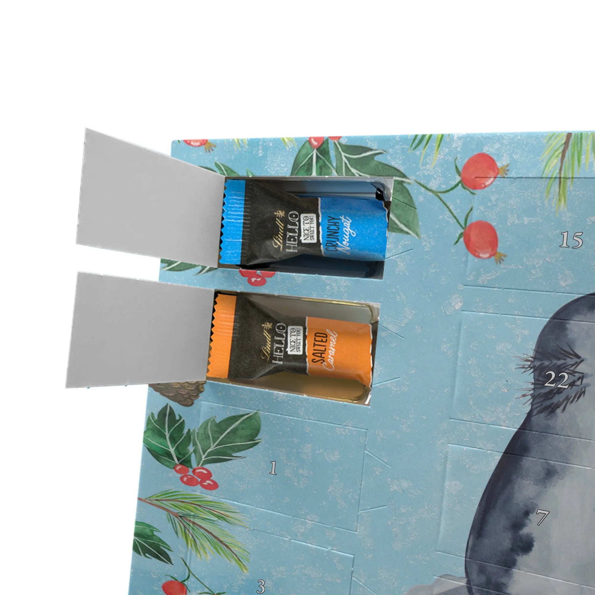 Entdecke den charmanten Schokoladen Adventskalender von Mr. & Mrs. Panda – ein kleines Kunstwerk für alle Schoko-Liebhaber. Der Schoko-Adventskalender ist mit liebevollen Illustrationen und kurzen Sprüchen bedruckt und verbreitet gemütliche Vorfreude auf Weihnachten. Er ist nicht personalisierbar, aber durch die brillante Druckqualität und die seidenmatte Oberflächenveredelung ein echtes Hingucker-Produkt. Auch die Seitenflächen sind bedruckt, was dem Kalender ein rundum schönes Erscheinungsbild verleiht. Maße: 325 mm x 225 mm x 27 mm. Das praktische Design erlaubt es, den Kalender aufzuhängen oder aufzustellen. Gefüllt mit Lindt Hello Schokolade: 24 einzeln verpackte Mini Sticks in vier leckeren Sorten – Karamell-Schokoladenkuchen, Kekse, Knuspriger Nougat und Erdbeer-Cheesecake. Zutaten sind u. a. Zucker, Kakaobutter, Vollmilchpulver, Haselnüsse und weitere Zutaten; Allergene: Milcheiweiß, Milchzucker, Soja, Weizen, Haselnüsse; kann Spuren von Mandeln und anderen Schalenfrüchten enthalten. Ideal als Geschenk oder zum Selbernaschen – einfach jeden Tag ein Türchen öffnen und genießen.