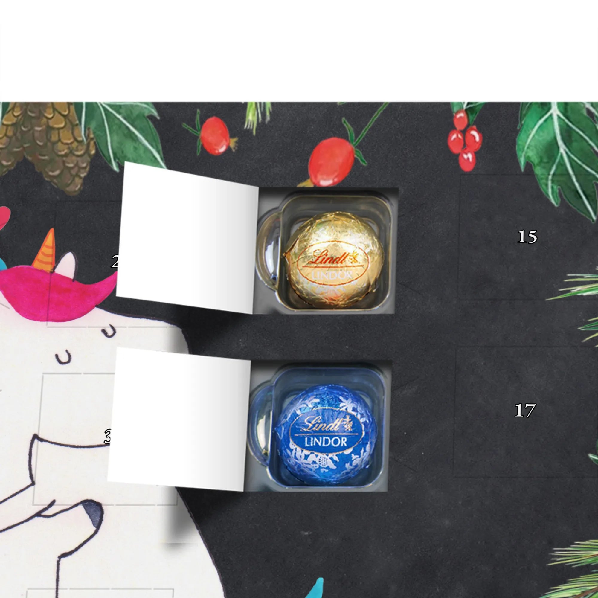 Unser zauberhafter Schoko Adventskalender von Mr. & Mrs. Panda bringt dir die süßeste Vorfreude auf Weihnachten! Dieser liebevoll gestaltete Adventskalender ist bedruckt mit wunderschönen Motiven & Sprüchen von Mr. & Mrs. Panda und ist nicht personalisierbar – dafür aber ein perfektes Geschenk für Freunde und Familie. Brillante Druckqualität mit seidenmatter Oberflächenveredelung sorgt für ein edles Finish, und die bedruckten Seitenflächen machen den Kalender von allen Seiten zu einem Hingucker. Maße: 233 mm x 178 mm x 24 mm. Besonderheit: kann aufgehängt oder aufgestellt werden, je nachdem, wie du ihn präsentieren möchtest. Gefüllt mit Lindt Lindor: 24 einzeln verpackte Markenschokoladen Kugeln in drei verschiedenen Sorten – Vollmilch, Feinherb und Weiße Schokolade – sorgen für abwechslungsreichen Genuss in der Adventszeit. Zutaten: Zucker, pflanzliches Fett (Kokosnuss, Palmkern), Kakaobutter, Vollmilchpulver, Kakaomasse, Milchzucker, Magermilchpulver, Butterreinfett, Emulgator (Sojalecithin), Gerstenmalzextrakt, Aromen. Besondere Hinweise: Kann Haselnüsse und Mandeln enthalten. Unser Schoko Adventskalender verbindet niedliches Design mit hochwertiger Füllung – ideal zum Verschenken oder selbst Naschen. Mr. & Mrs. Panda wünschen dir eine fröhliche und leckere Adventszeit!