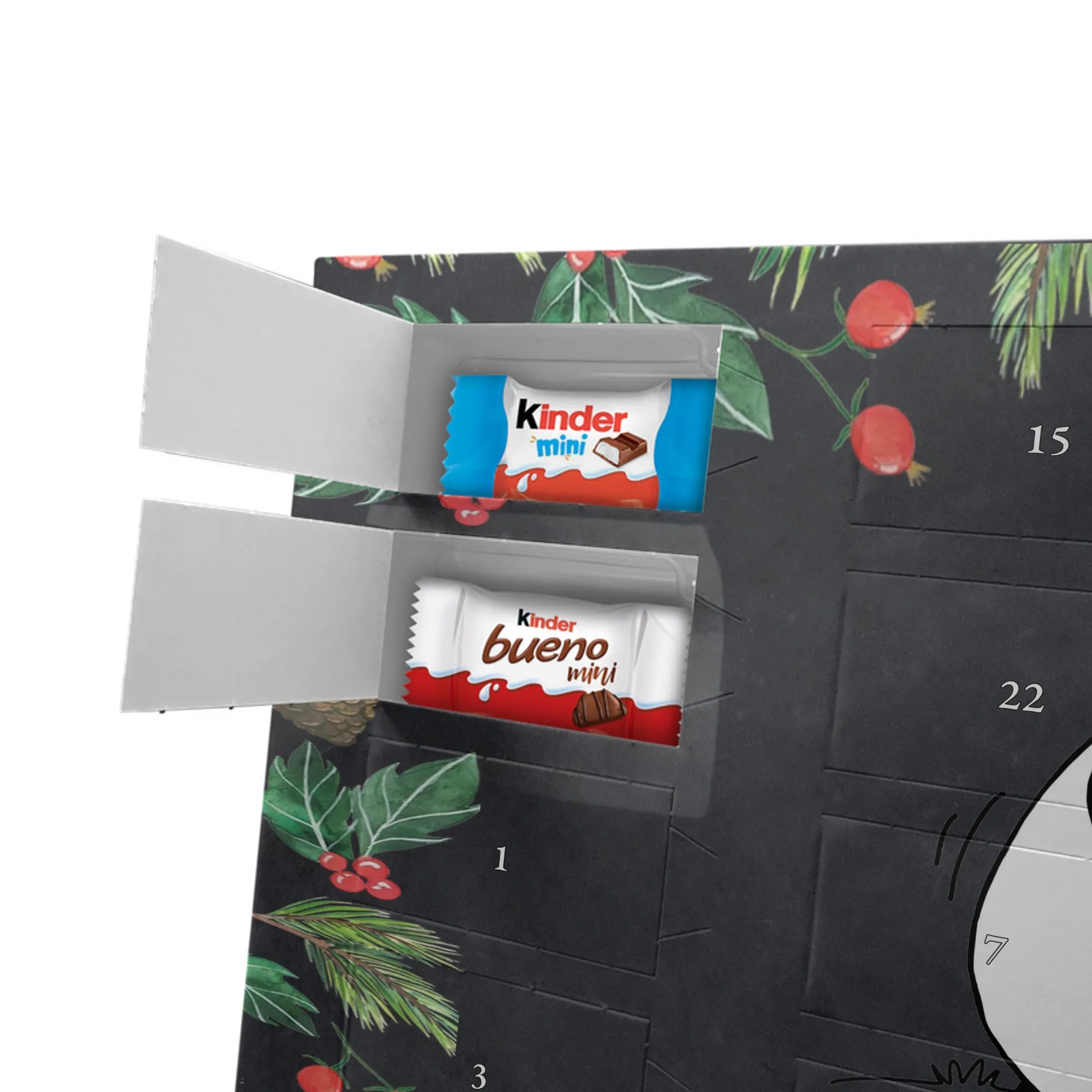 Wunderschöner Schoko Adventskalender von Mr. & Mrs. Panda – perfekt, wenn du die Vorweihnachtszeit mit einem liebevoll gestalteten Kalender versüßen möchtest. Unser Kalender ist bedruckt mit wunderschönen Motiven & Sprüchen von Mr. & Mrs. Panda und eignet sich hervorragend als Geschenk für Freunde, Familie oder einfach für dich selbst. Er ist nicht personalisierbar, dafür aber mit viel Liebe zum Detail gestaltet. Die brillante Druckqualität mit seidenmatter Oberflächenveredelung sorgt für edles Aussehen, und die bedruckten Seitenflächen geben dem Kalender einen wertigen Gesamteindruck. Maße: 355 mm x 245 mm x 11 mm. Besonderheit: kann aufgehängt oder aufgestellt werden – so findest du immer den perfekten Platz bei dir zuhause. Gefüllt mit Markenname Schokolade: Adventskalender gefüllt mit kinder® Schokolade. Inhalt: kinder® Schoko-Bons, kinder® Bueno mini und kinder® Schokolade mini. Der Kalender bietet 24 Türchen mit kleinen Überraschungen, die Kinderherzen höherschlagen lassen und Erwachsene schmunzeln. Er ist robust verarbeitet und ideal für den täglichen Genuss in der Adventszeit. Ob dekorativ auf der Kommode oder an der Wand aufgehängt – er bringt Freude und süße Momente in die Vorweihnachtszeit. Bestelle jetzt und mach dir oder deinen Lieben die Adventszeit ein bisschen süßer!