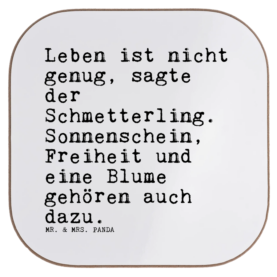 Ein wunderschöner quadratischer Untersetzer von Mr. & Mrs. Panda mit dem zauberhaften Schmetterlings-Motiv und dem Spruch: „Leben ist nicht genug, sagte der Schmetterling. Sonnenschein, Freiheit und eine Blume gehören auch dazu.“ Dieser Untersetzer vereint praktische Funktion und zarte Poesie für dein Zuhause.