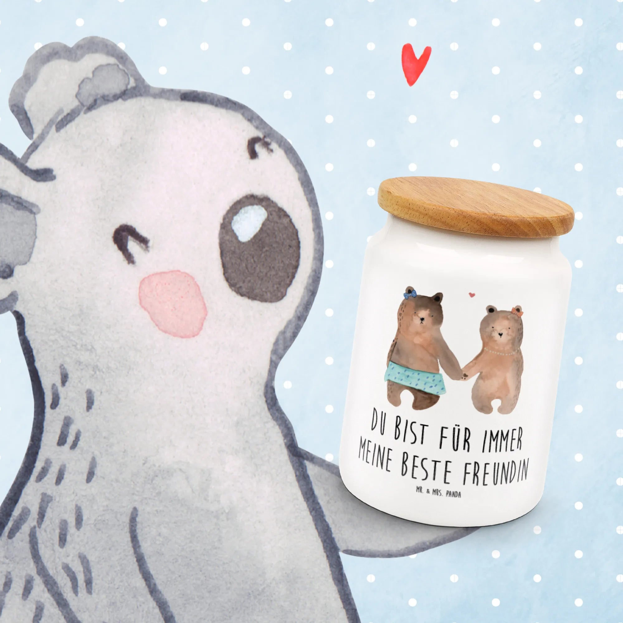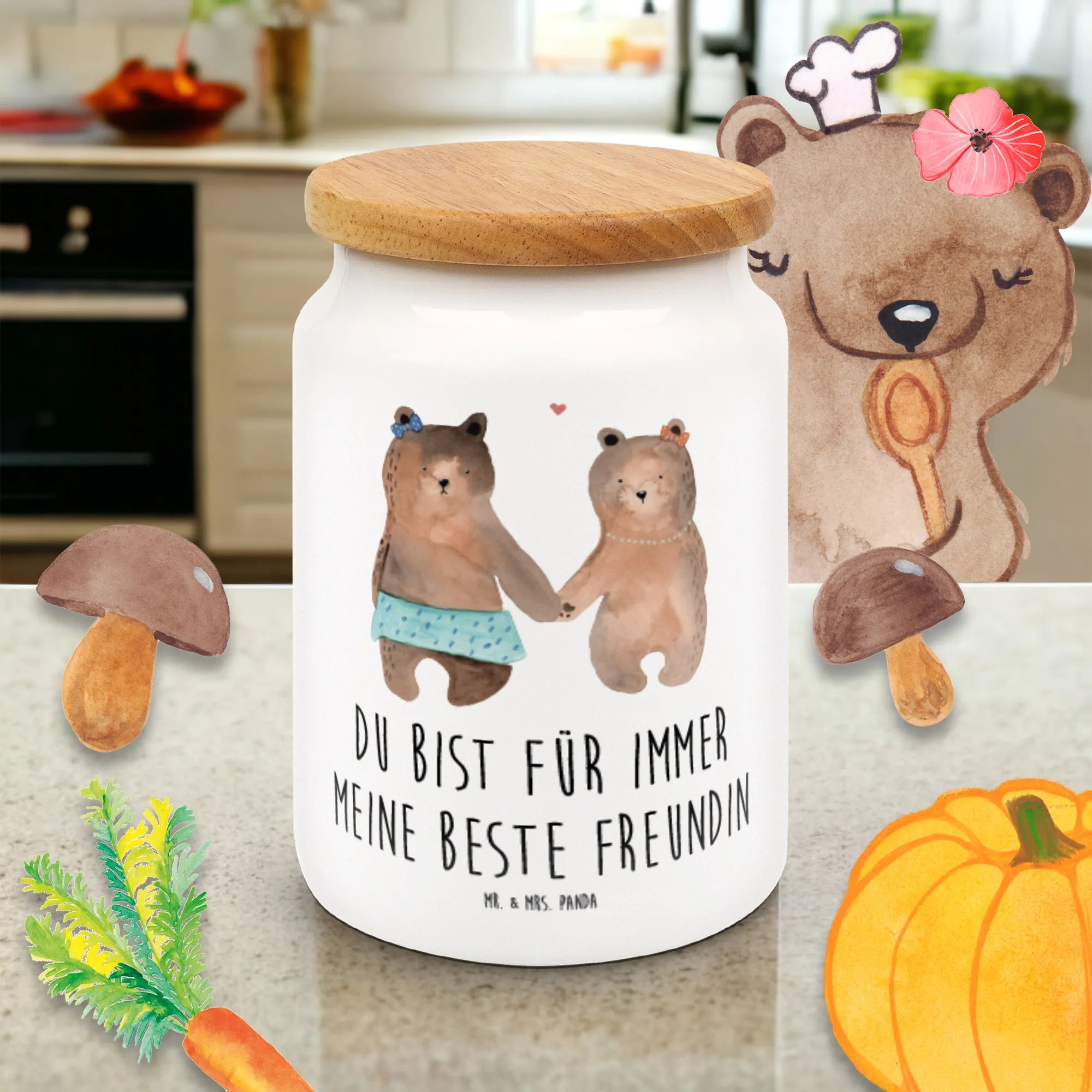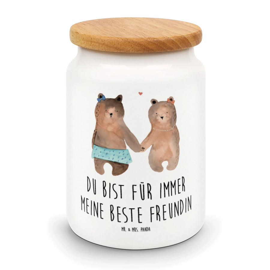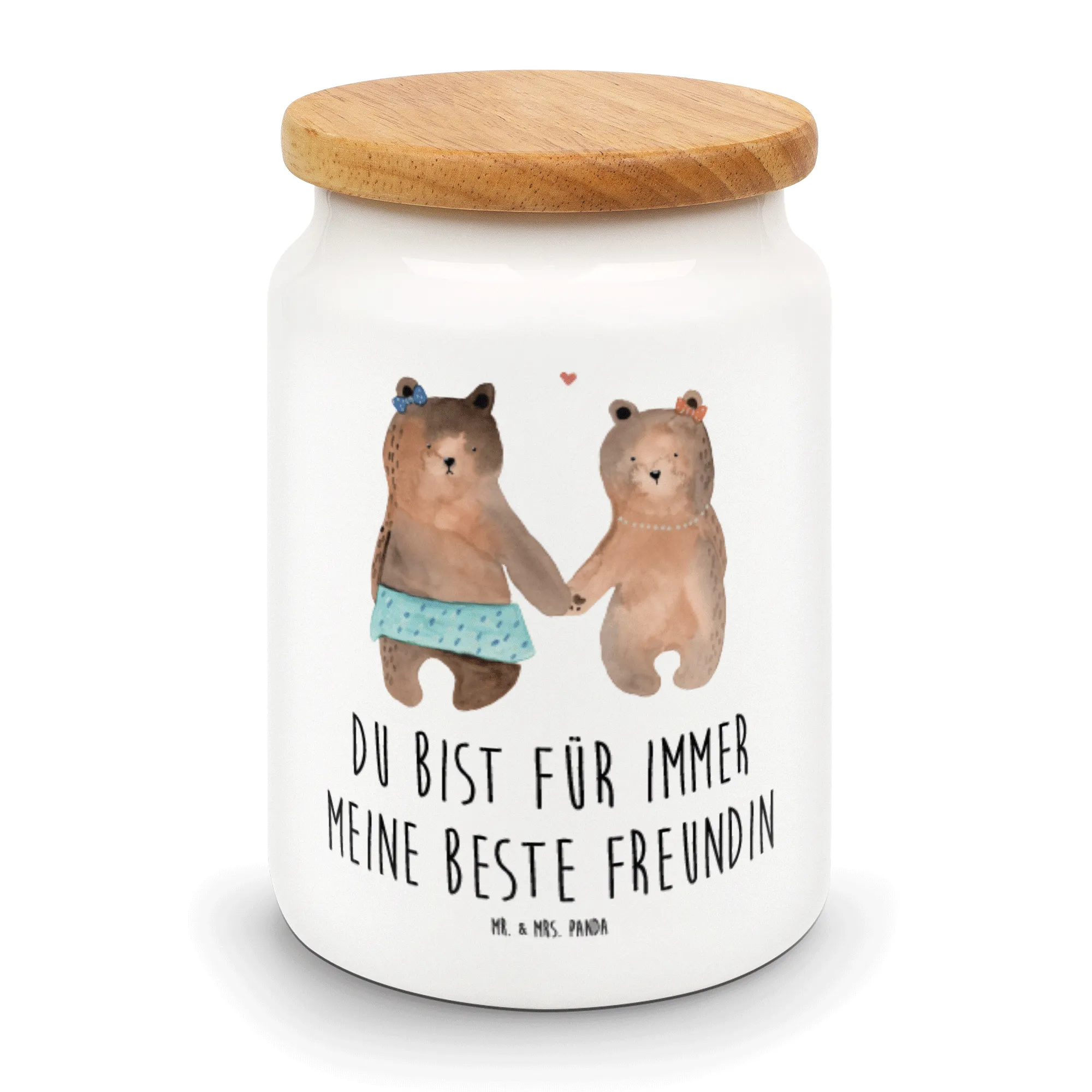 Wenn du auf der Suche nach einem liebevollen und besonderen Geschenk bist, dann ist die Vorratsdose "Bär Freundin" von Mr. & Mrs. Panda genau das Richtige für dich! Diese wunderschöne Keramikdose mit einem faszinierenden Motiv von zwei süßen Bärenmädchen, die sich an den Händen halten, bringt nicht nur Freude in deine eigene Küche, sondern auch in das Leben deiner besten Freundin.