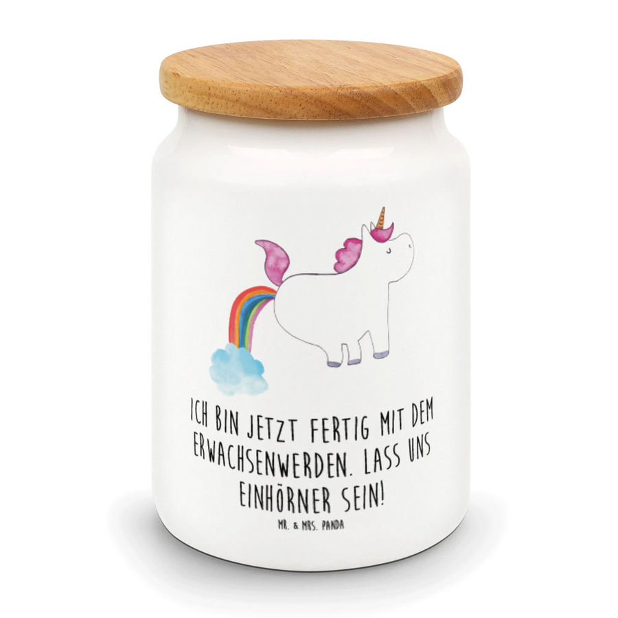 Die liebevoll bedruckte Vorratsdose 'Einhorn Pupsend' von Mr. & Mrs. Panda ist mehr als nur ein praktischer Aufbewahrungsbehälter – sie ist ein wahres Highlight in Deiner Küche!