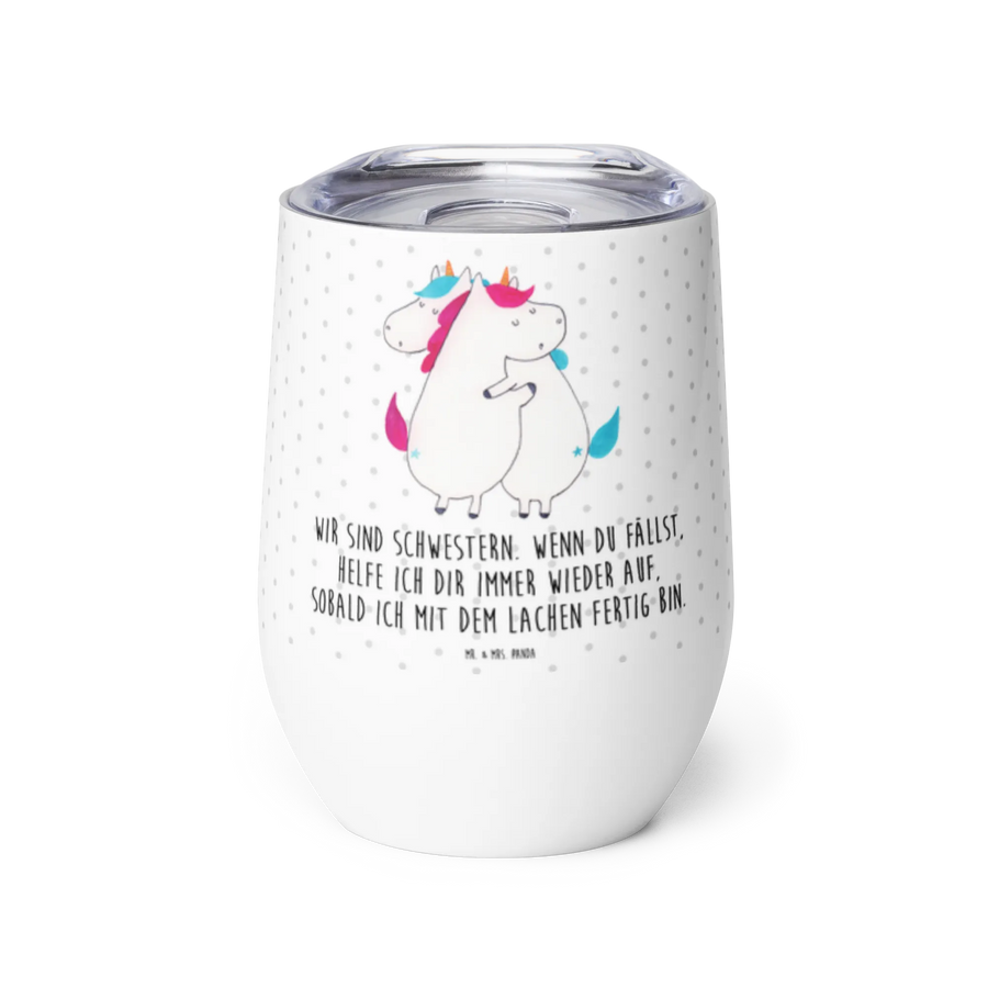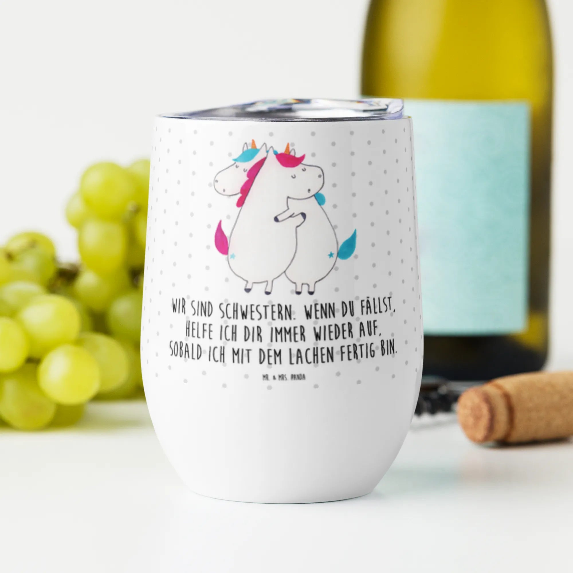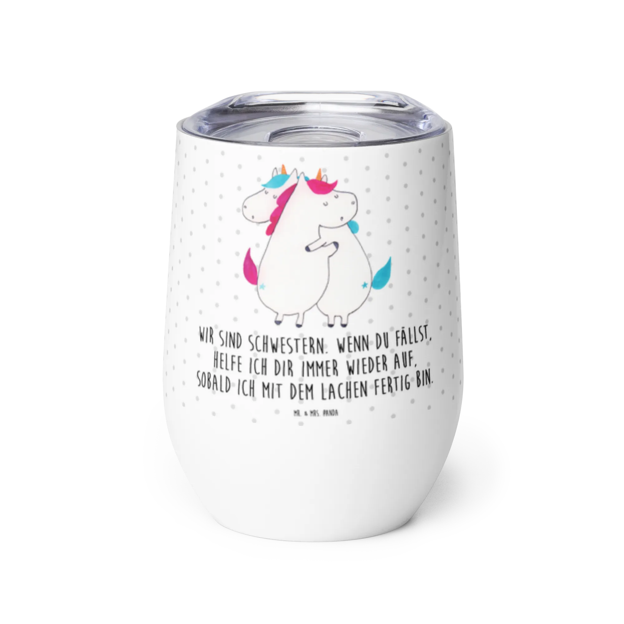 Du suchst nach dem perfekten Geschenk für Deine Schwester oder beste Freundin? Dann schau dir diesen wundervollen Weinbecher von Mr. & Mrs. Panda mit dem zauberhaften Motiv "Einhörner Umarmen" an! Dieser hochwertige Weinbecher ist nicht nur ein echter Hingucker, sondern auch praktisch für den Alltag. Mit einer Kapazität von 375 ml eignet sich der Becher perfekt für heiße Getränke wie Glühwein oder für deinen Lieblingswein. Dank der doppelwandigen Vakuumdichtung bleibt dein Getränk bis zu 5 Stunden lang auf der perfekten Temperatur, egal ob du unterwegs bist oder einen gemütlichen Abend zu Hause mit Freunden verbringst.
