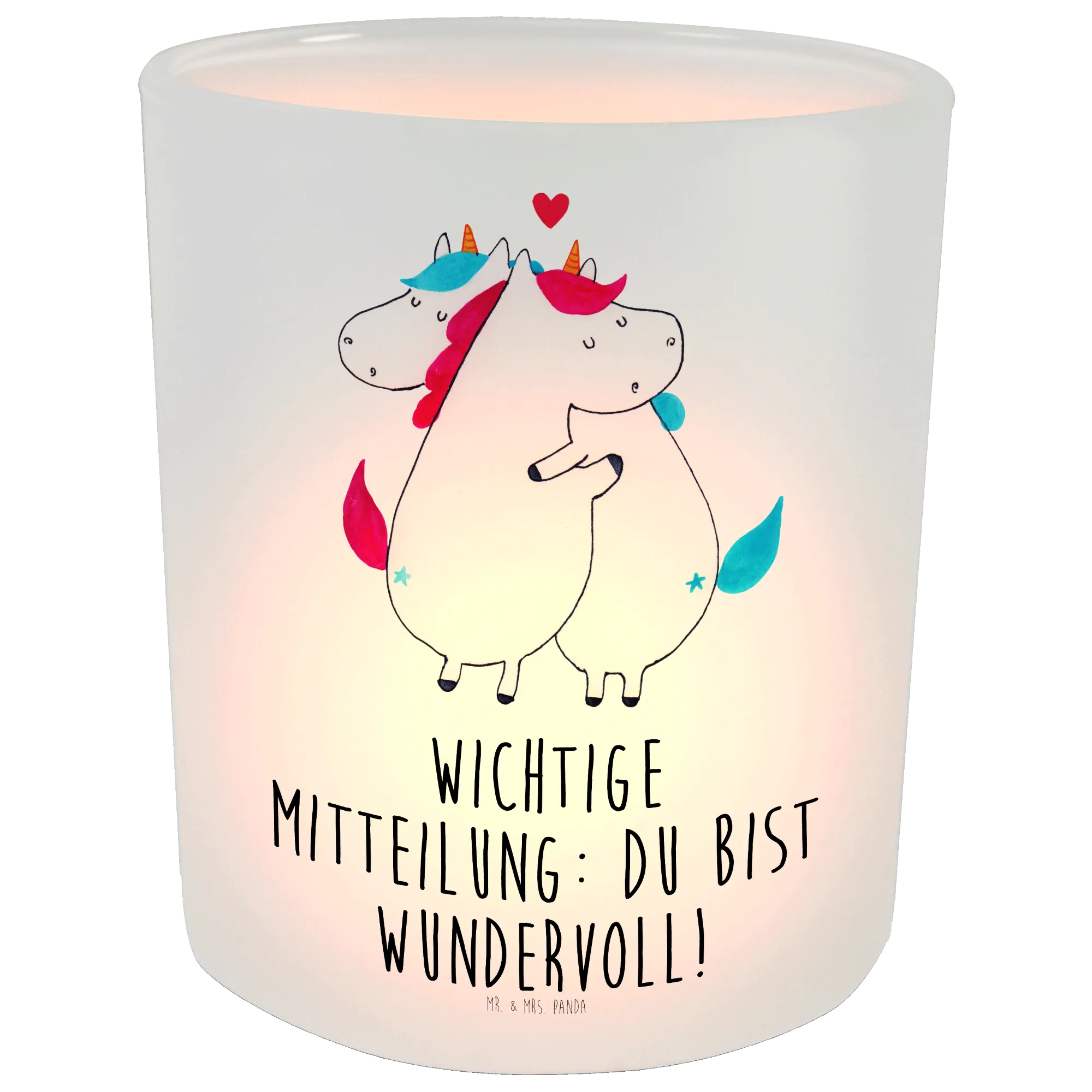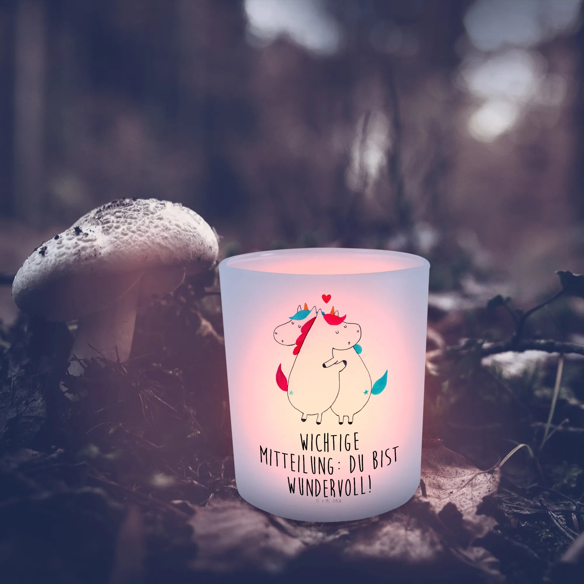 Entdecke unser zauberhaftes Windlicht Glas mit dem niedlichen Einhornmotiv "Wichtige Mitteilung: du bist wundervoll!" von Mr. & Mrs. Panda. Dieses wunderschöne Teelichtglas bringt nicht nur Licht in dein Leben, sondern auch eine ganz besondere Botschaft. Die zwei kuschelnden Einhörner, die sich umarmen, erinnern dich und deine Liebsten daran, wie wichtig es ist, Liebe und Wertschätzung auszudrücken. Perfekt für romantische Abende, ja sogar für jeden Tag!