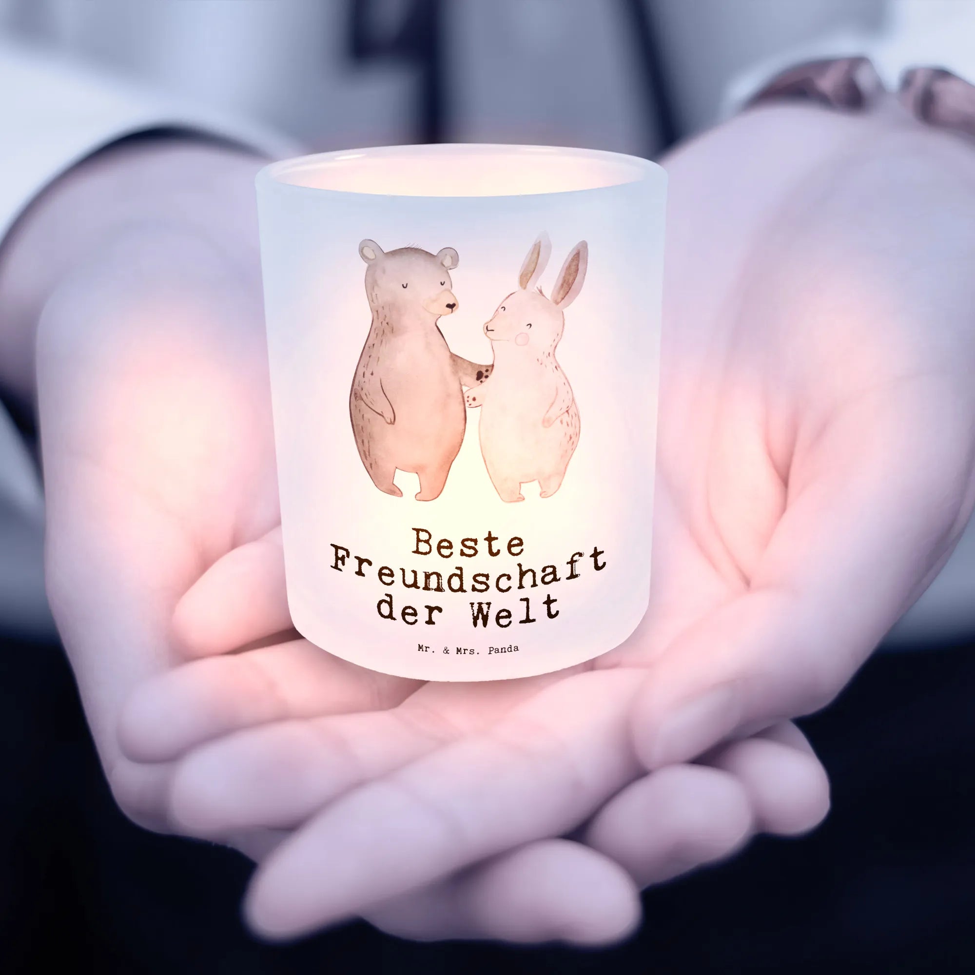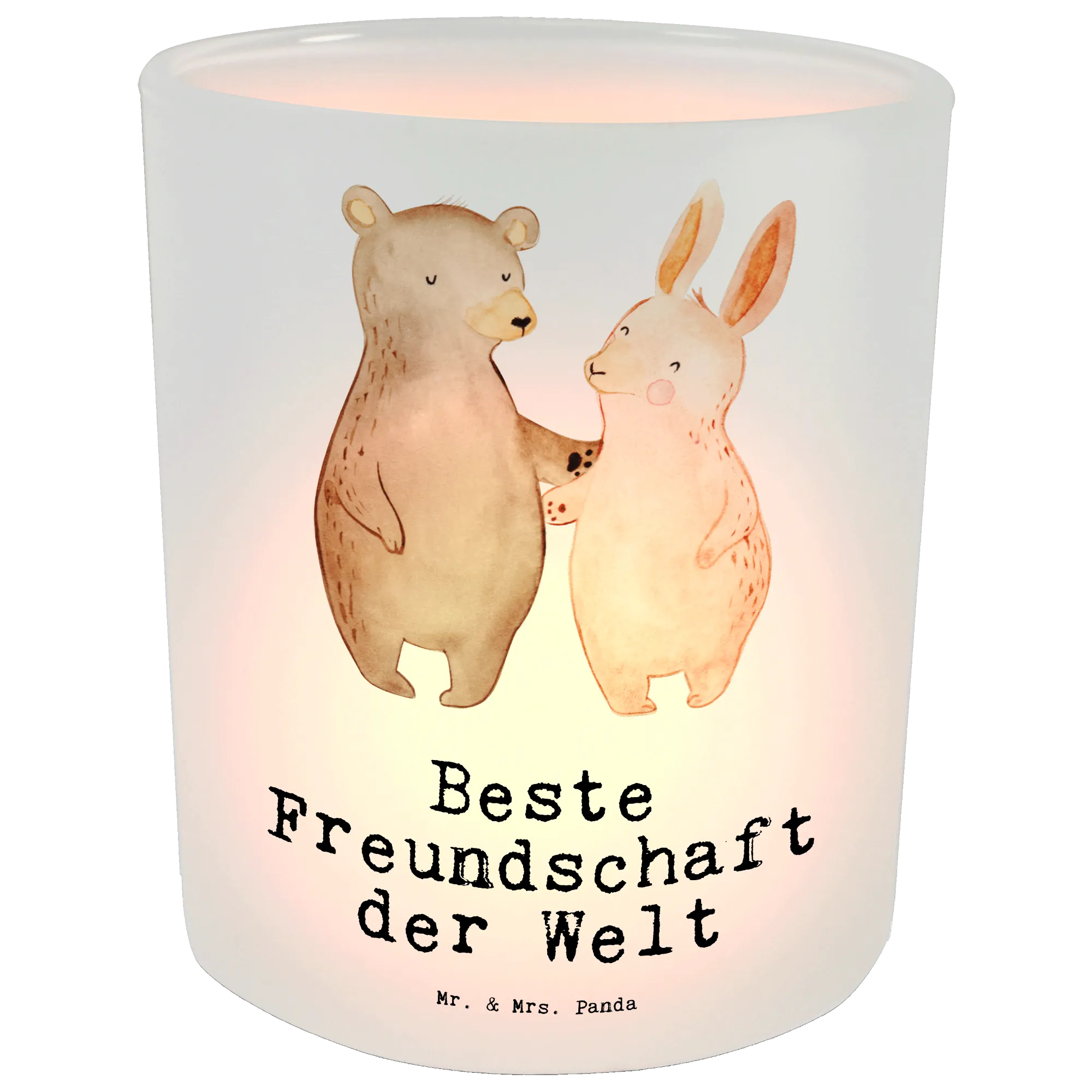 Das Windlicht mit dem Motiv "Hase Beste Freundschaft der Welt" von Mr. & Mrs. Panda ist das perfekte Geschenk für alle, die Freundschaft schätzen. Ideal geeignet als Teelichthalter, verkörpert es die süße Botschaft von Freundschaft auf eine zauberhafte Weise. Wenn Du einen besonderen Menschen in Deinem Leben hast - sei es Deine beste Freundin, Dein bester Freund oder einfach ein liebevoller Kumpel - dieses Windlicht wird ihre Herzen erwärmen.