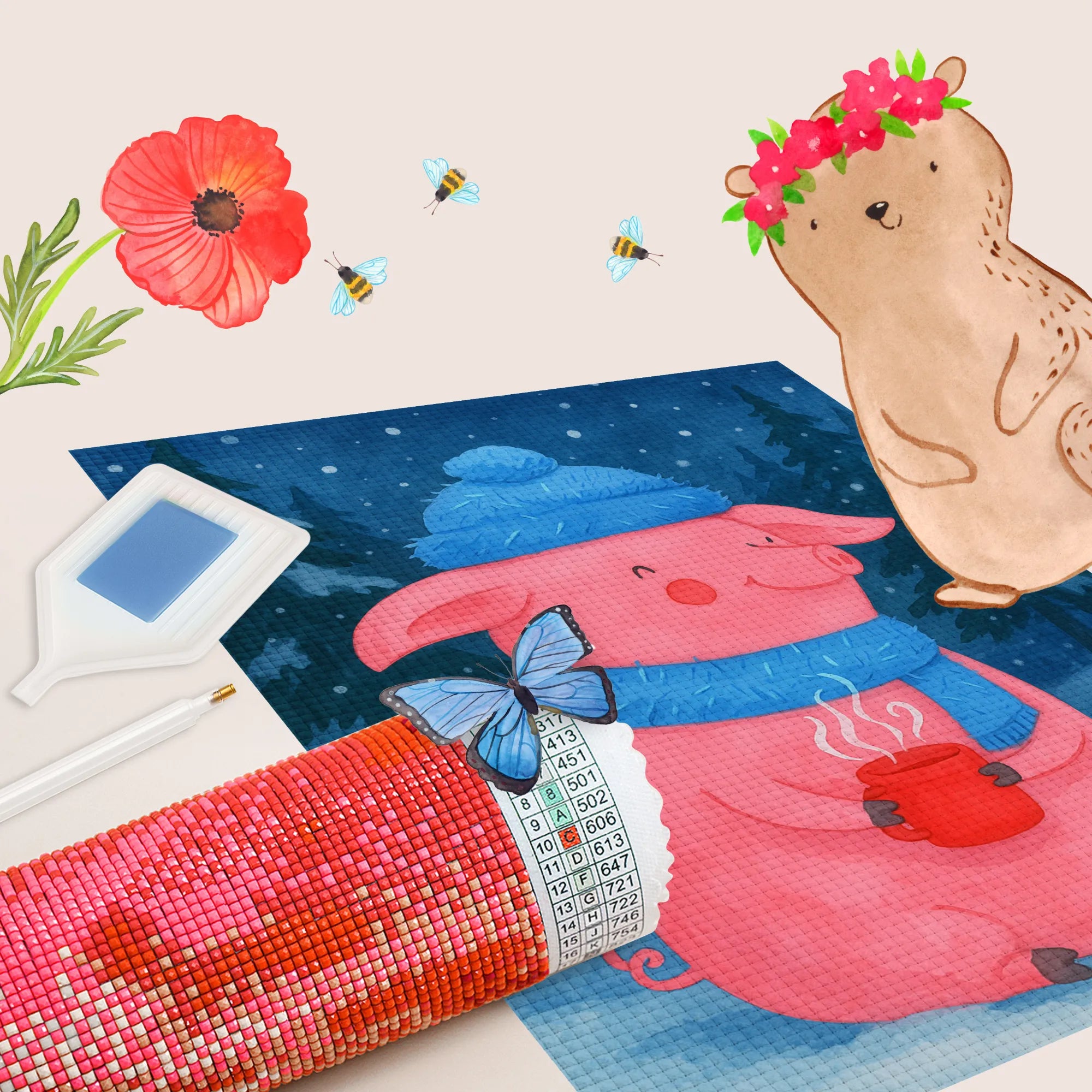 Juhuu — die schönste Zeit im Jahr beginnt! Unser Diamond Painting „Lallendes Glühschwein“ aus der Winter Kollektion von Mr. & Mrs. Panda bringt Weihnachtsmarkt-Gefühl direkt zu Dir nach Hause. Das niedliche rosa Schwein mit blauer Mütze und Schal hält eine dampfende rote Tasse und verbreitet sofort warme, gemütliche Stimmung.