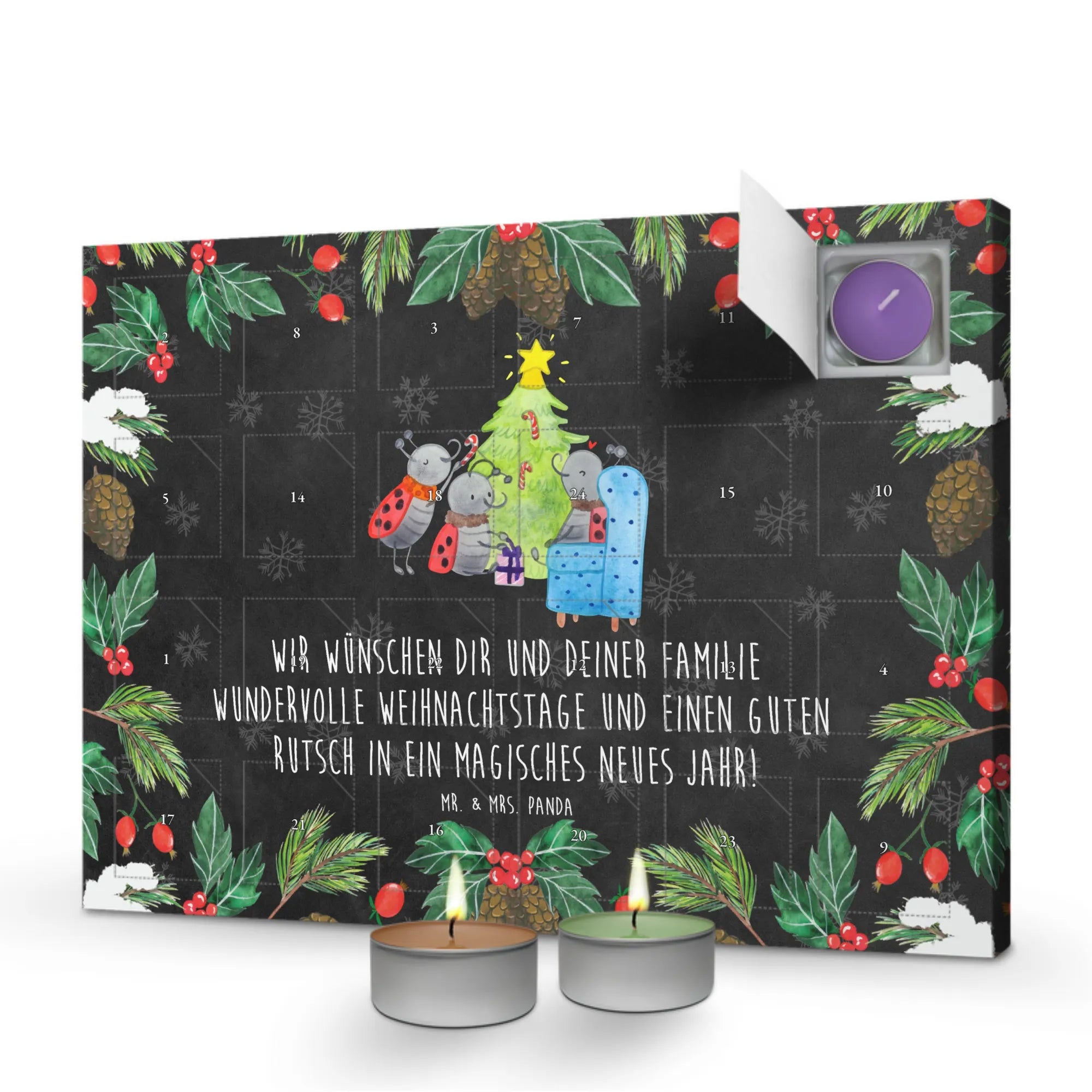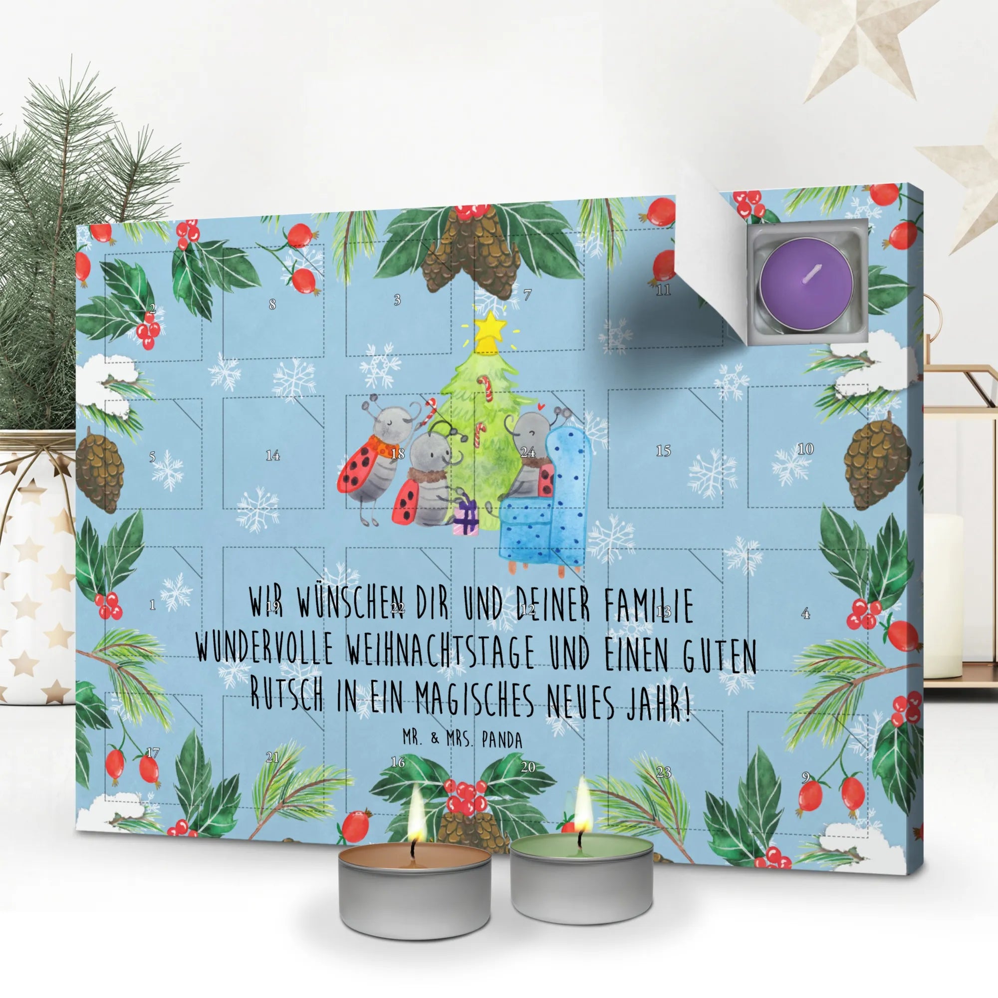 Der Duftkerzen Adventskalender "Weihnachten Smörle" von Mr. & Mrs. Panda ist das perfekte Geschenk, um die Vorweihnachtszeit zu zelebrieren. Mit liebevoller Gestaltung und einer märchenhaften Illustration von drei glücklichen Marienkäfern um einen geschmückten Weihnachtsbaum bringt dieser Kalender die magische Atmosphäre der Winter- und Weihnachtszeit direkt zu dir nach Hause.
