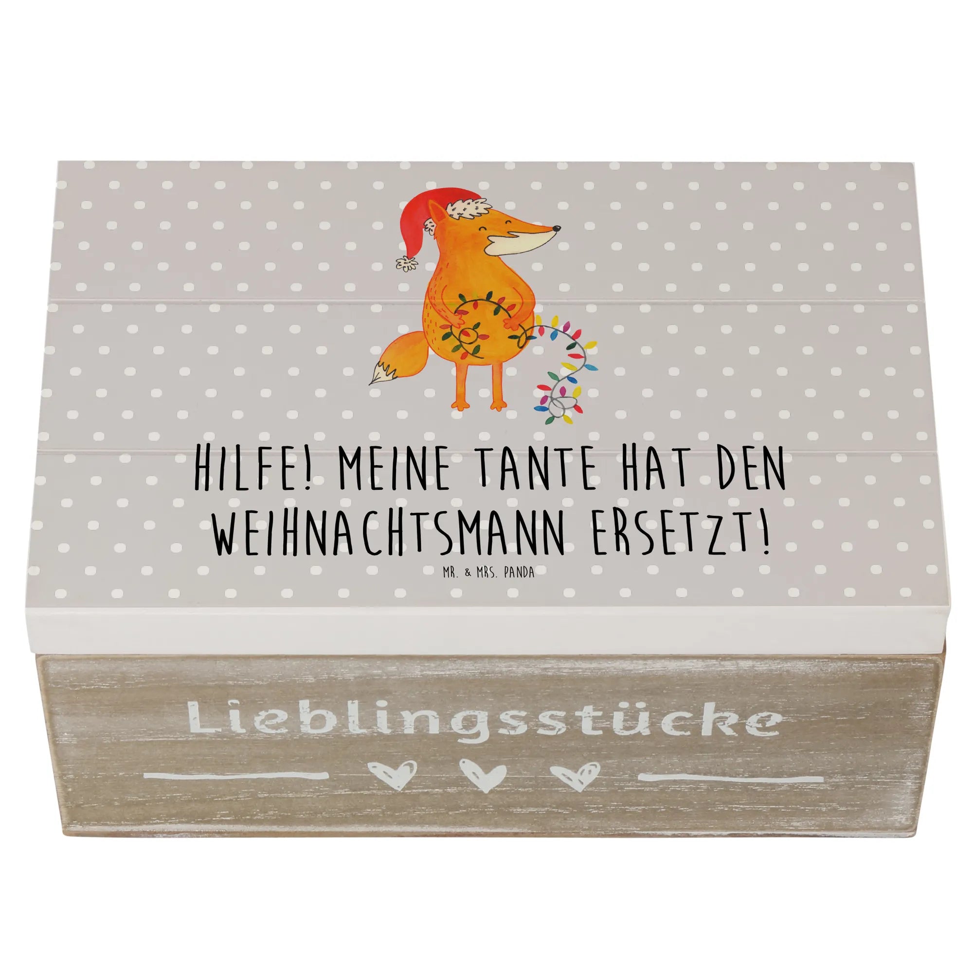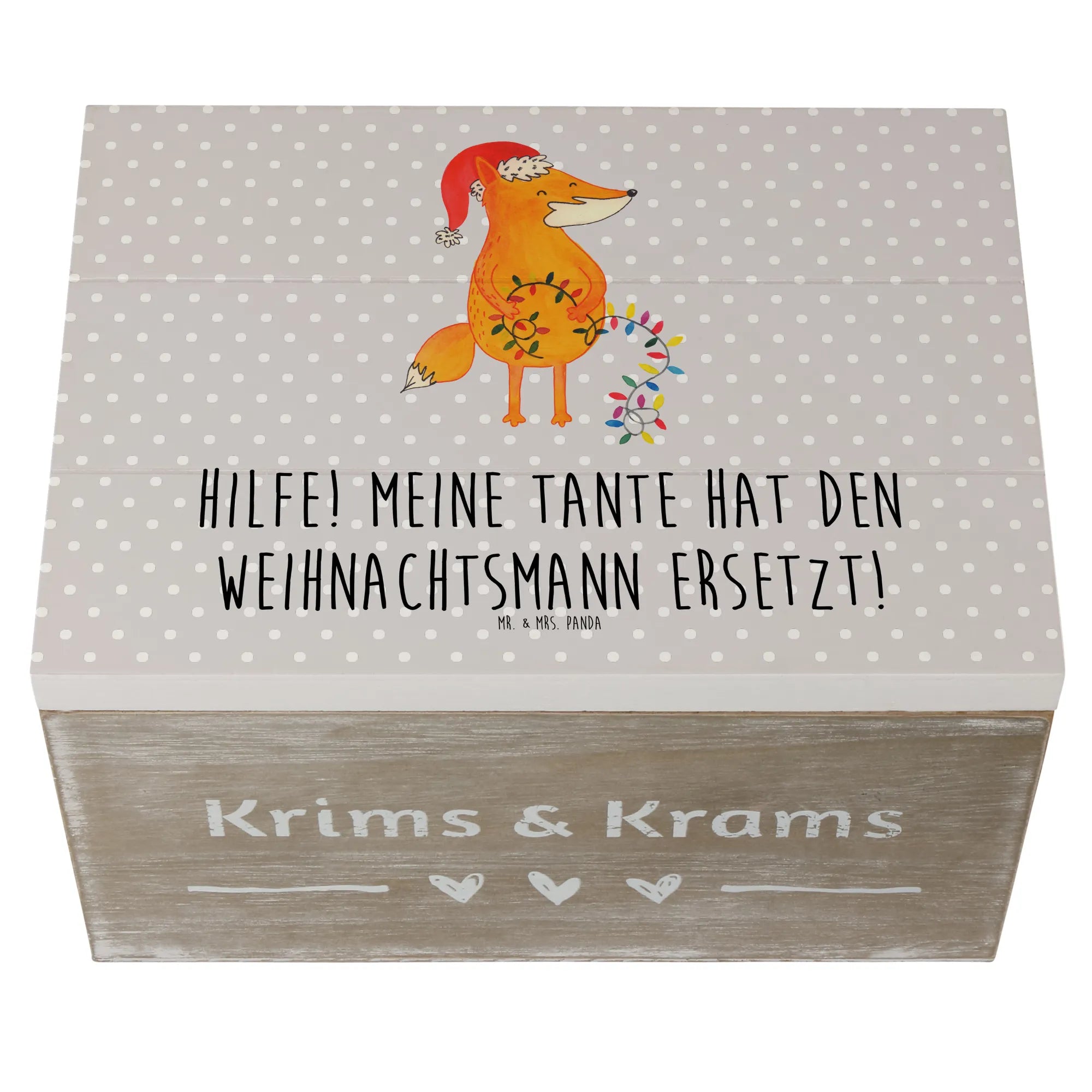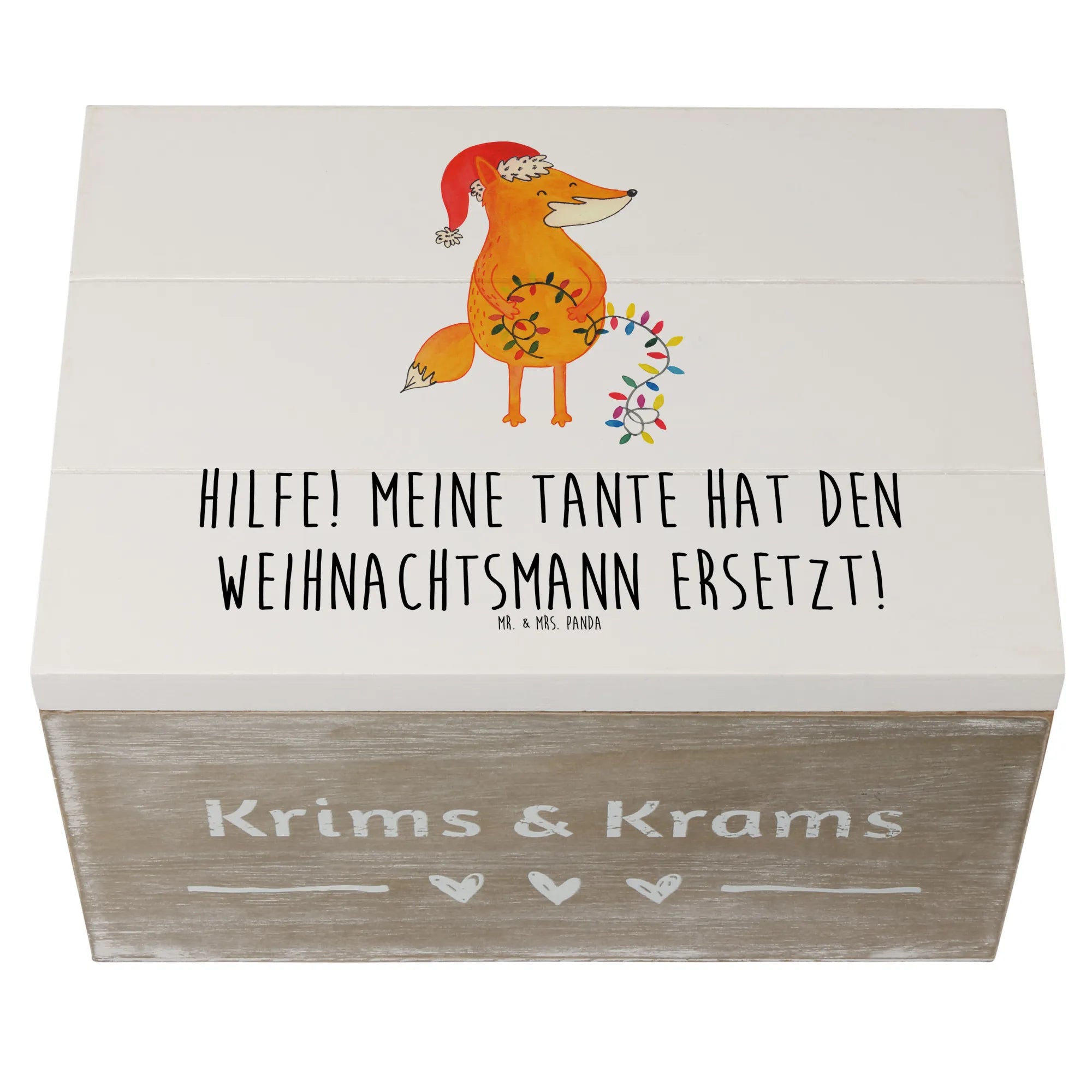 Die robuste Holzfaser macht sie besonders stabil und langlebig, sodass Du lange Freude daran hast. Die Kiste ist mit einem charmanten Motiv und dem witzigen Spruch "Hilfe! Meine Tante hat den Weihnachtsmann ersetzt!" bedruckt, der jedem ein Lächeln ins Gesicht zaubert.