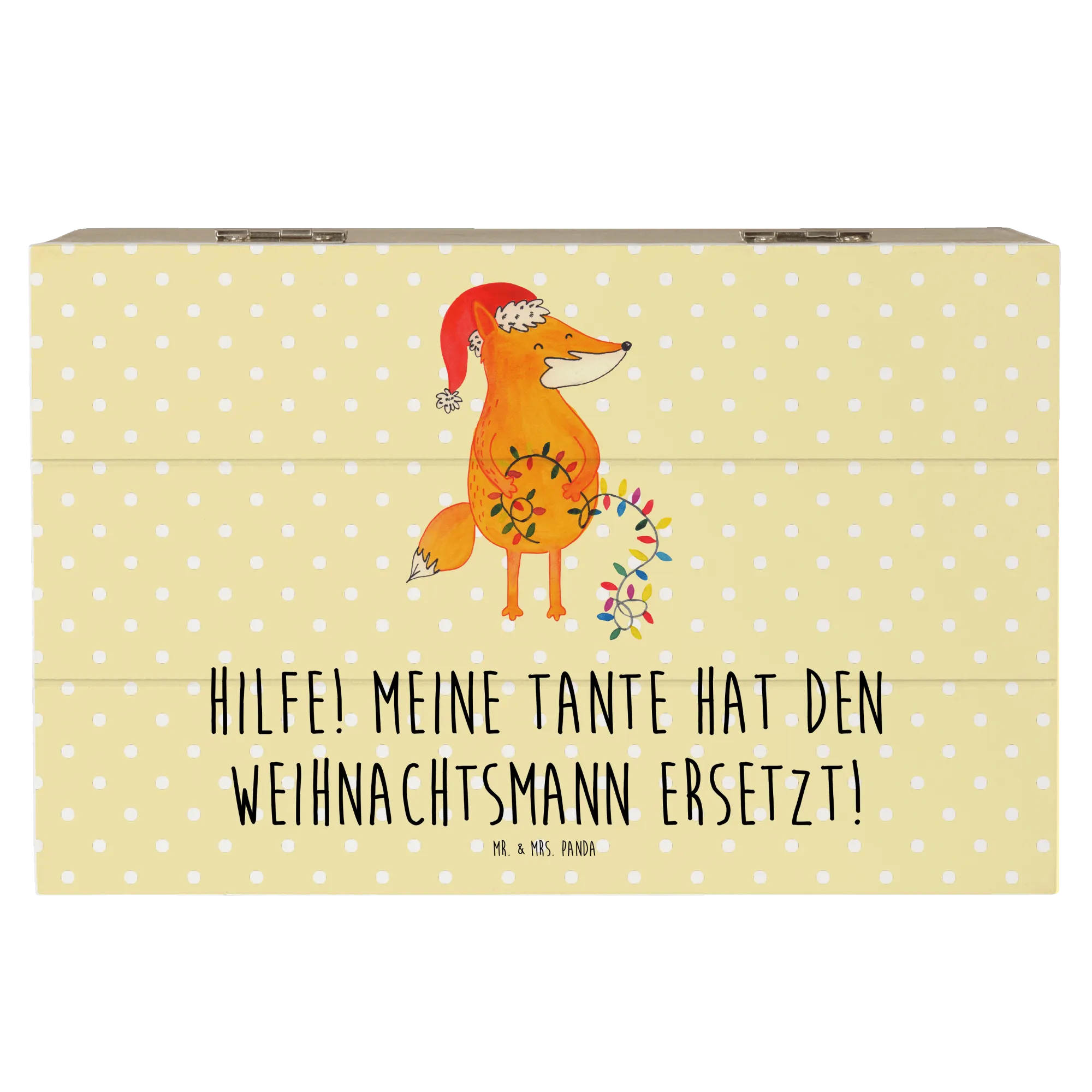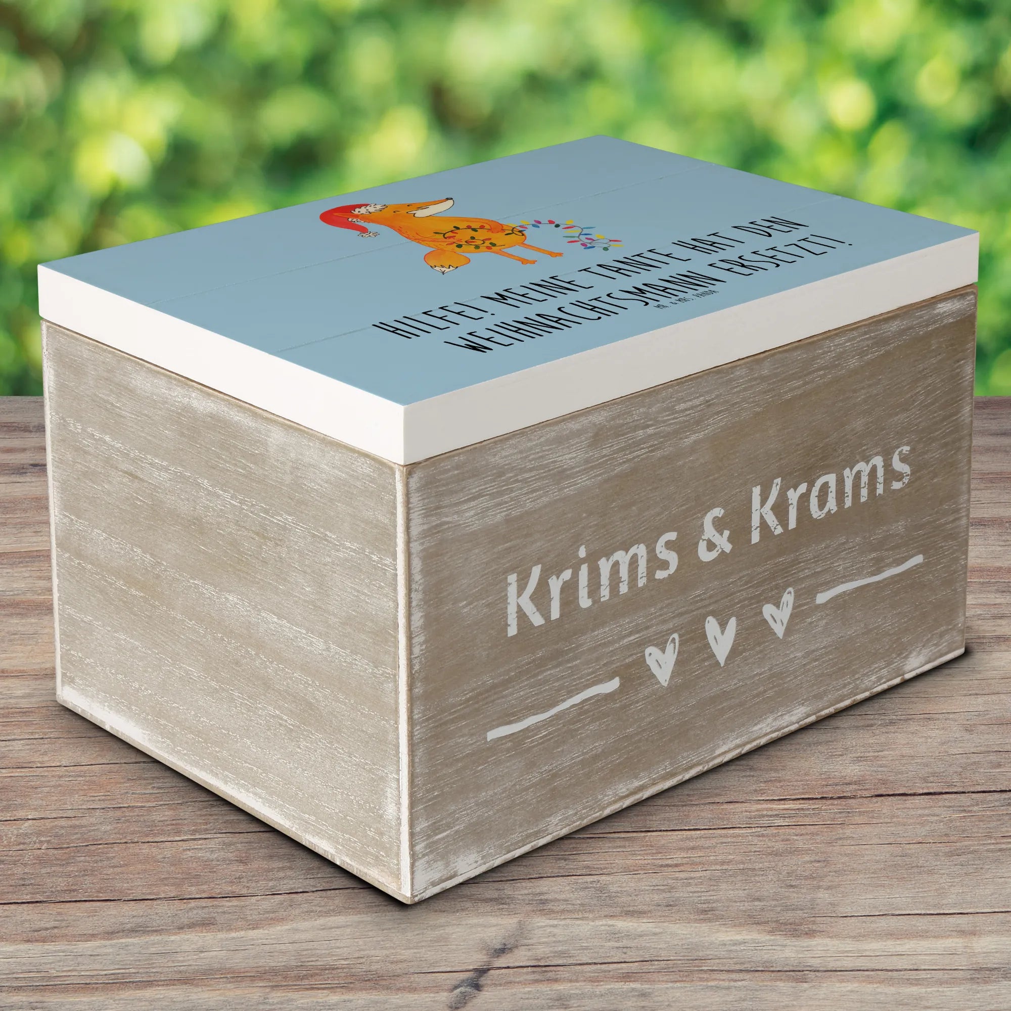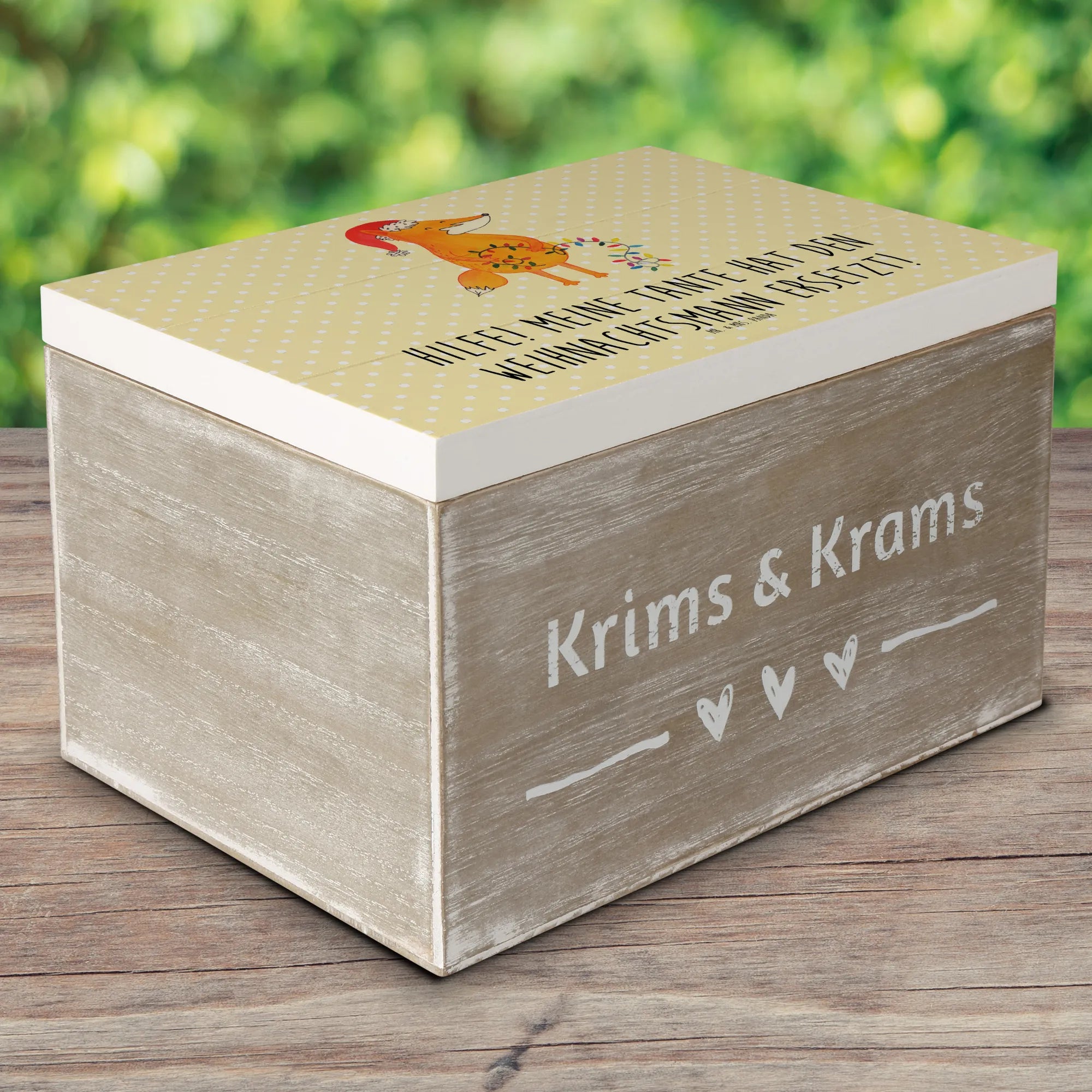 Die robuste Holzfaser macht sie besonders stabil und langlebig, sodass Du lange Freude daran hast. Die Kiste ist mit einem charmanten Motiv und dem witzigen Spruch "Hilfe! Meine Tante hat den Weihnachtsmann ersetzt!" bedruckt, der jedem ein Lächeln ins Gesicht zaubert.