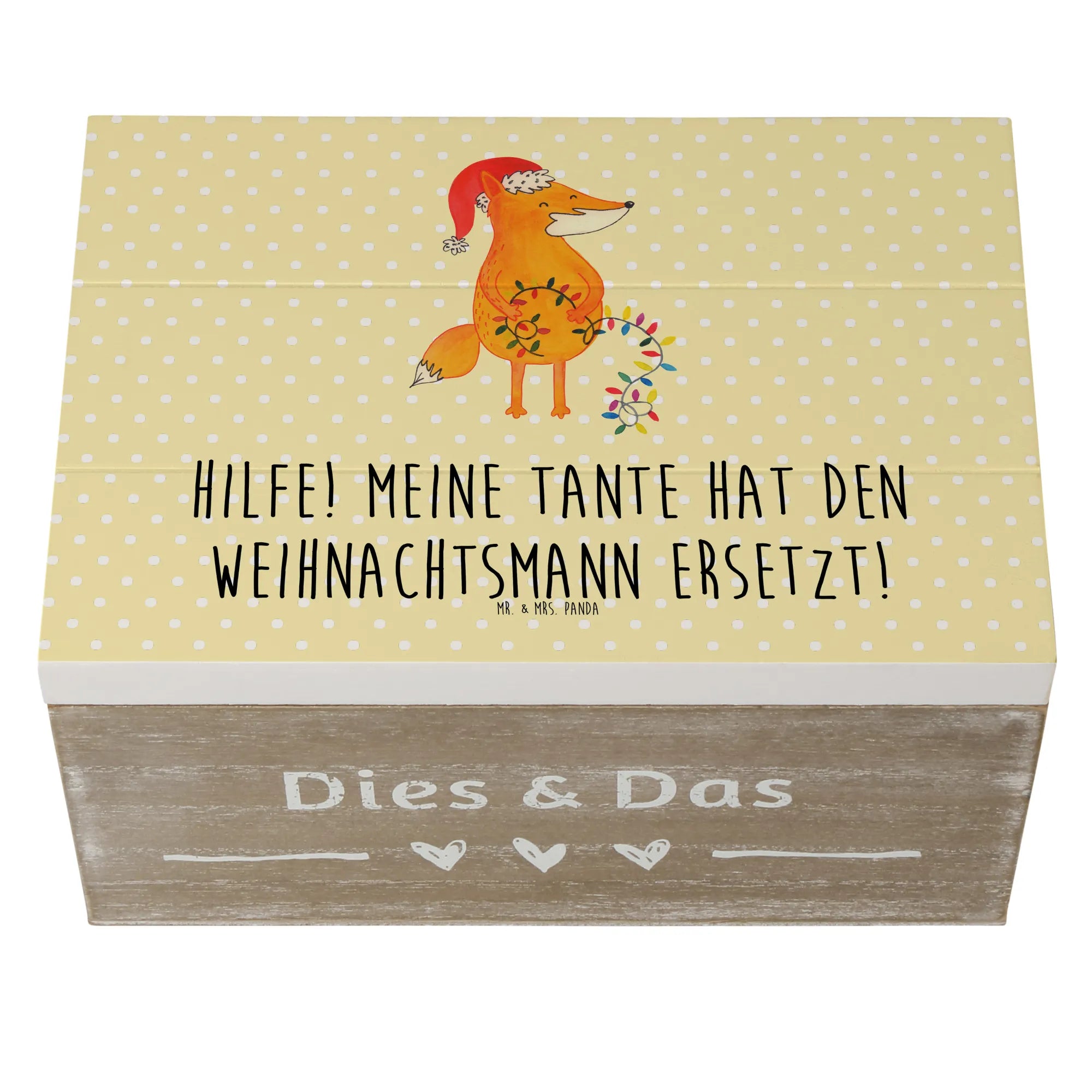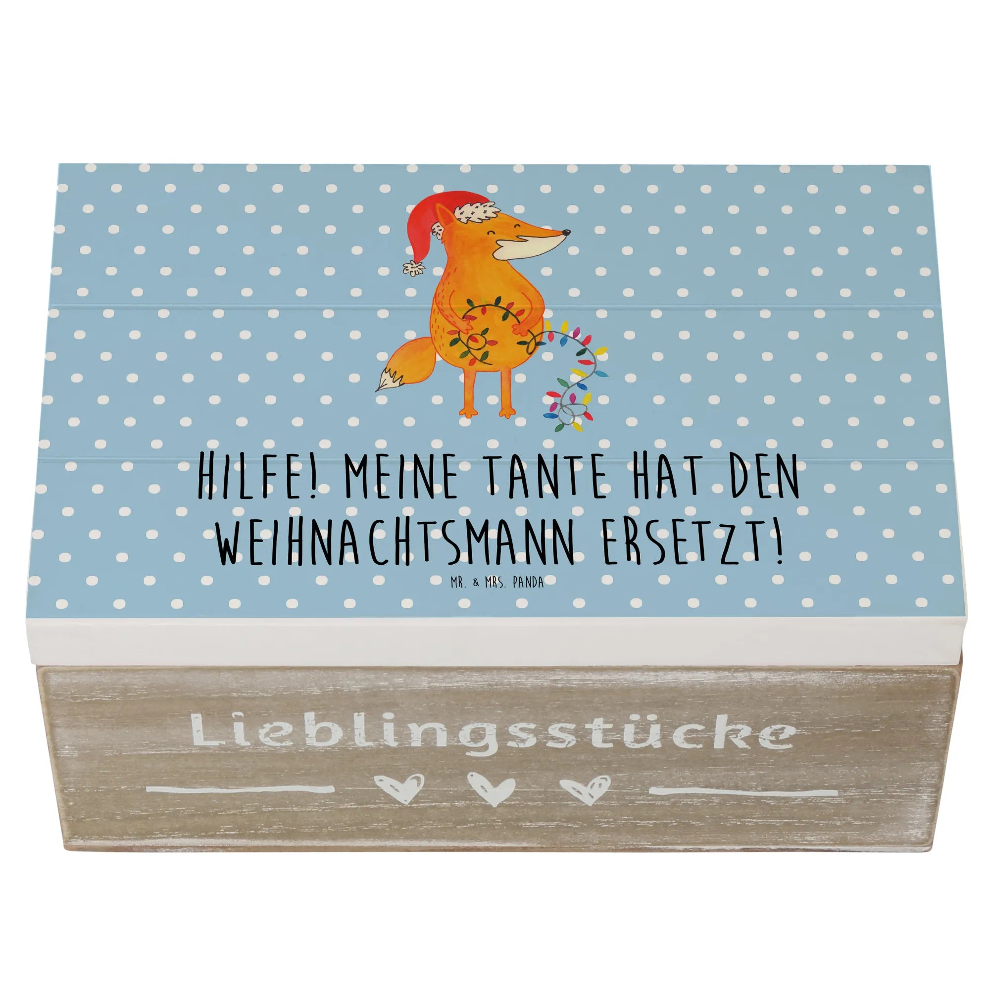 Mit einem bezaubernden Motiv und dem Spruch "Hilfe! Meine Tante hat den Weihnachtsmann ersetzt!" ist diese Kiste ein wahrer Hingucker. Sie misst 190 mm x 120 mm x 100 mm und besteht aus robuster Holzfaser, die dir lange Freude bereiten wird.