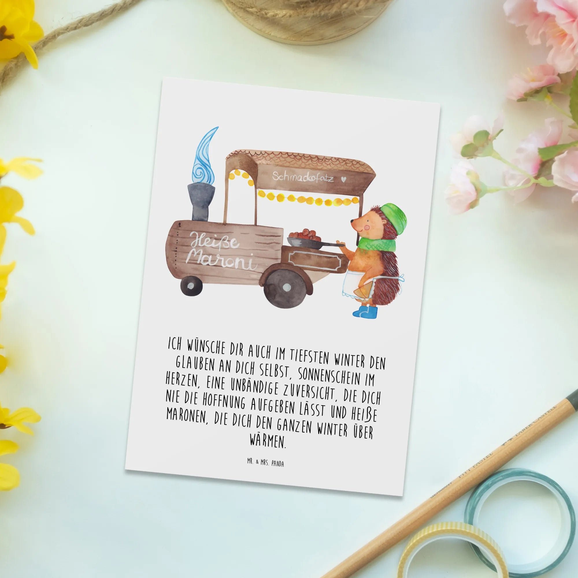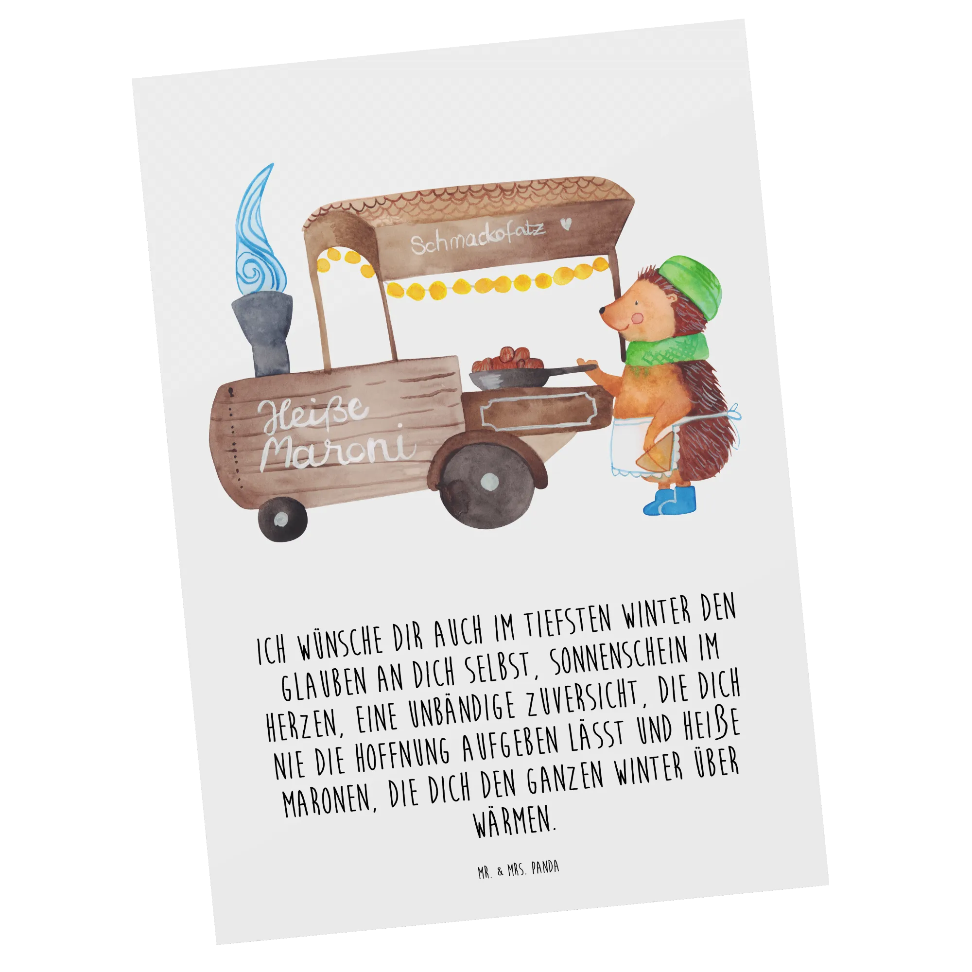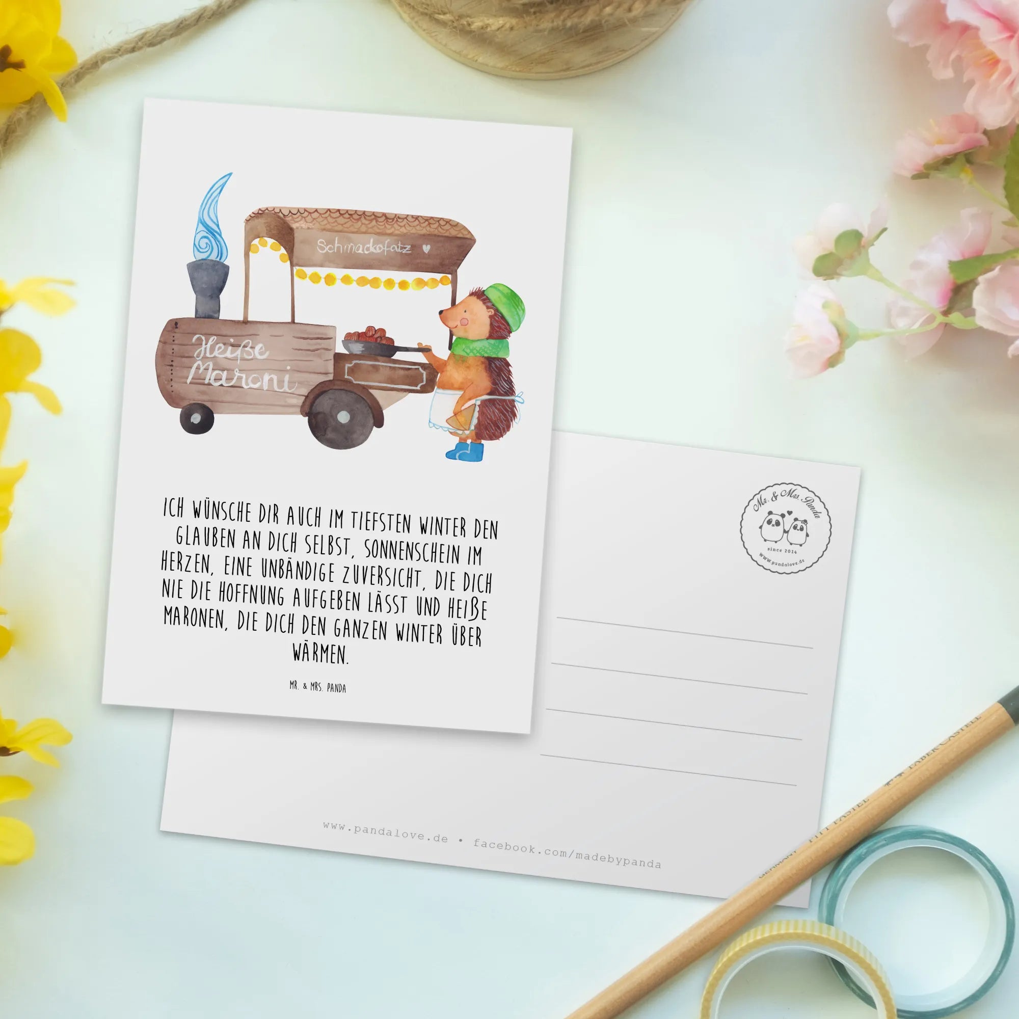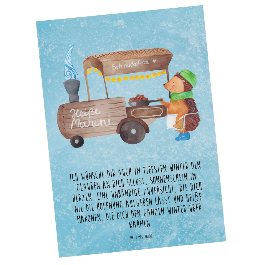 Der niedliche Igel, eingekuschelt in einem warmen Schal und mit blauen Stiefeln, steht stolz an seinem Stand und verkauft heiße Maronen. Mit dem Slogan "Ich wünsche dir auch im tiefsten Winter den Glauben an dich selbst, Sonnenschein im Herzen, eine unbändige Zuversicht, die dich nie die Hoffnung aufgeben lässt und heiße Maronen, die dich den ganzen Winter über wärmen" wird die Karte zu einem herzlichen Begleiter für viele Anlässe.
