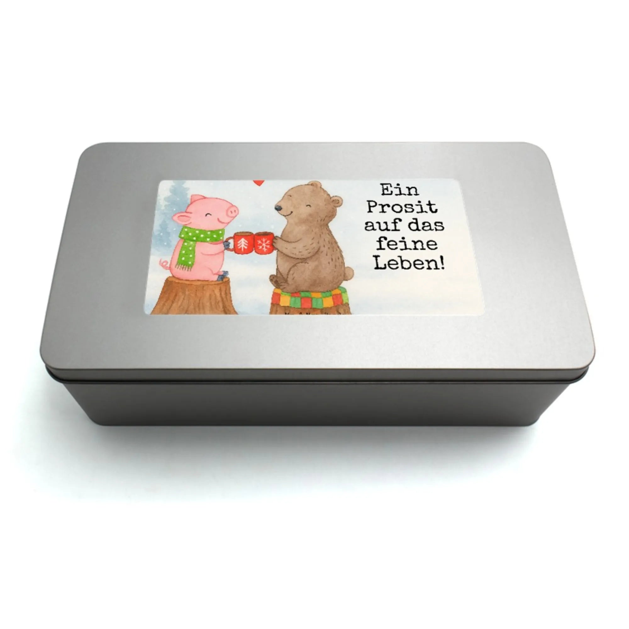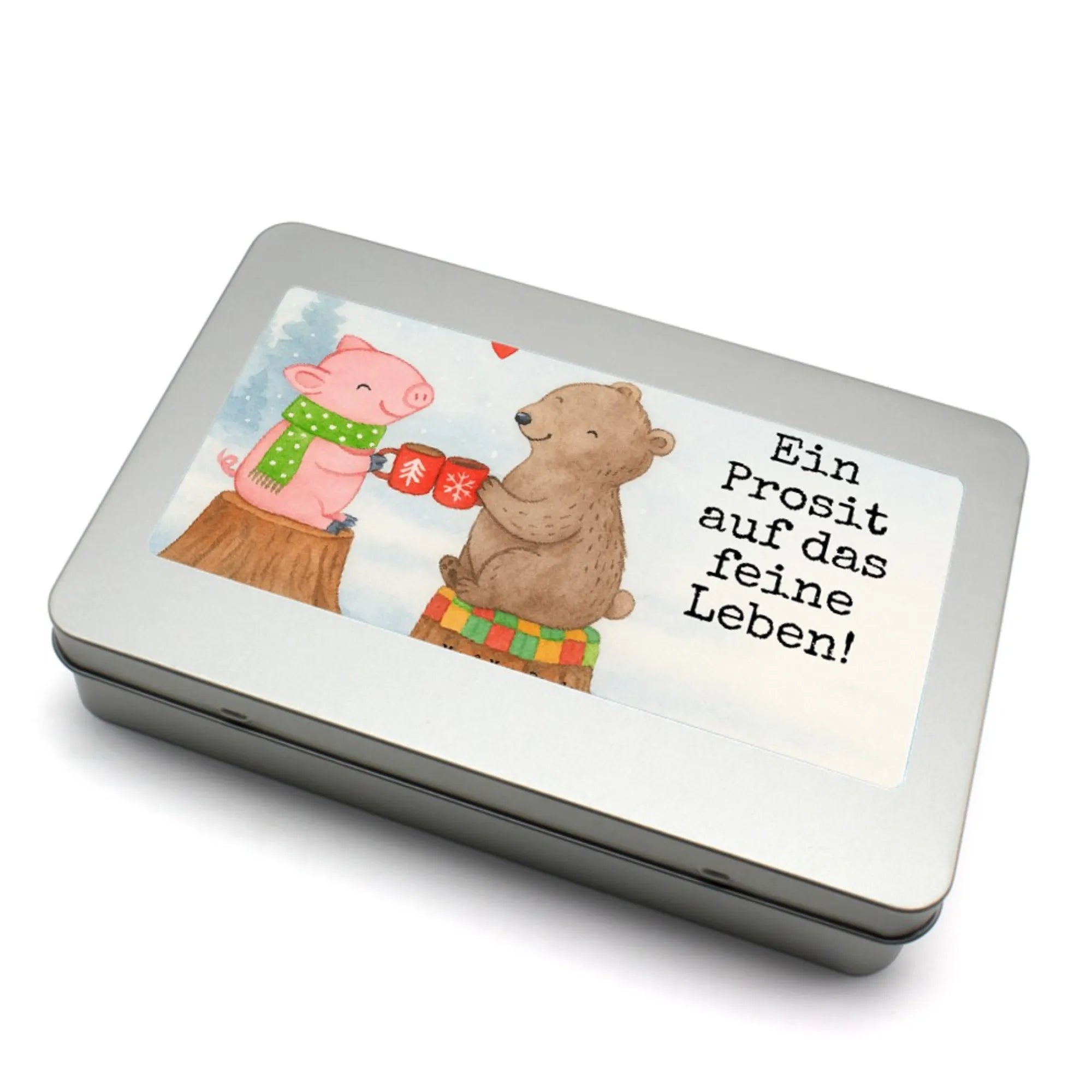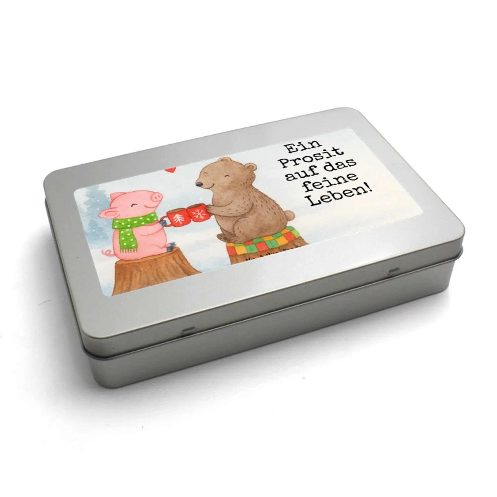 In dieser charmanten Winterlandschaft zeigen uns unser fröhliches Schweinchen und der liebevolle Bär, wie wichtig es ist, die Momente mit den Juwelen in unserem Leben zu genießen. Auf einem Baumstumpf verklärt, stoßen sie mit ihren bunten Tassen an und schicken ein süßes Herzchen in die Welt. 'Ein Prosit auf das feine Leben!' ist nicht nur ein fröhlicher Ausruf, sondern macht uns bewusst, dass wir schätzen sollen, was wir haben. Umgeben von der Magie der Weihnachtszeit laden sie dazu ein, zusammen zu sein und diese kostbaren Augenblicke mit Lachen und Freude zu füllen. Lasse die Wärme und die Freundschaft in dein Herz – genau wie sie!