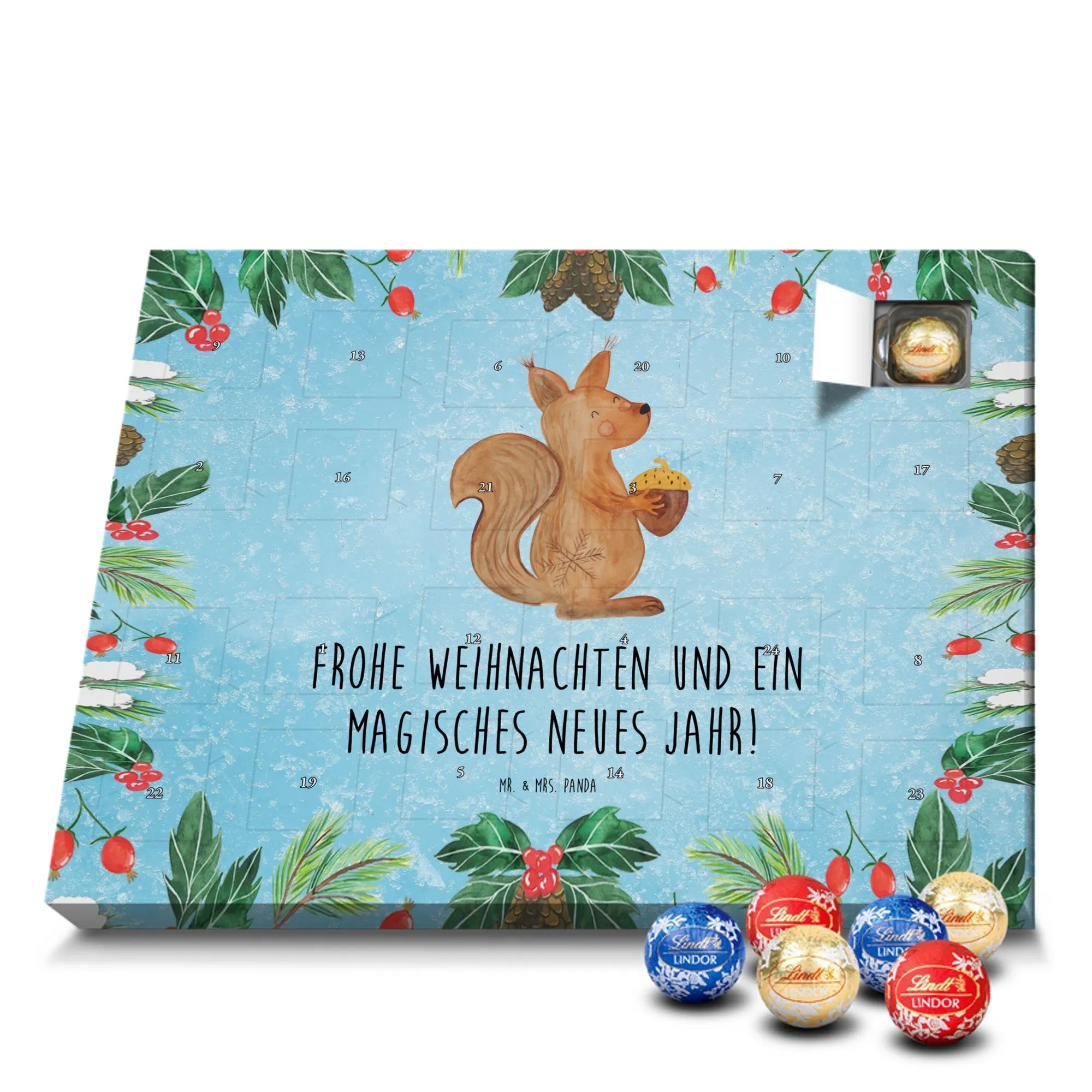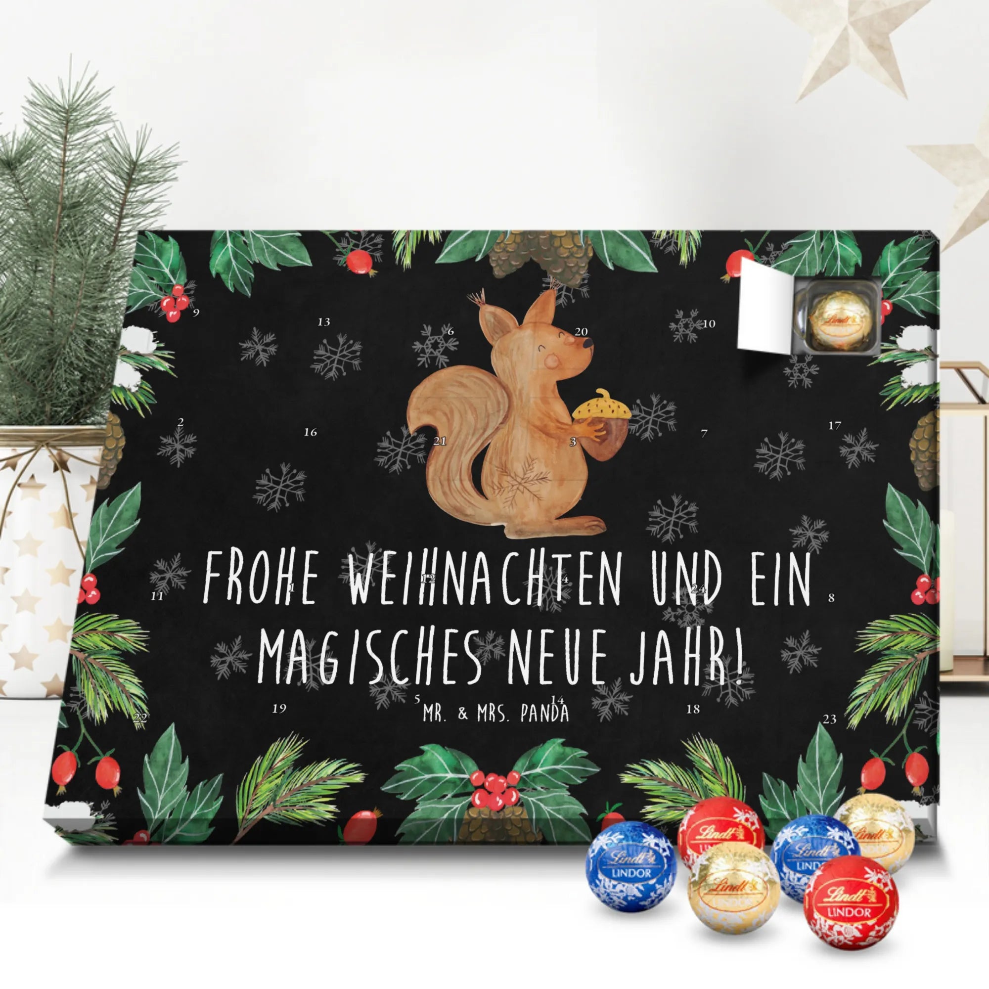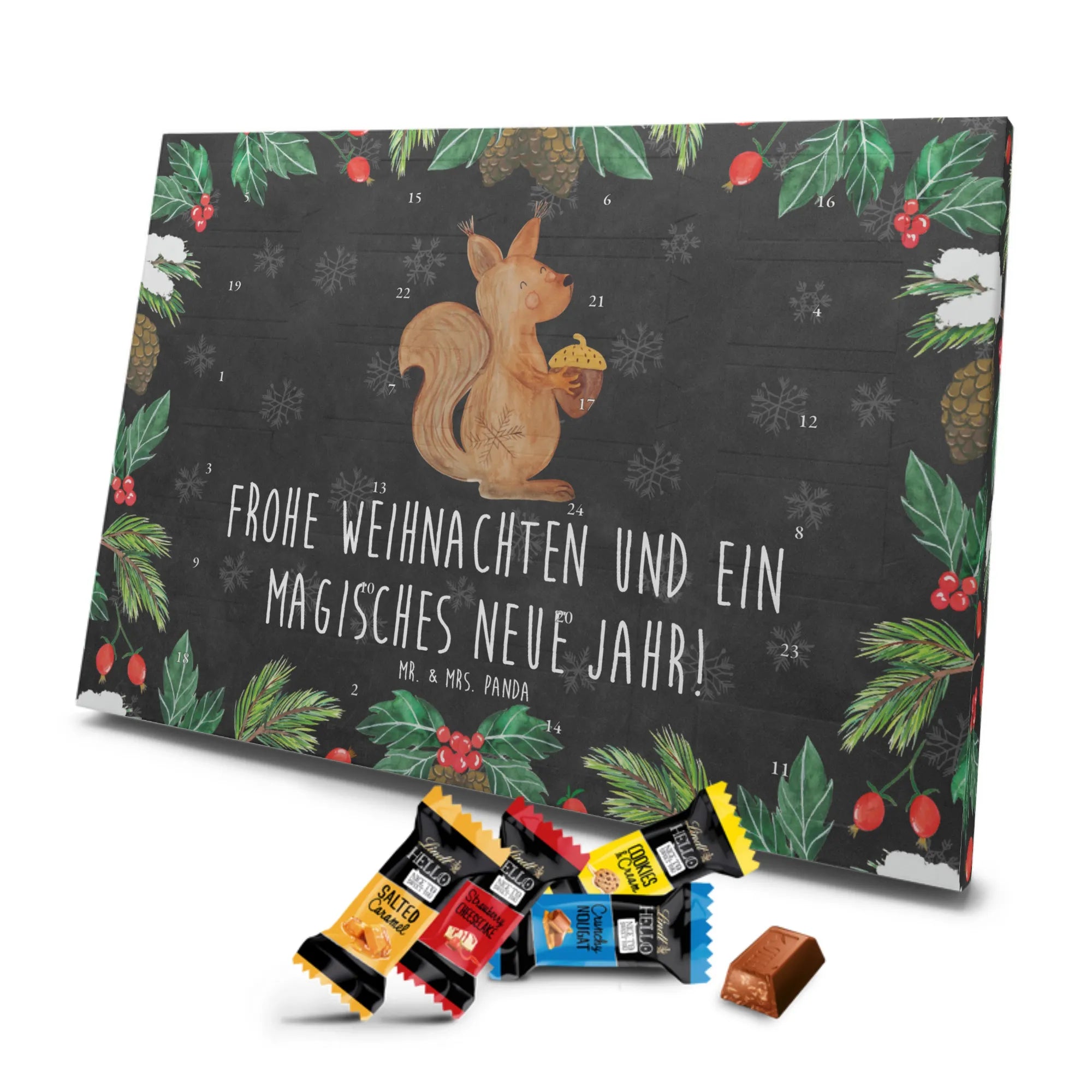 Unser zauberhafter Schoko Adventskalender von Mr. & Mrs. Panda bringt dir die süßeste Vorfreude auf Weihnachten! Dieser liebevoll gestaltete Adventskalender ist bedruckt mit wunderschönen Motiven & Sprüchen von Mr. & Mrs. Panda und ist nicht personalisierbar – dafür aber ein perfektes Geschenk für Freunde und Familie. Brillante Druckqualität mit seidenmatter Oberflächenveredelung sorgt für ein edles Finish, und die bedruckten Seitenflächen machen den Kalender von allen Seiten zu einem Hingucker. Maße: 233 mm x 178 mm x 24 mm. Besonderheit: kann aufgehängt oder aufgestellt werden, je nachdem, wie du ihn präsentieren möchtest. Gefüllt mit Lindt Lindor: 24 einzeln verpackte Markenschokoladen Kugeln in drei verschiedenen Sorten – Vollmilch, Feinherb und Weiße Schokolade – sorgen für abwechslungsreichen Genuss in der Adventszeit. Zutaten: Zucker, pflanzliches Fett (Kokosnuss, Palmkern), Kakaobutter, Vollmilchpulver, Kakaomasse, Milchzucker, Magermilchpulver, Butterreinfett, Emulgator (Sojalecithin), Gerstenmalzextrakt, Aromen. Besondere Hinweise: Kann Haselnüsse und Mandeln enthalten. Unser Schoko Adventskalender verbindet niedliches Design mit hochwertiger Füllung – ideal zum Verschenken oder selbst Naschen. Mr. & Mrs. Panda wünschen dir eine fröhliche und leckere Adventszeit!