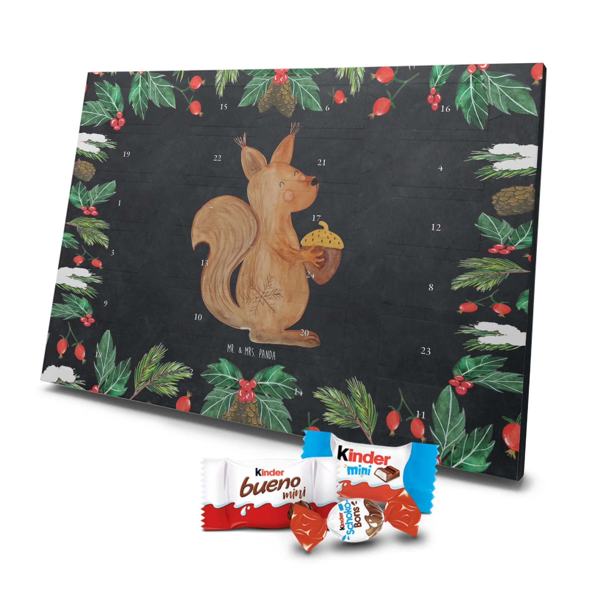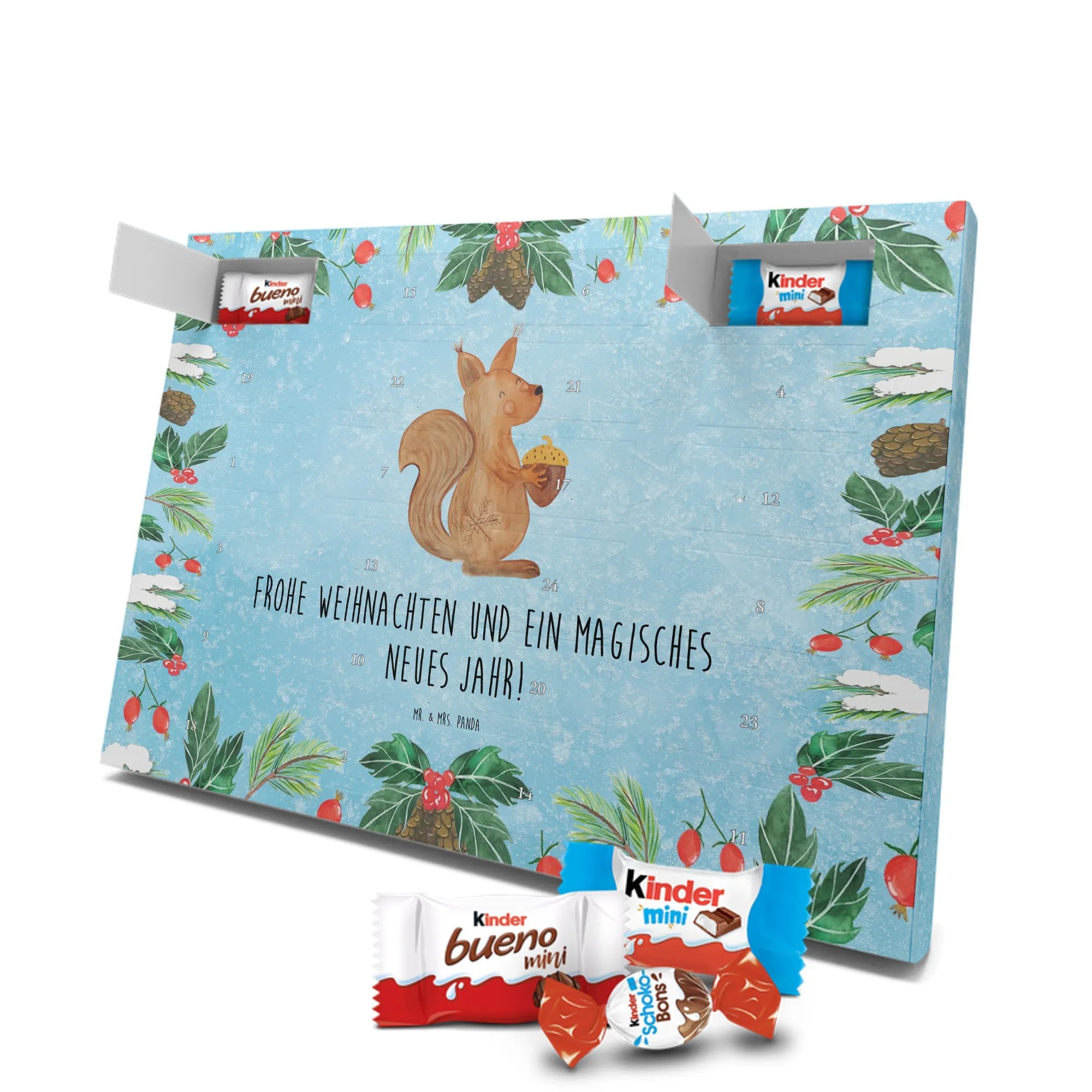 Adventskalender mit Schokolade – liebevoll gestaltet von Mr. & Mrs. Panda. Dieser niedliche Kalender ist bedruckt mit wunderschönen Motiven & Sprüchen von Mr. & Mrs. Panda und trotzdem nicht personalisierbar. Du bekommst brillante Druckqualität mit seidenmatter Oberflächenveredelung sowie bedruckte Seitenflächen, die dem Kalender ein hochwertiges Finish verleihen. Maße: 355 mm x 245 mm x 11 mm. Ein tolles Extra: kann aufgehängt oder aufgestellt werden, sodass du ihn flexibel platzieren kannst. Gefüllt mit Markenname Schokolade: Adventskalender gefüllt mit kinder® Schokolade. Inhalt: kinder® Schoko-Bons, kinder® Bueno mini und kinder® Schokolade mini. Die 24 Türchen sind liebevoll befüllt und sorgen jeden Tag für ein Lächeln – ideal für Kinder, Paare oder als kleines Geschenk für Freunde. Robust und dekorativ zugleich, bringt dieser Adventskalender süße Vorfreude in dein Zuhause. Verschenke oder genieße eine adventliche Zeit voller kleiner, schokoladiger Überraschungen!