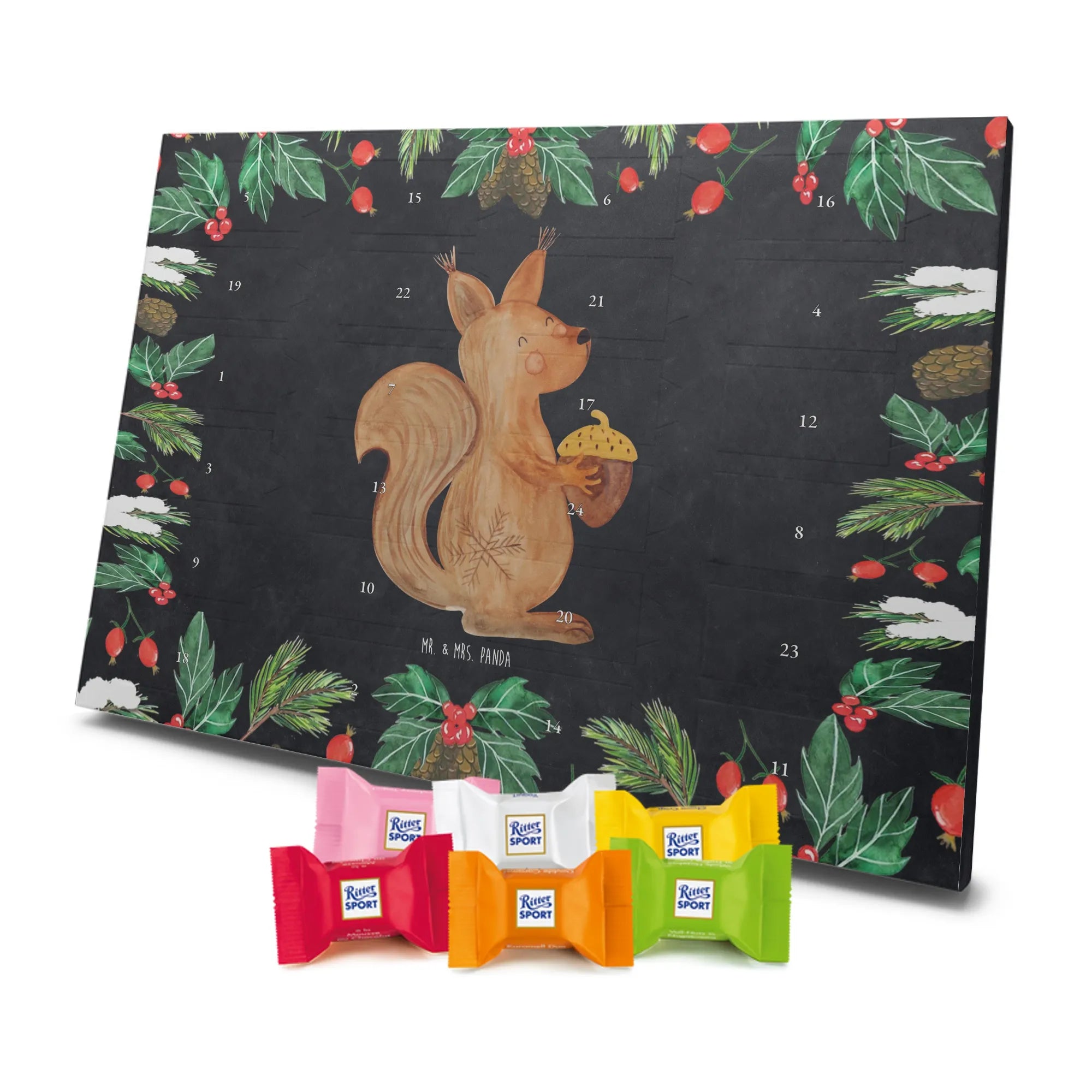 Adventskalender Schokolade von Mr. & Mrs. Panda – eine liebevolle Kombination aus hübschem Design und süßem Inhalt. Der Kalender ist bedruckt mit wunderschönen Motiven & Sprüchen von Mr. & Mrs. Panda und besticht durch brillante Druckqualität mit seidenmatter Oberflächenveredelung. Die Seitenflächen sind ebenfalls bedruckt, wodurch der Kalender rundum ein Hingucker ist. Er ist nicht personalisierbar. Maße: 325 mm x 225 mm x 27 mm. Besonders praktisch: Du kannst ihn sowohl aufgehängt als auch aufgestellt nutzen, je nachdem, wo er bei dir am schönsten wirkt. Gefüllt ist der Kalender mit Ritter Sport Schokowürfeln in verführerischen Sorten – Mousse au Chocolat, Schoko Crisp, Voll-Nuss in Nougatcreme, Karamell Duo, Joghurt und Erdbeer-Joghurt. Wichtiger Hinweis: Es handelt sich um einen Kalender gefüllt mit Ritter Sport Schokolade, nicht um einen Kalender der Marke Ritter Sport. Schenke deinen Liebsten oder dir selbst tägliche Schokoglücksmomente mit diesem charmanten Adventskalender.