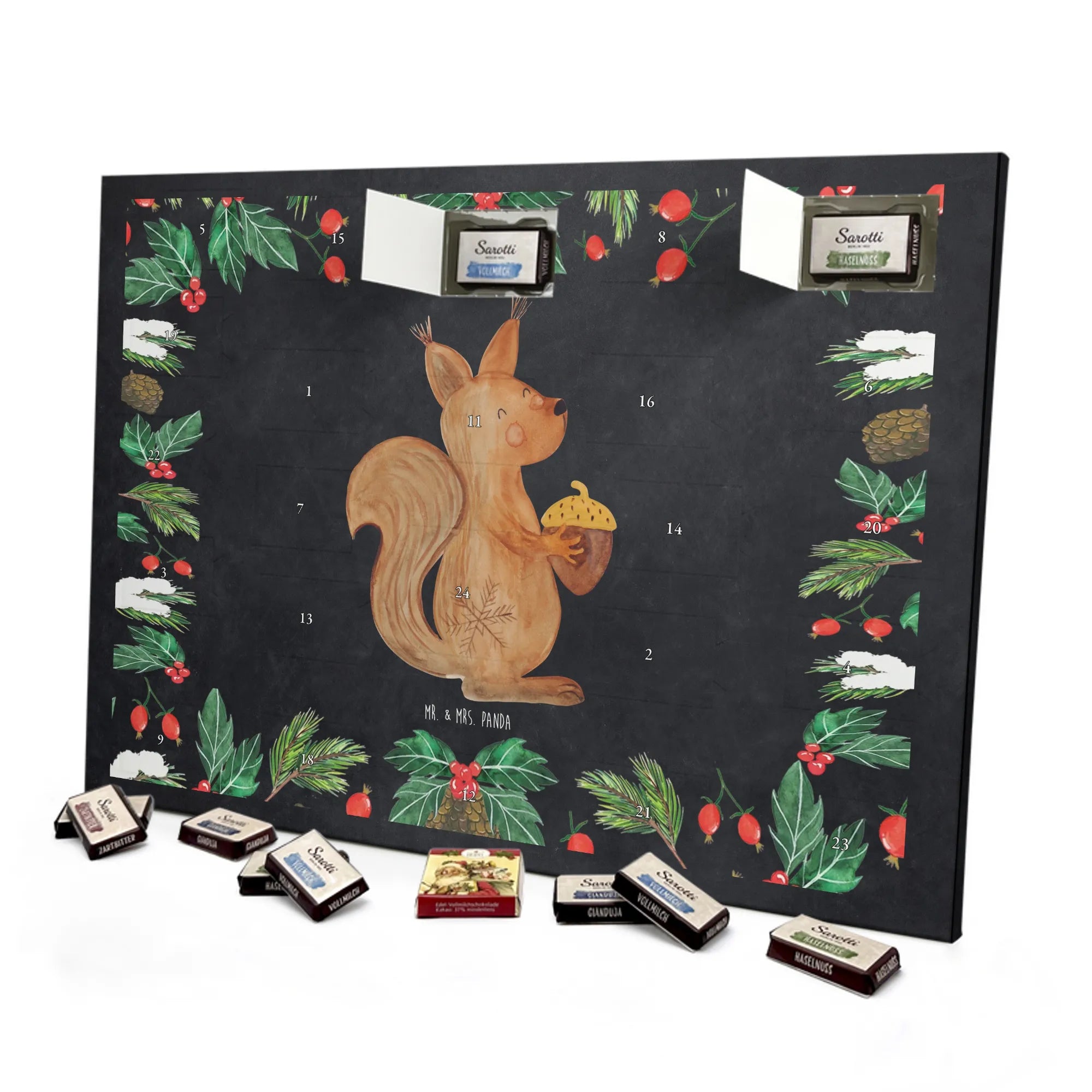 Feiere die Adventszeit mit dem liebevoll gestalteten Schoko Adventskalender von Mr. & Mrs. Panda. Mit zauberhaften Motiven und Sprüchen bedruckt, besticht der Kalender durch brillante Farben und eine seidenmatte Oberflächenveredelung. Die bedruckten Seitenflächen sorgen für ein stimmiges Gesamtbild, das sich perfekt in deine Weihnachtsdeko einfügt. Der Kalender ist nicht personalisierbar, bietet dir aber die Freiheit, ihn aufzuhängen oder aufzustellen. Hinter den Türchen findest du 24 einzeln verpackte Schokoladentäfelchen in vier beliebten Geschmacksrichtungen – Vollmilch, Nougat, Zartbitter und Haselnuss – von Sarotti® und Confiserie Heidel®. Insgesamt enthält der Kalender 107 g Markenschokolade. Maße: 355 mm x 245 mm x 11 mm – ideal dimensioniert für Regal, Tisch oder Fensterbank. Verschenke liebevolle Vorfreude und kleine Genussmomente: dieser Schoko Adventskalender vereint schönes Design mit hochwertiger Markenschokolade und ist ein tolles Mitbringsel oder Geschenk für Freunde und Familie.
