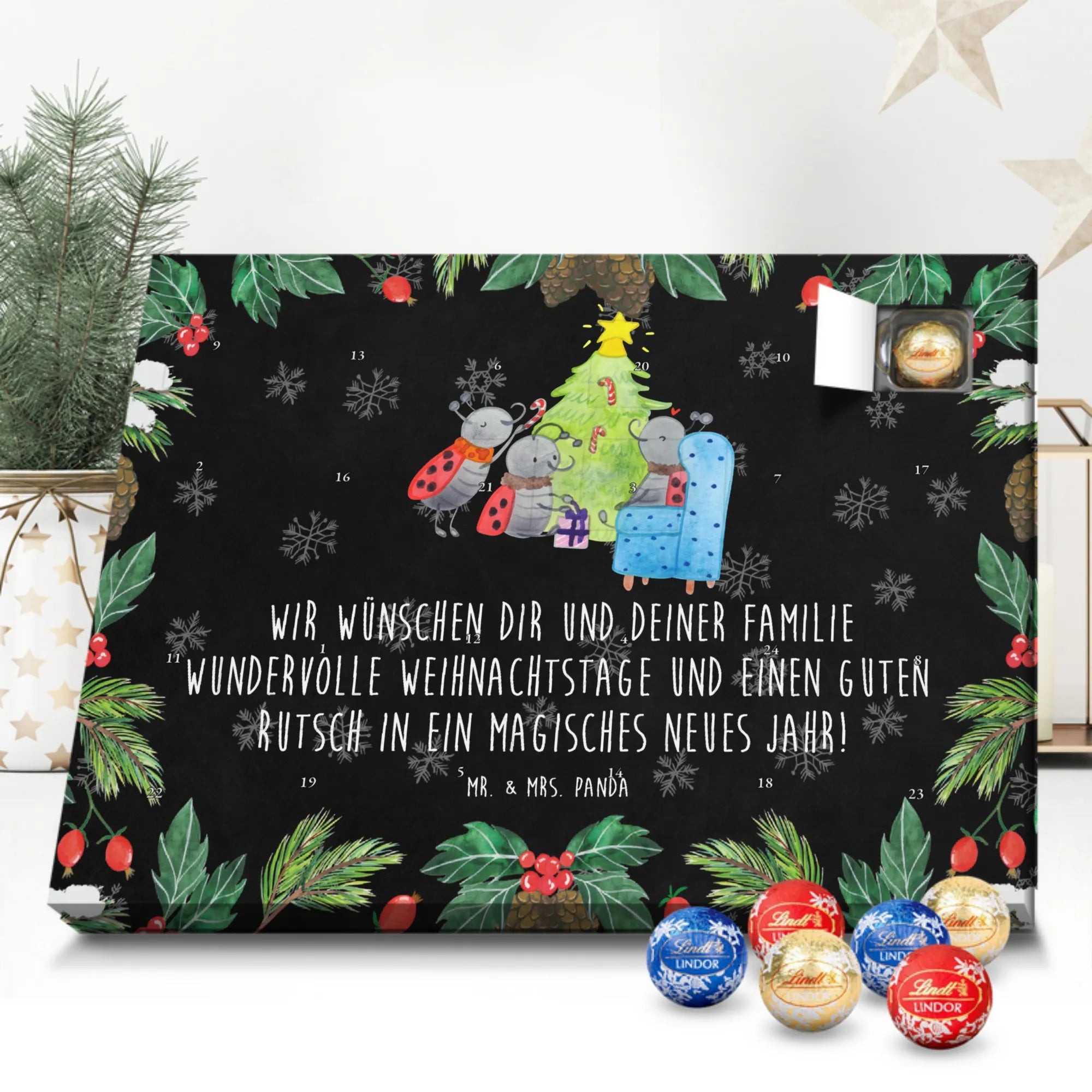 Der Schokolade Adventskalender von Mr. & Mrs. Panda ist ein liebevoll gestaltetes Highlight für deine Adventsdeko. Bedruckt mit wunderschönen Motiven & Sprüchen, nicht personalisierbar, bietet er eine charmante Optik für jeden Haushalt. Die brillante Druckqualität mit seidenmatter Oberflächenveredelung sorgt für edle Akzente, und die bedruckten Seitenflächen machen den Kalender rundum schön. Maße: 233 mm x 178 mm x 24 mm. Besonderheit: kann aufgehängt oder aufgestellt werden – richtig praktisch! Gefüllt mit Lindt Lindor: 24 einzeln verpackte Markenschokoladen Kugeln in drei köstlichen Varianten – Vollmilch, Feinherb und Weiße Schokolade – sorgen für tägliche Freuden. Zutaten: Zucker, pflanzliches Fett (Kokosnuss, Palmkern), Kakaobutter, Vollmilchpulver, Kakaomasse, Milchzucker, Magermilchpulver, Butterreinfett, Emulgator (Sojalecithin), Gerstenmalzextrakt, Aromen. Besondere Hinweise: Kann Haselnüsse und Mandeln enthalten. Ob als Geschenk oder für dich selbst – dieser Kalender ist eine wunderbare Mischung aus Design und feiner Markenschokolade.