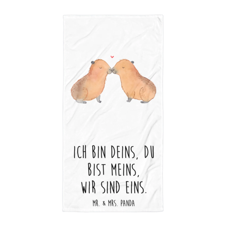 Das XL Badehandtuch Capybara Liebe aus der Small World Kollektion von Mr. & Mrs. Panda ist das perfekte Geschenk für alle, die Romantik und Tierliebe verbinden möchten. Mit einem liebevoll handgezeichneten Motiv zweier sich küssender Capybaras, das die Zuneigung und Verbundenheit in einer Beziehung symbolisiert, zaubert es jedem Beschenkten ein Lächeln ins Gesicht. Ideal für Paare an Valentinstag, Jahrestagen oder einfach als kleiner Liebesbeweis zwischendurch. Der süße Slogan "Ich bin deins, du bist meins, wir sind eins" bringt die Gefühle perfekt zum Ausdruck und eignet sich hervorragend als romantisches Geschenk.