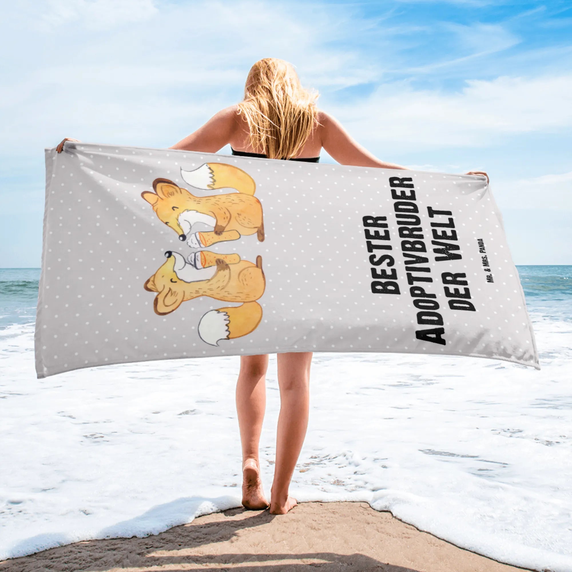Das XL Badehandtuch mit dem süßen Motiv "Fuchs Bester Adoptivbruder der Welt" von Mr. & Mrs. Panda ist das perfekte Geschenk für all die besonderen Momente im Leben. Ob zum Geburtstag, als Dankeschön oder einfach nur so – dieses Handtuch zaubert jedem ein smile ins Gesicht. Die süßen Füchse, die stolz mit einem Bier anstoßen, verkörpern die Liebe und Wertschätzung, die man für seinen Adoptivbruder empfindet.