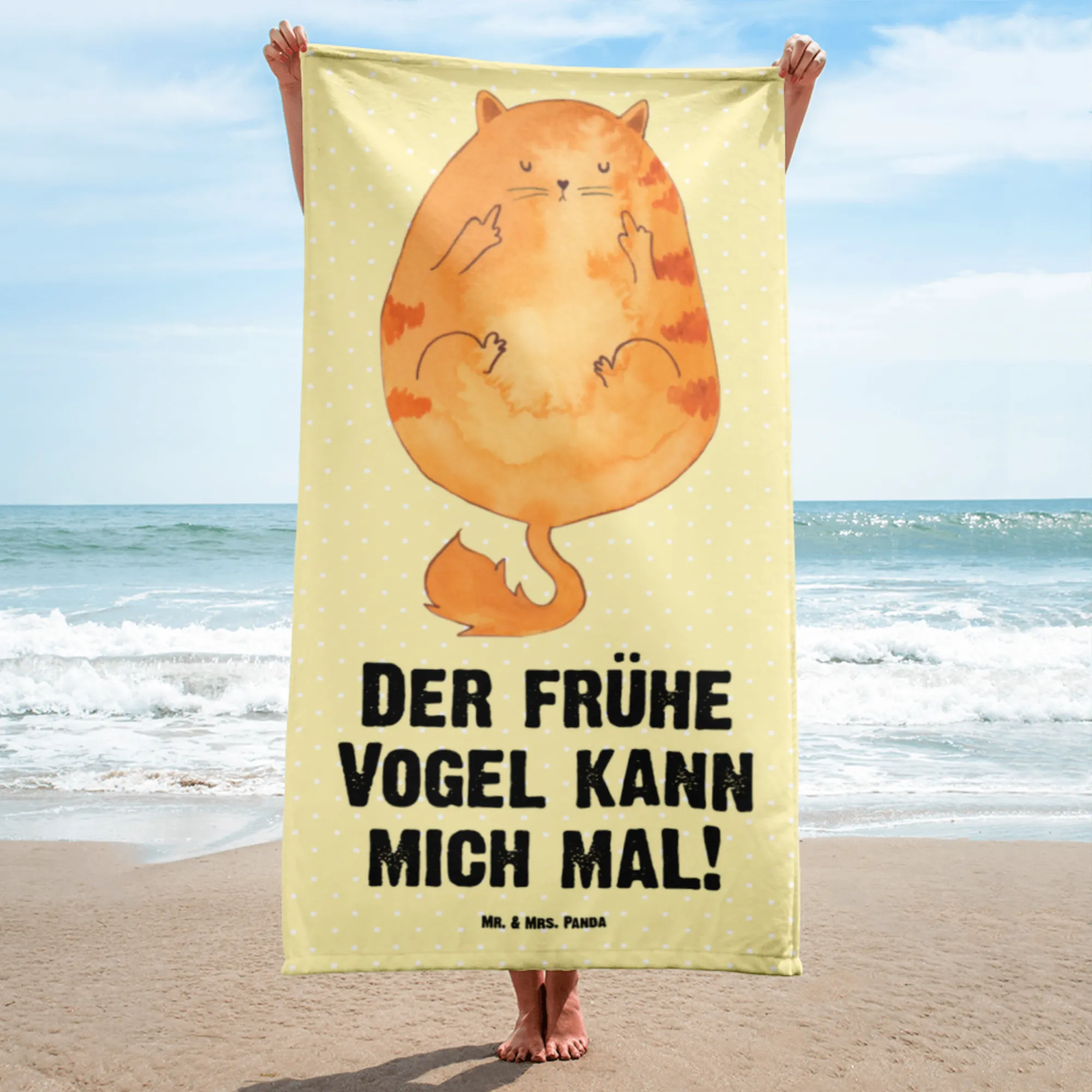 Dieses extra große Handtuch kombiniert praktischen Nutzen mit einem herzhaften Augenzwinkern: Die niedliche, handgezeichnete Katze zeigt ihren Mittelfinger und der Spruch „Der frühe Vogel kann mich mal!“ ist der perfekte Begleiter für alle, die lieber länger im Bett bleiben. Das Design stammt aus unserer liebevollen Katzen - Kollektion und wurde mit viel Liebe von Mrs. Panda entworfen.