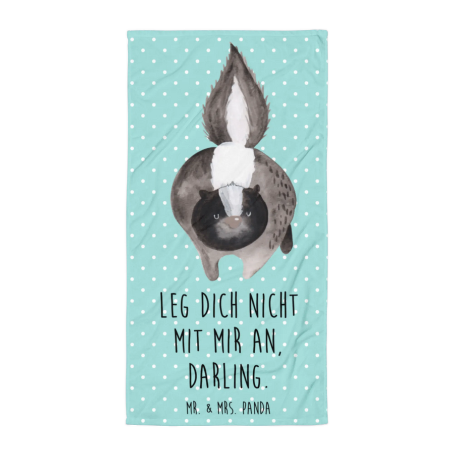Das XL Badehandtuch "Stinktier Angriff" aus der Stinktier-Kollektion von Mr. & Mrs. Panda ist das perfekte Geschenk für alle, die das Besondere lieben! Mit einem liebevoll handgezeichneten Motiv eines süßen Stinktiers, das sich bedrohlich aufbaut, und dem frechen Spruch "Leg dich nicht mit mir an, Darling!" ist dieses Handtuch nicht nur ein praktischer Begleiter für Strand, Schwimmbad oder Sauna, sondern auch ein echter Hingucker!