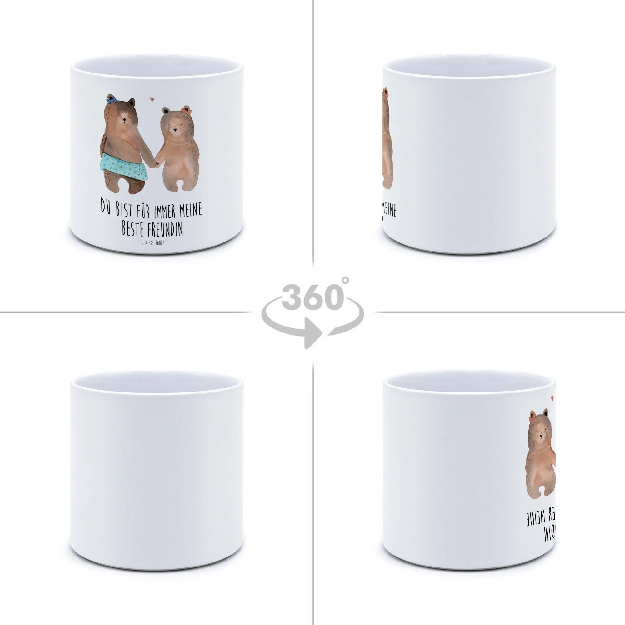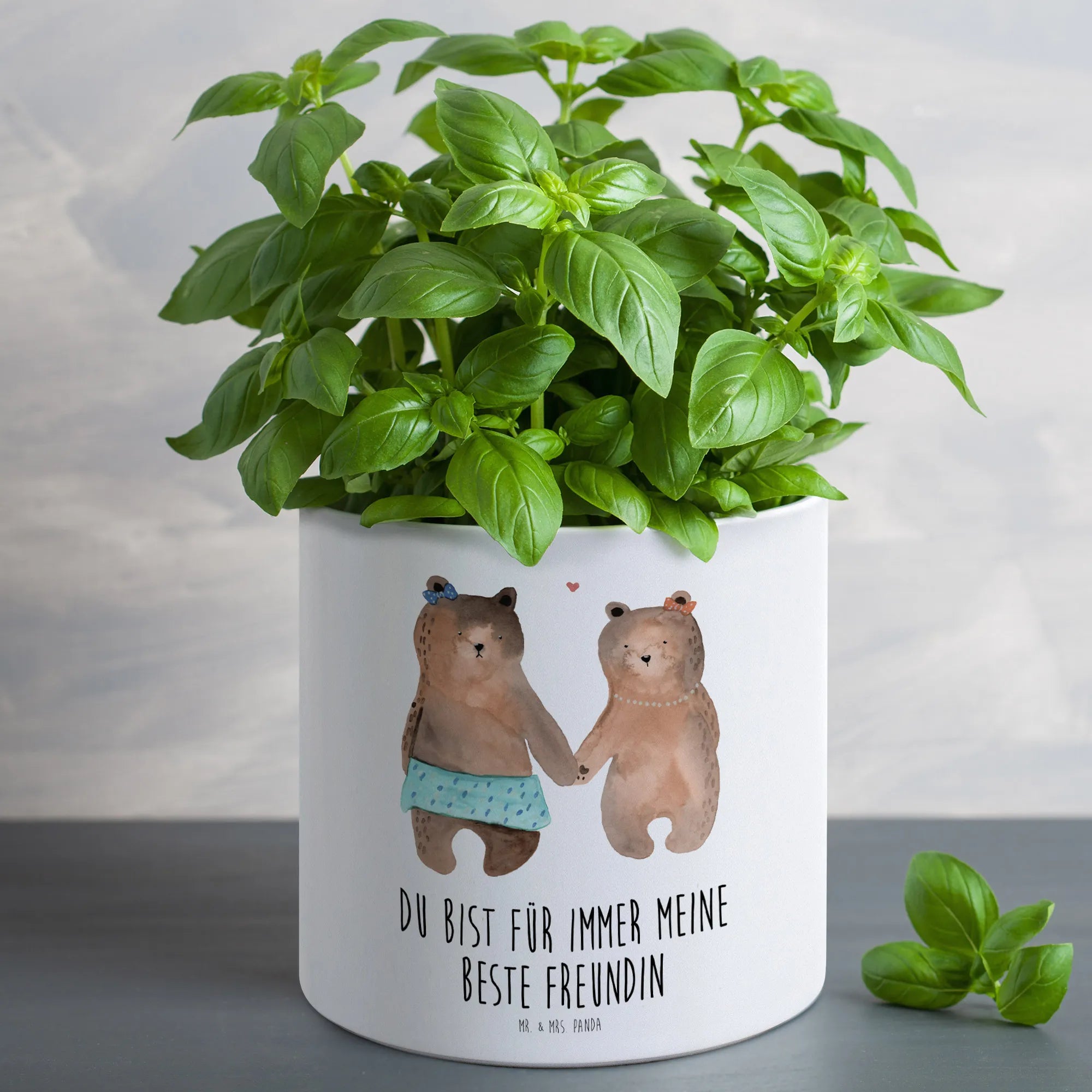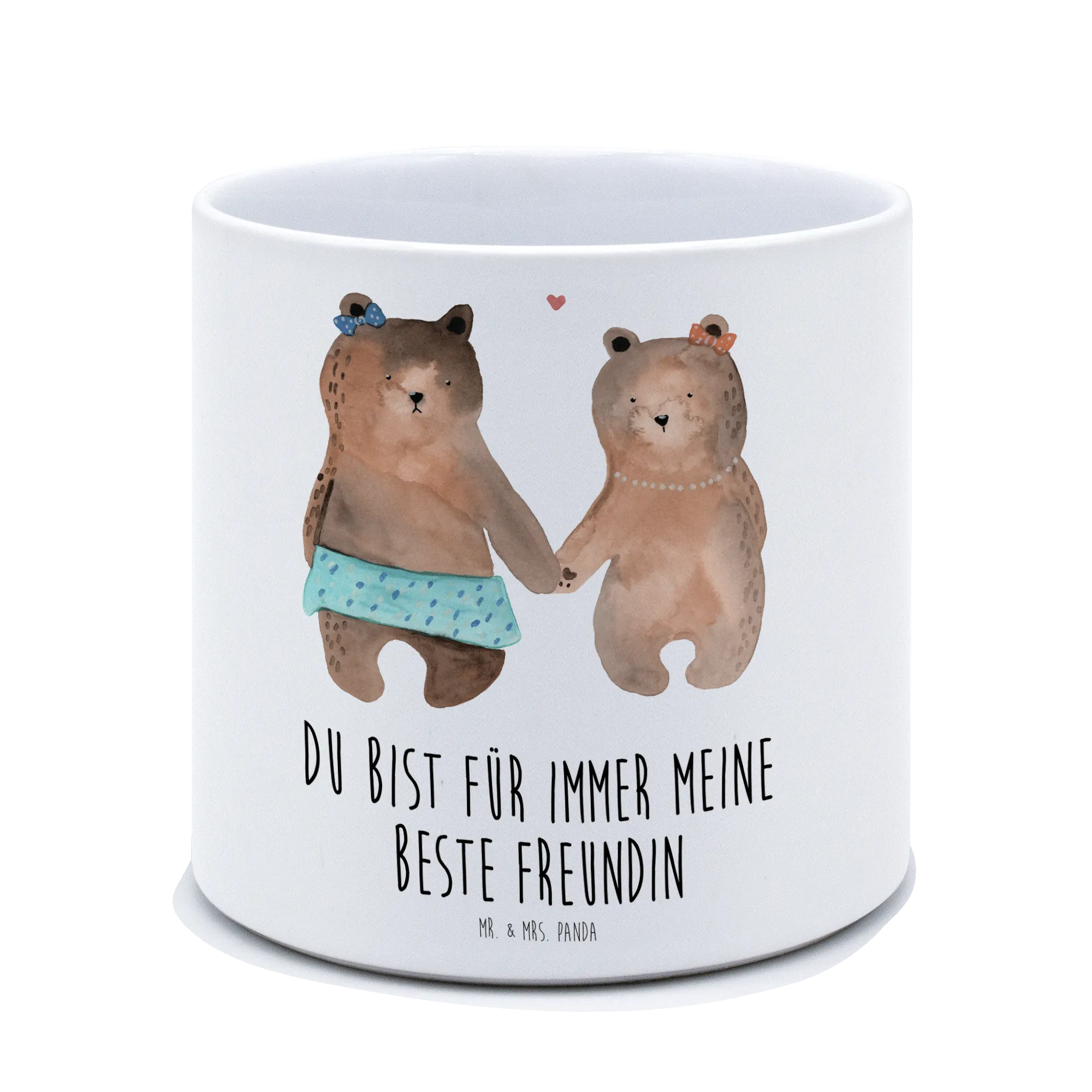 Entdecke den zauberhaften XL Blumentopf Bär Freundin von Mr. & Mrs. Panda – das perfekte Geschenk für deine beste Freundin! Mit einem charmanten Motiv von zwei süßen Bärenmädchen, die sich an den Händen halten, wird dieser Pflanztopf nicht nur zur Deko für den Balkon, die Terrasse oder das Kinderzimmer, sondern auch zu einem liebevollen Liebesbeweis.